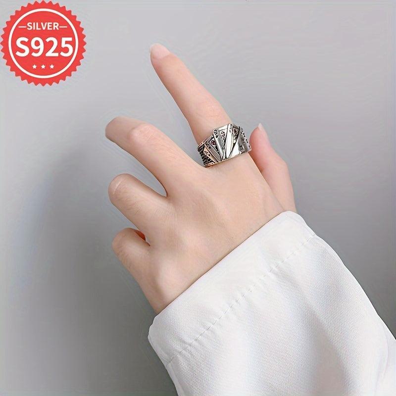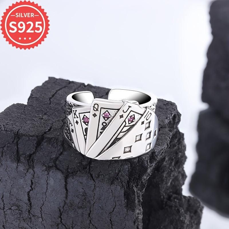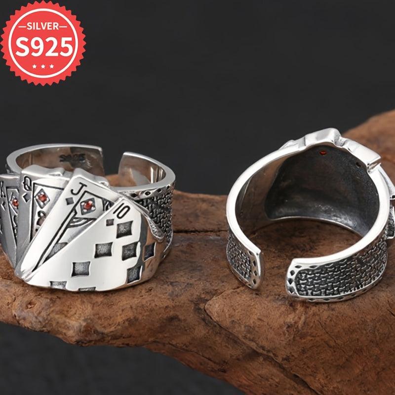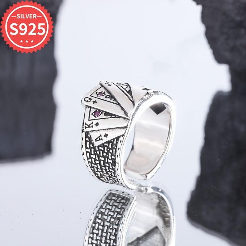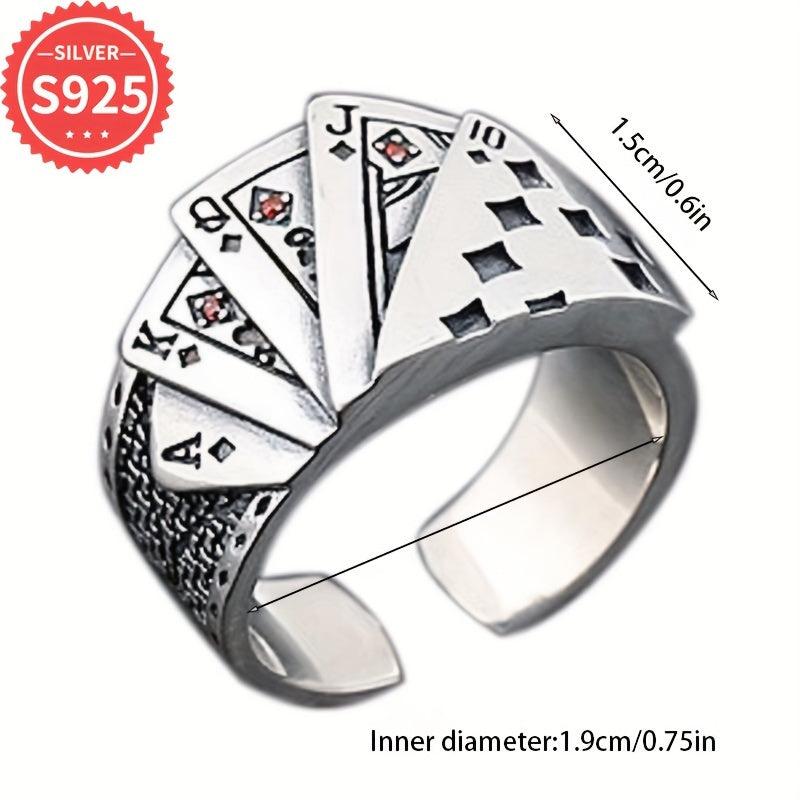This vintage poker ring is made of 925 sterling silver and is hypoallergenic. The open band design allows for easy adjustment to fit any finger size. It weighs 4.7g, making it lightweight and comfortable to wear.
