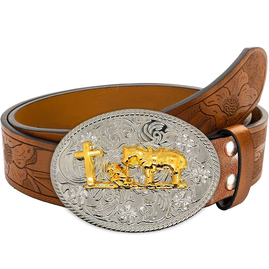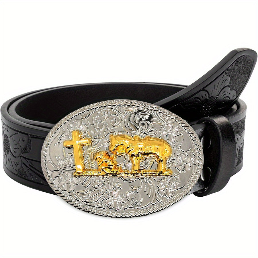 Add a touch of wild west charm to your outfit with this vintage embossed floral belt featuring a bull head buckle. Made of faux leather, this belt is perfect for adding a cowboy flair to your look.
