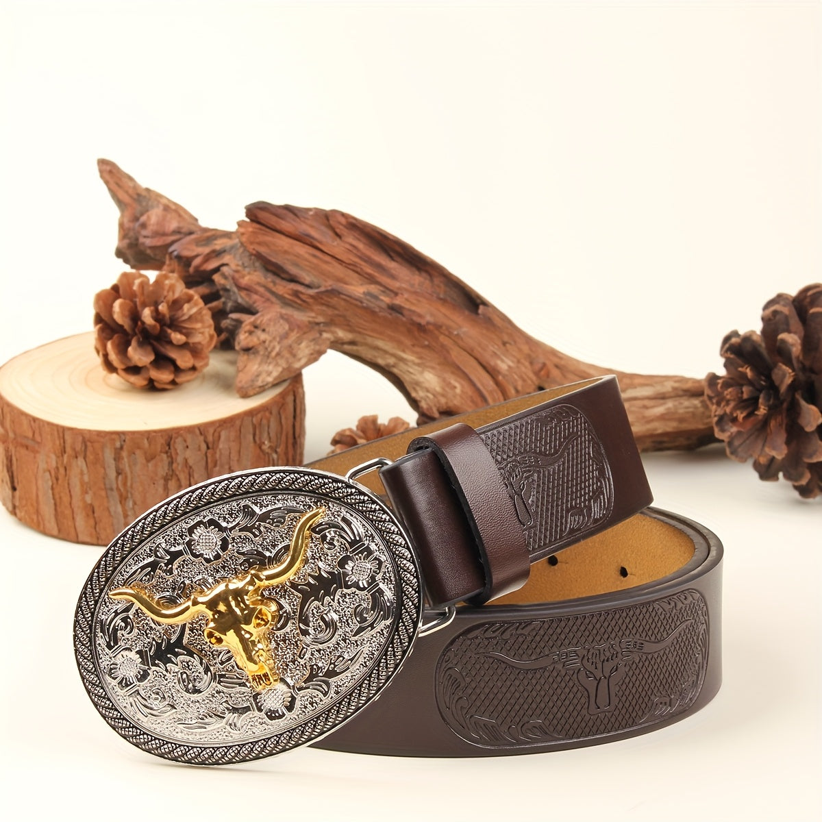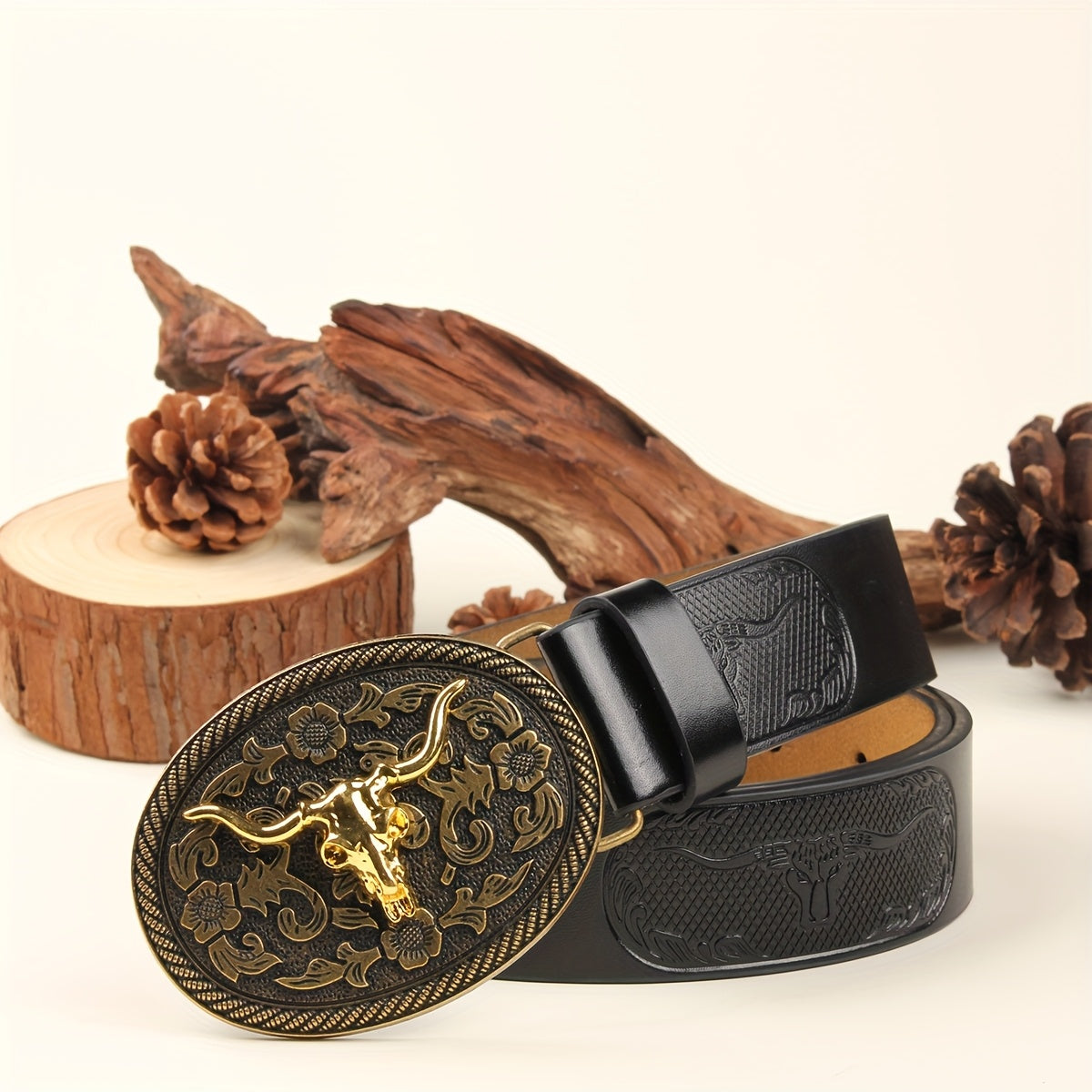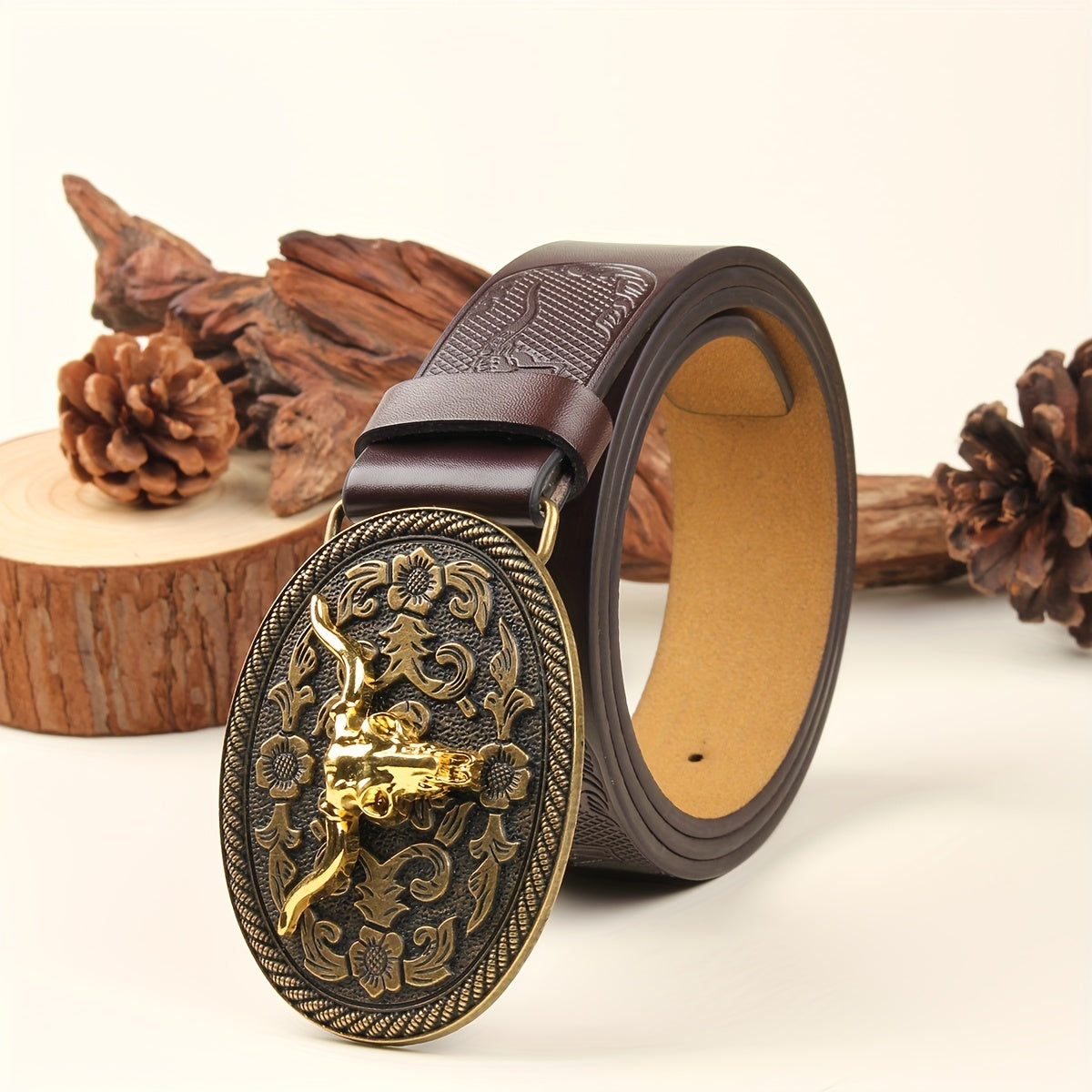 Elevate your western style with this cowboy belt featuring a floral print buckle and faux leather construction. The oval bull head accessory adds a unique touch for both men and women.