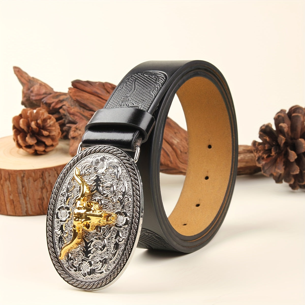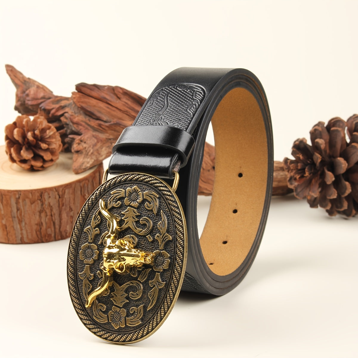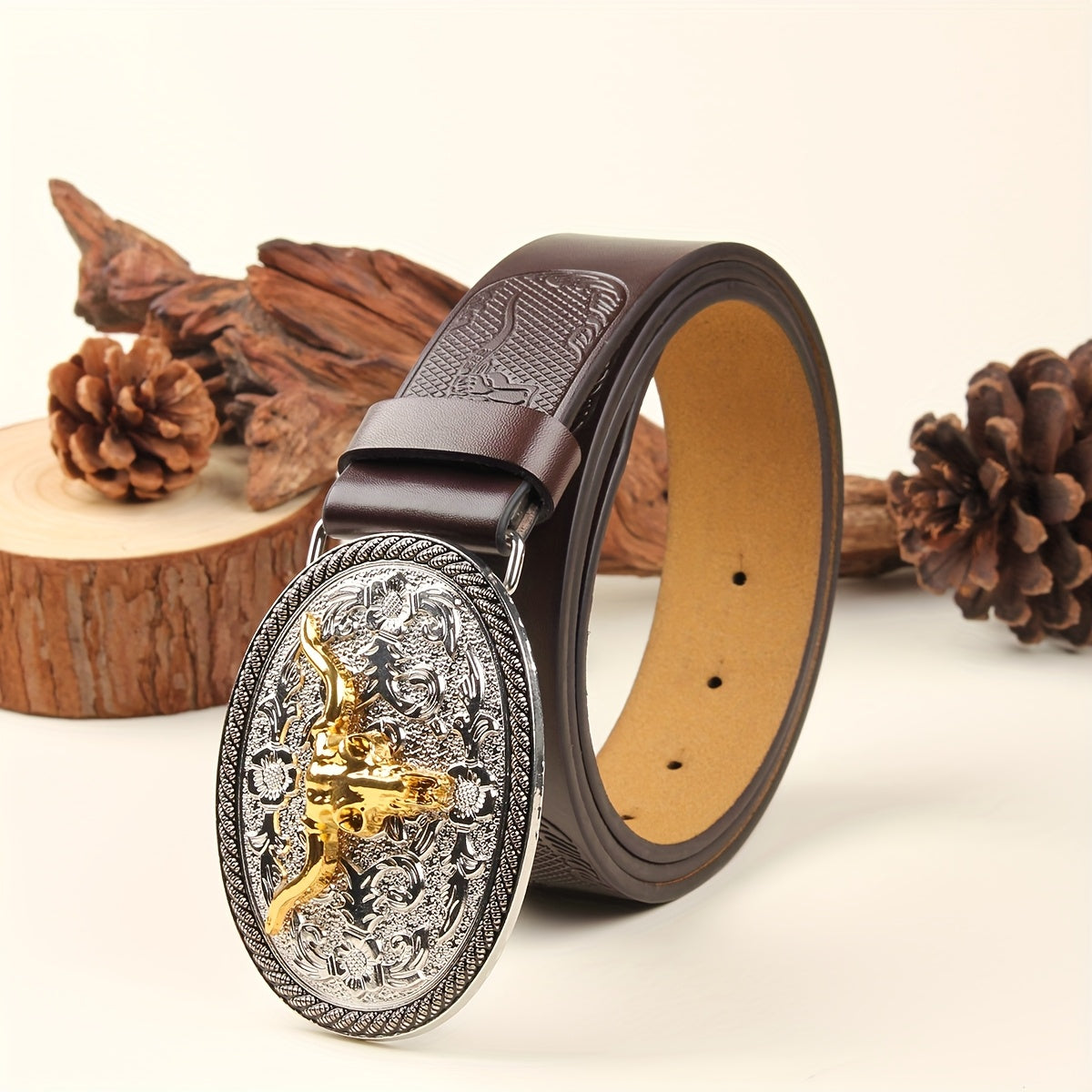 Elevate your western style with this cowboy belt featuring a floral print buckle and faux leather construction. The oval bull head accessory adds a unique touch for both men and women.