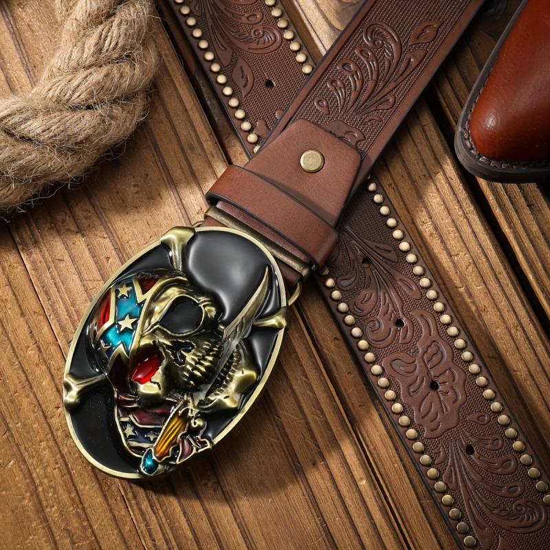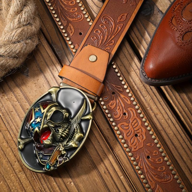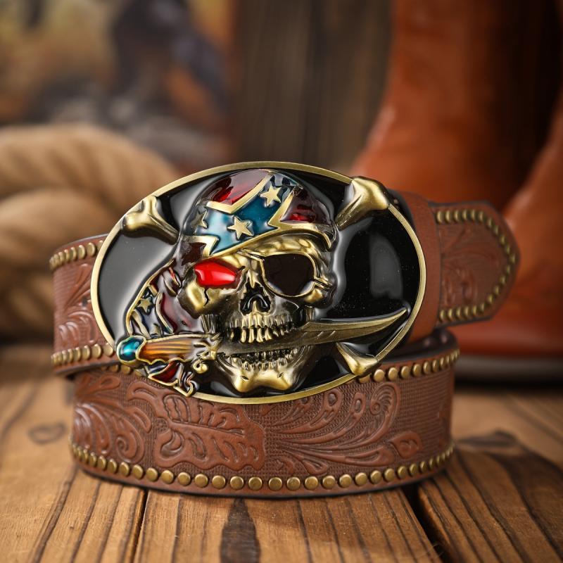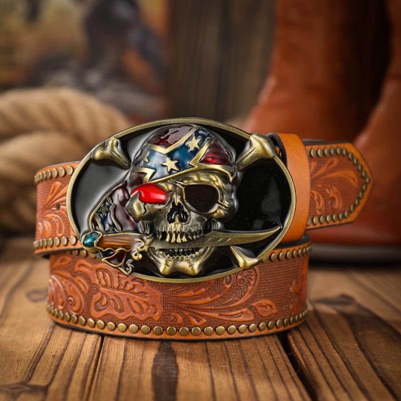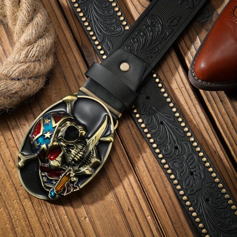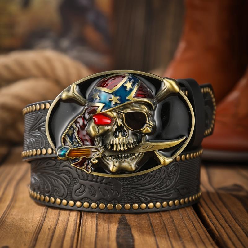 Add a touch of rugged Western cowboy style to your outfit with this pirate skull shaped panel buckle belt. The alloy rivet and embossed design give it a unique and edgy look.