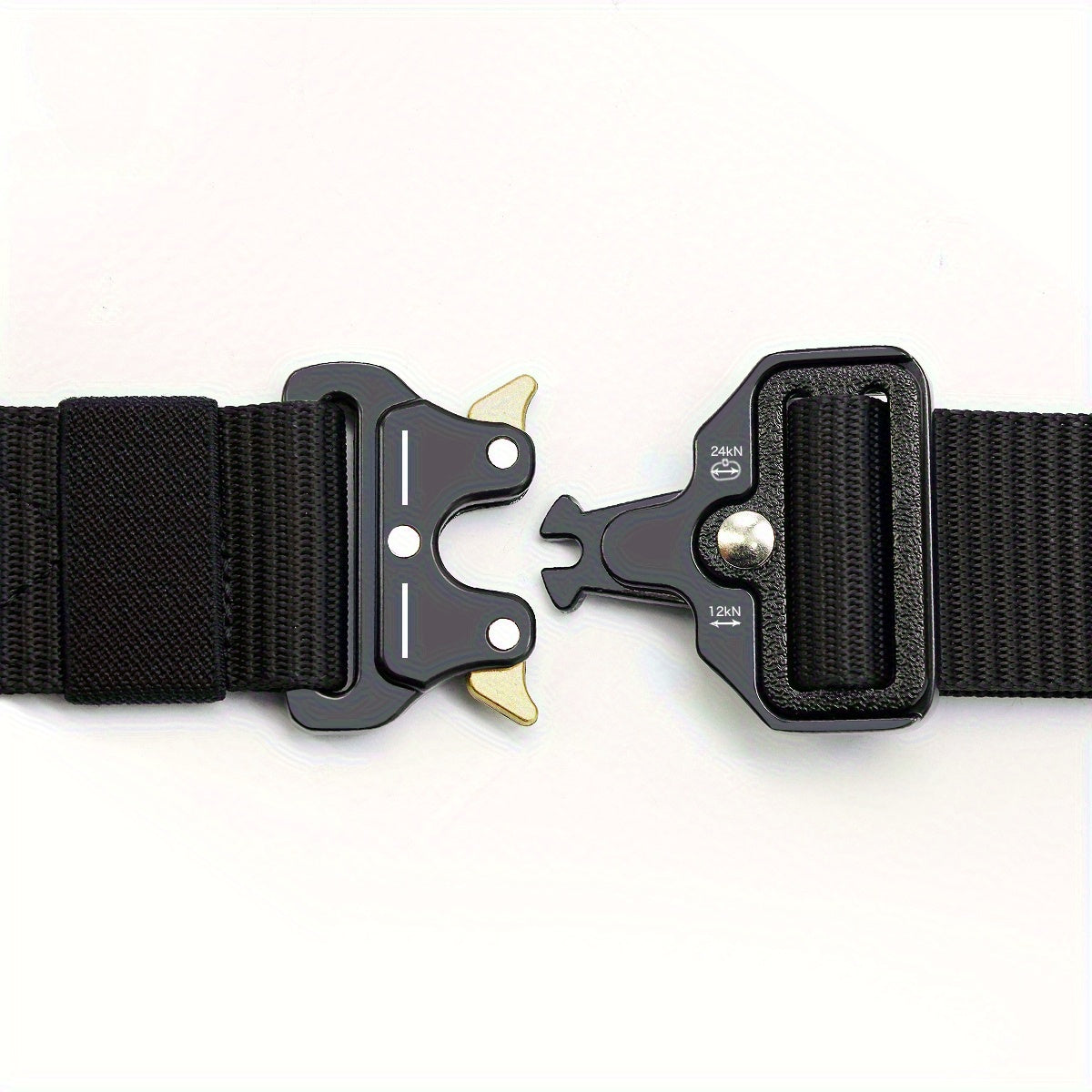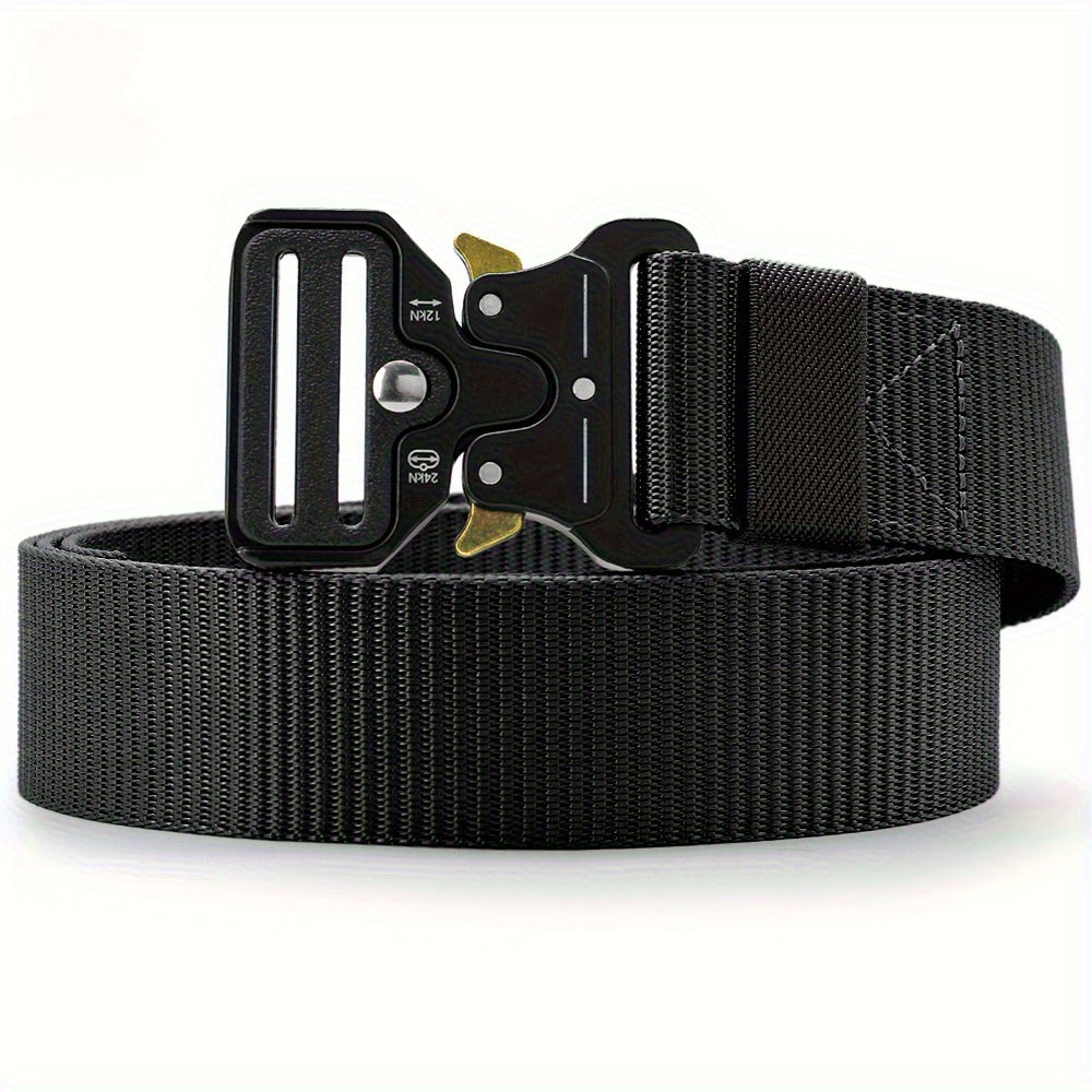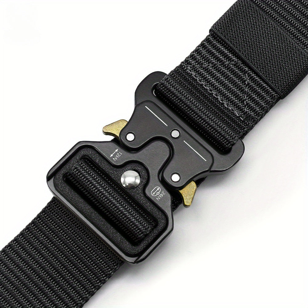 This men's belt is made of heavy-duty canvas material with a quick-release metal buckle, perfect for military or outdoor use.