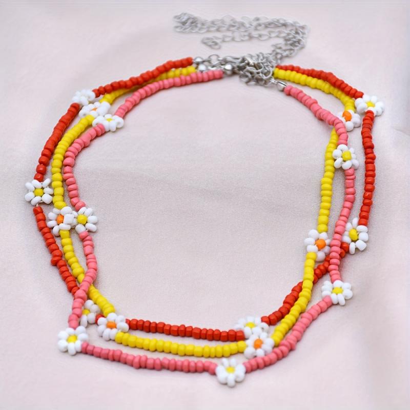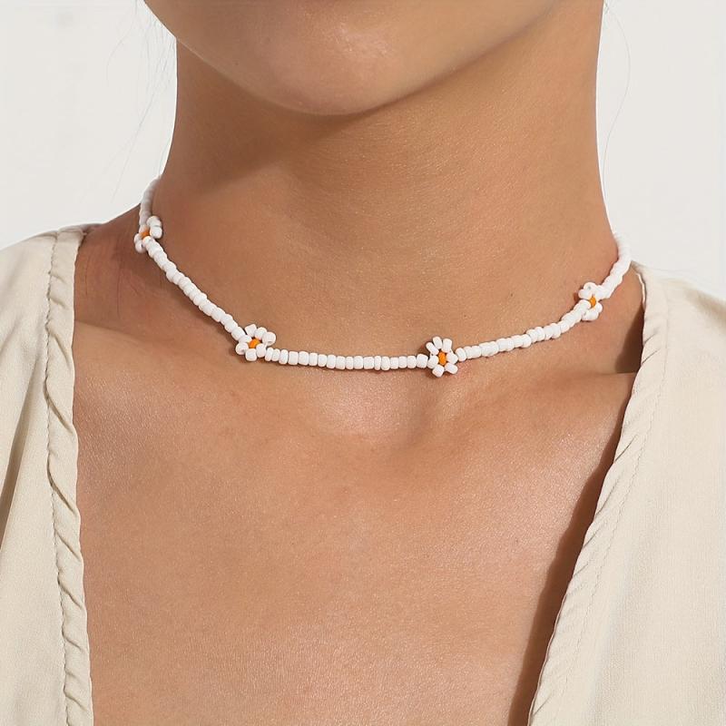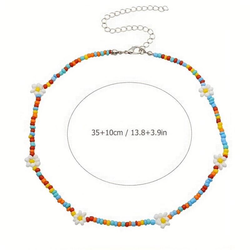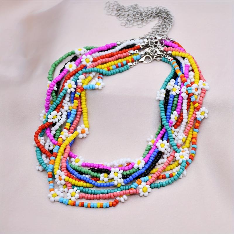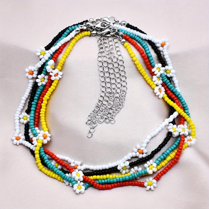 Elevate your summer look with these boho beaded choker necklaces featuring colorful floral beads. Lightweight and stylish, they add a touch of whimsy to any outfit.