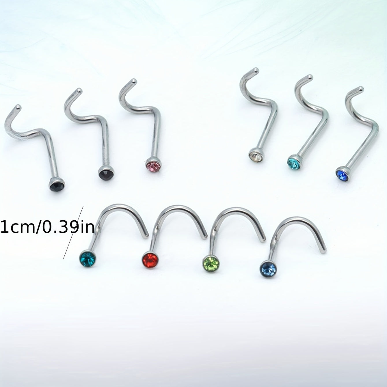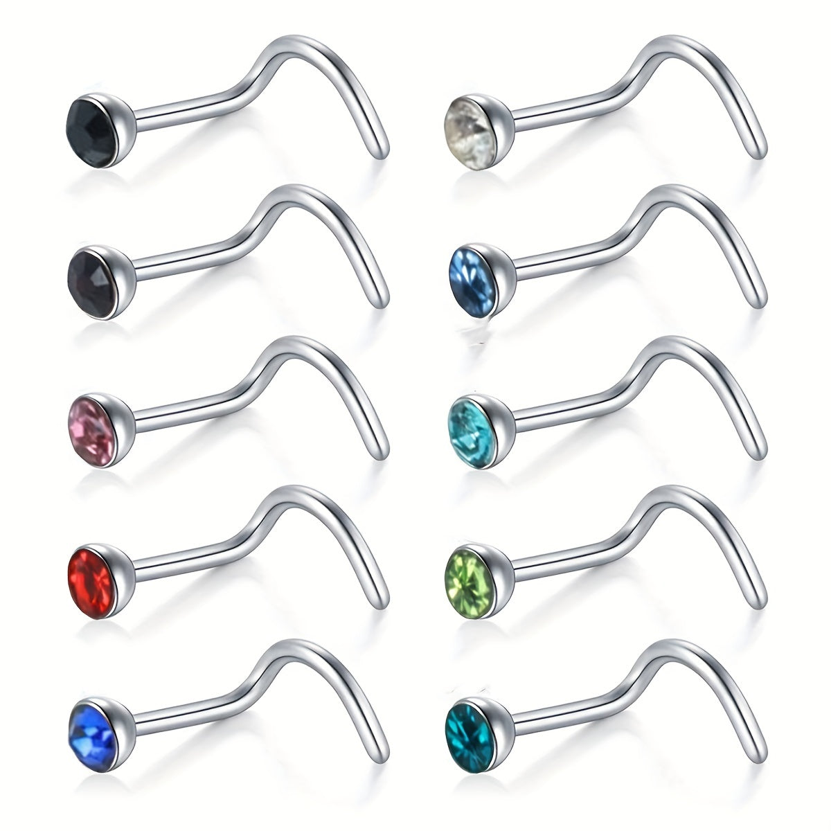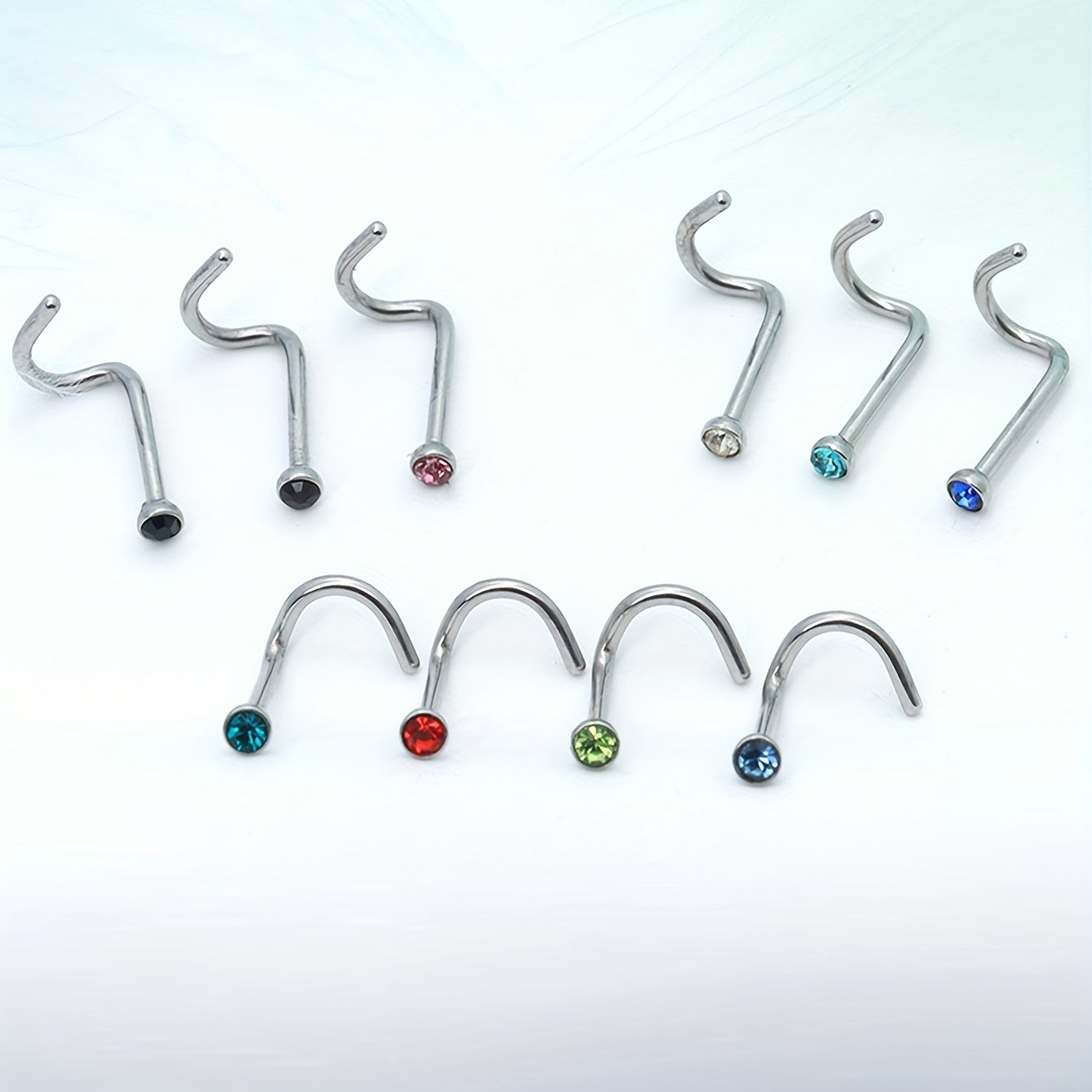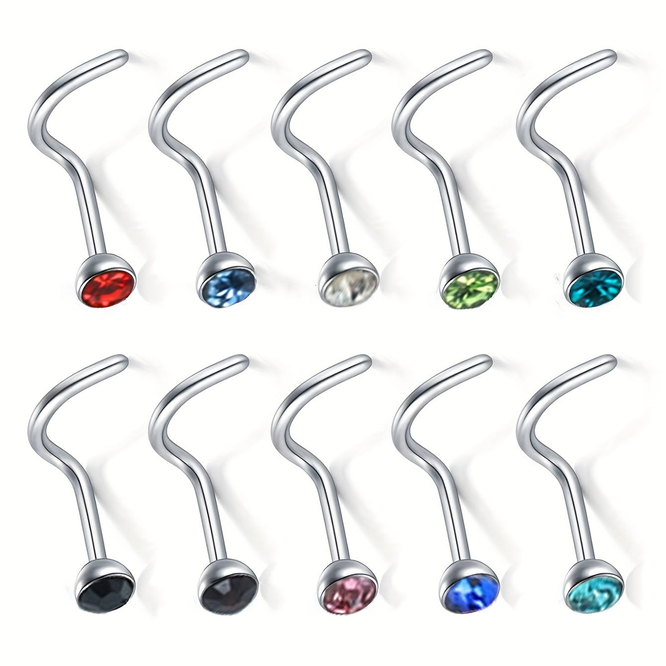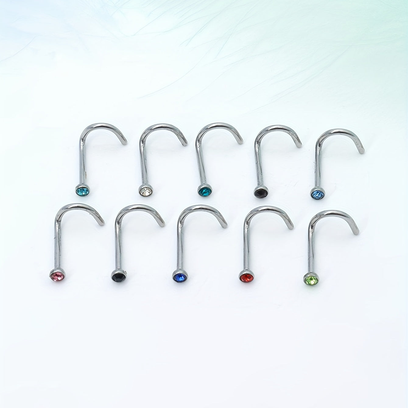 Enhance your nose piercing look with this set of 10 curved rod nose rings featuring inlaid colorful rhinestones. Perfect for adding a pop of color to your style.