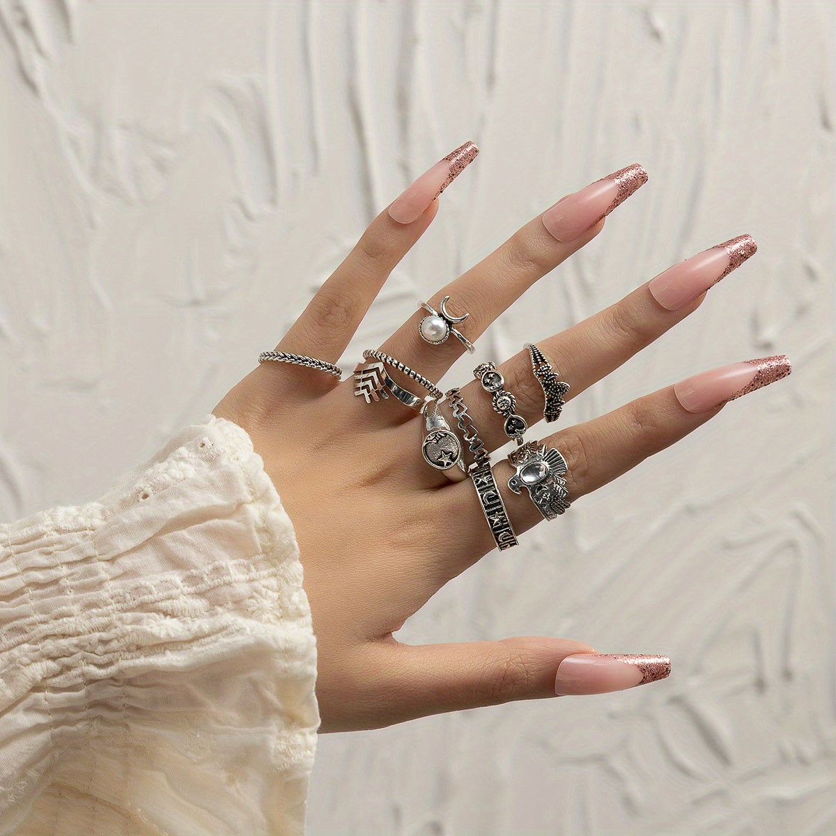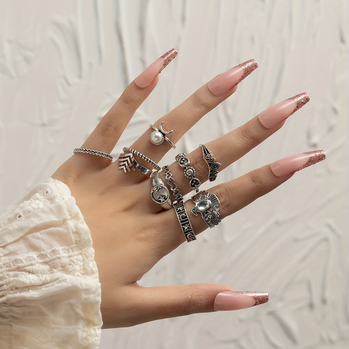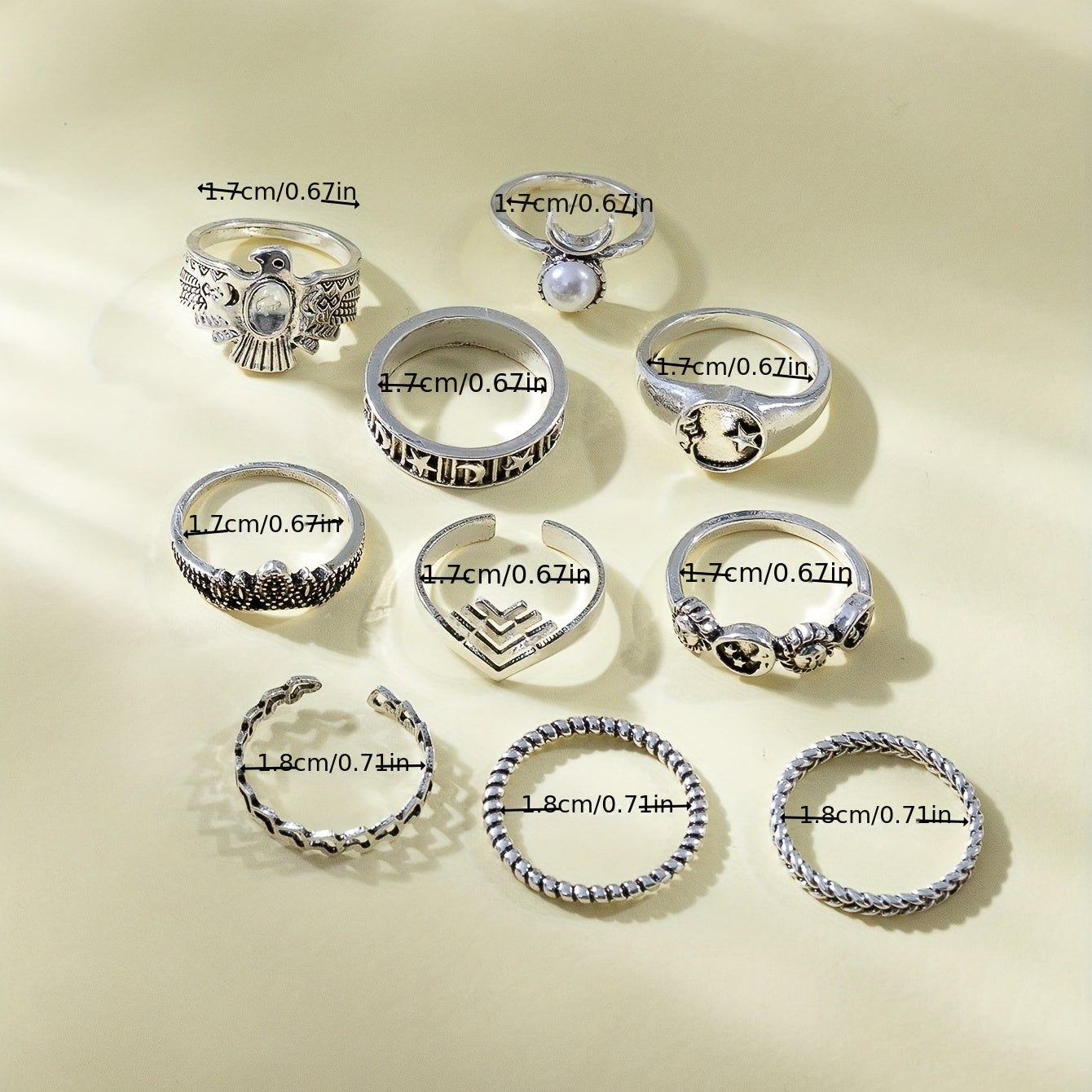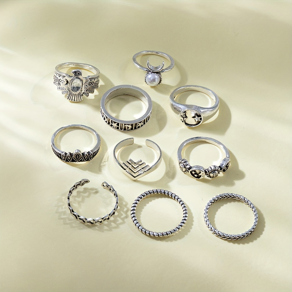 Elevate your daily outfits or party ensembles with these 10 vintage stacking rings featuring moon and sun patterns. Mix and match for a unique and stylish look.