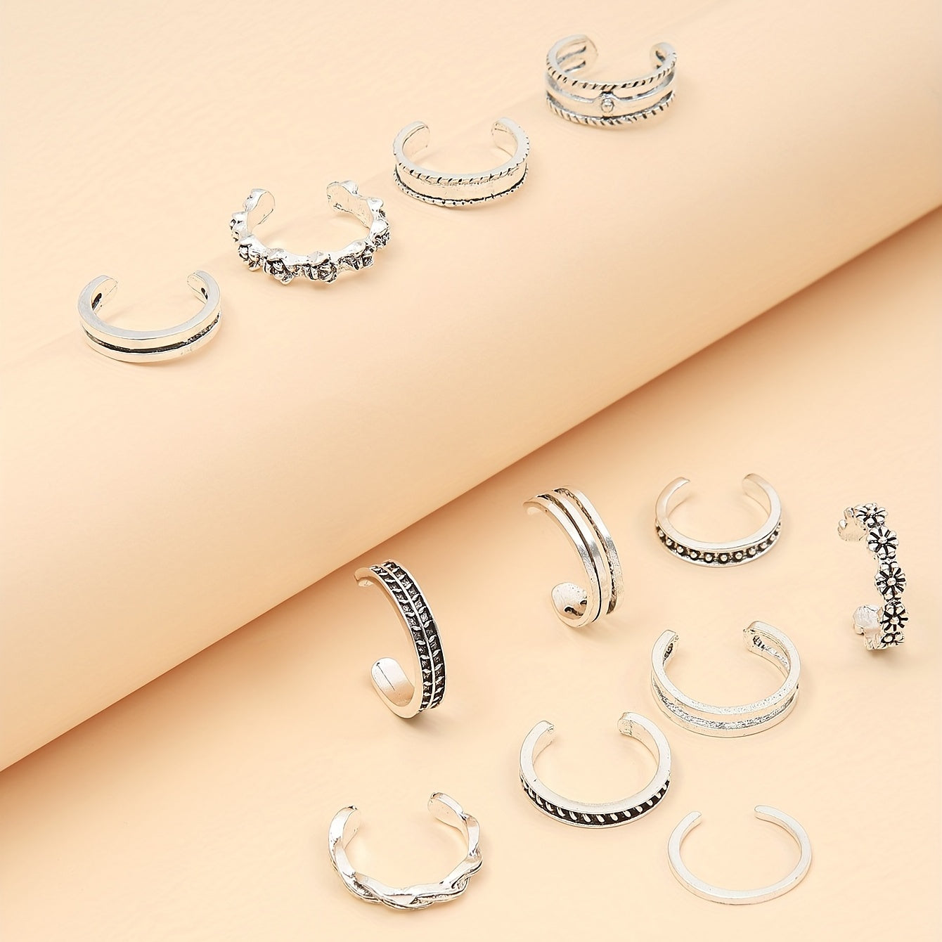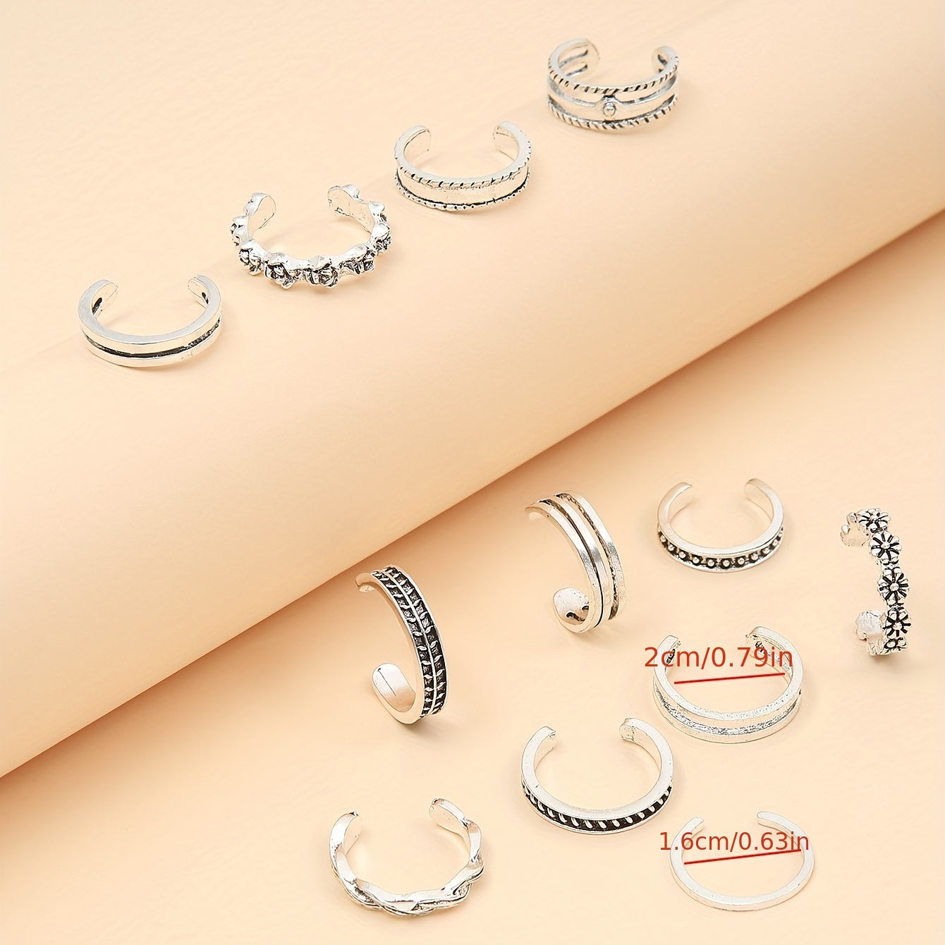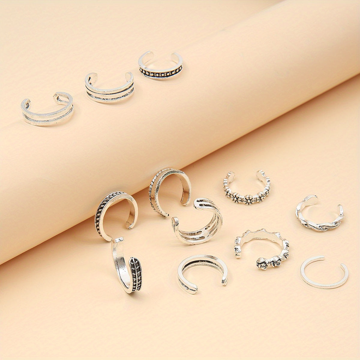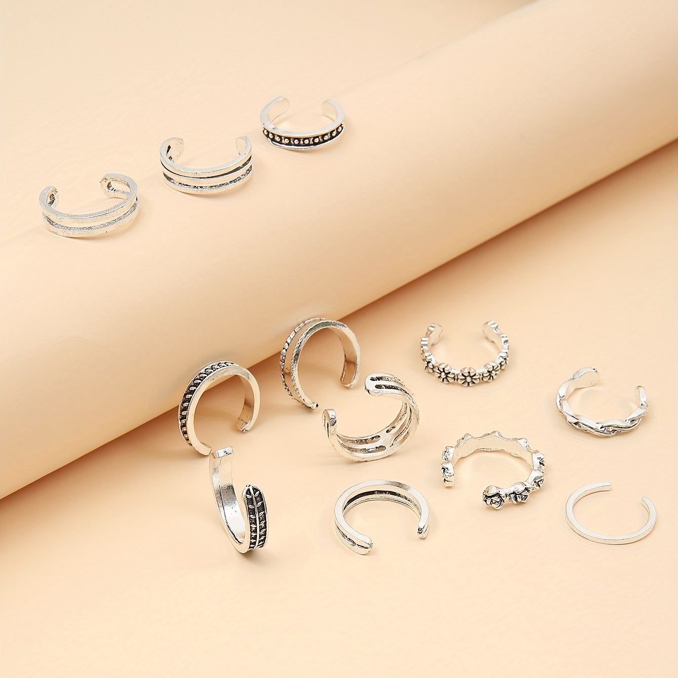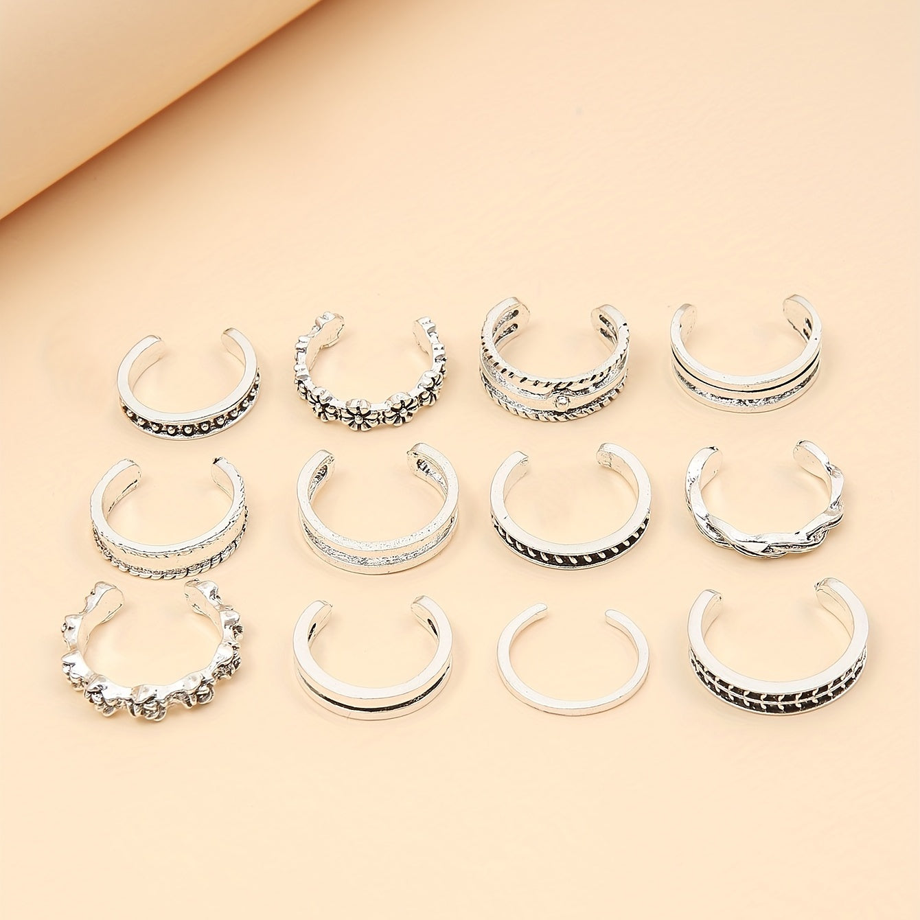 Enhance your style with this stunning 12-piece vintage carved hollow foot ring set. Each ring is adjustable for a comfortable fit and features intricate designs. Perfect for adding a touch of retro charm to your look.