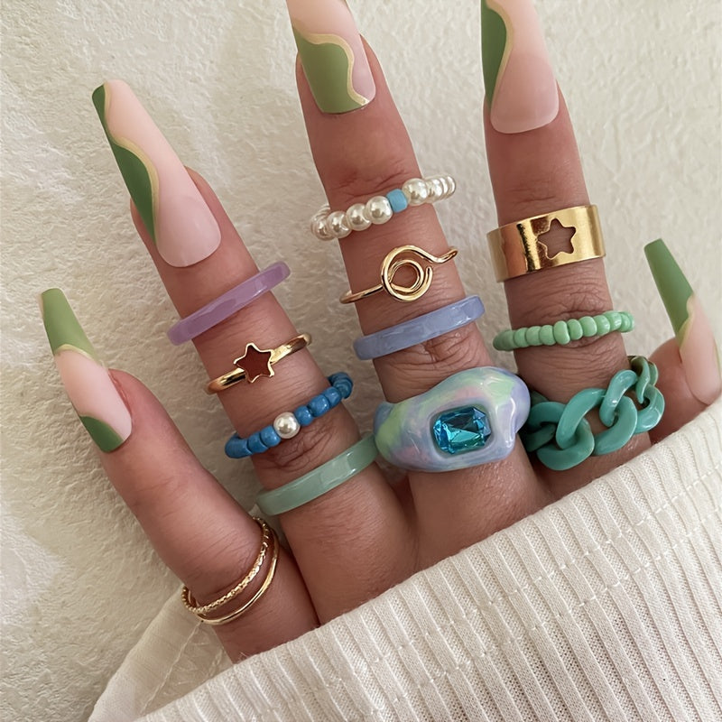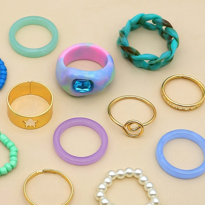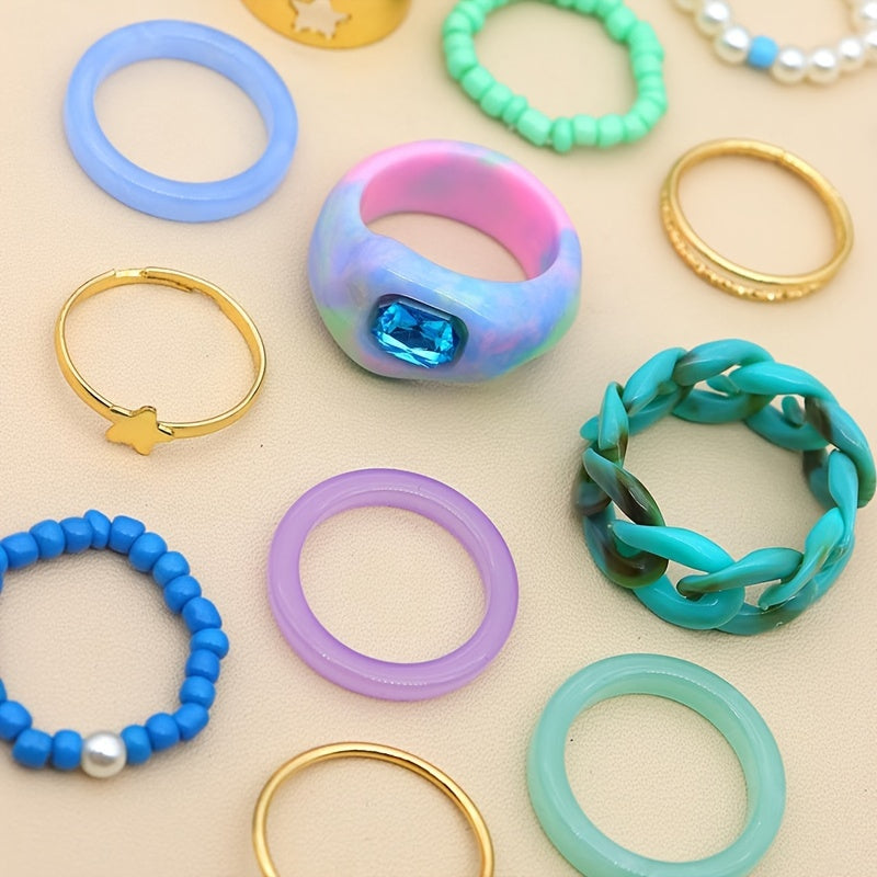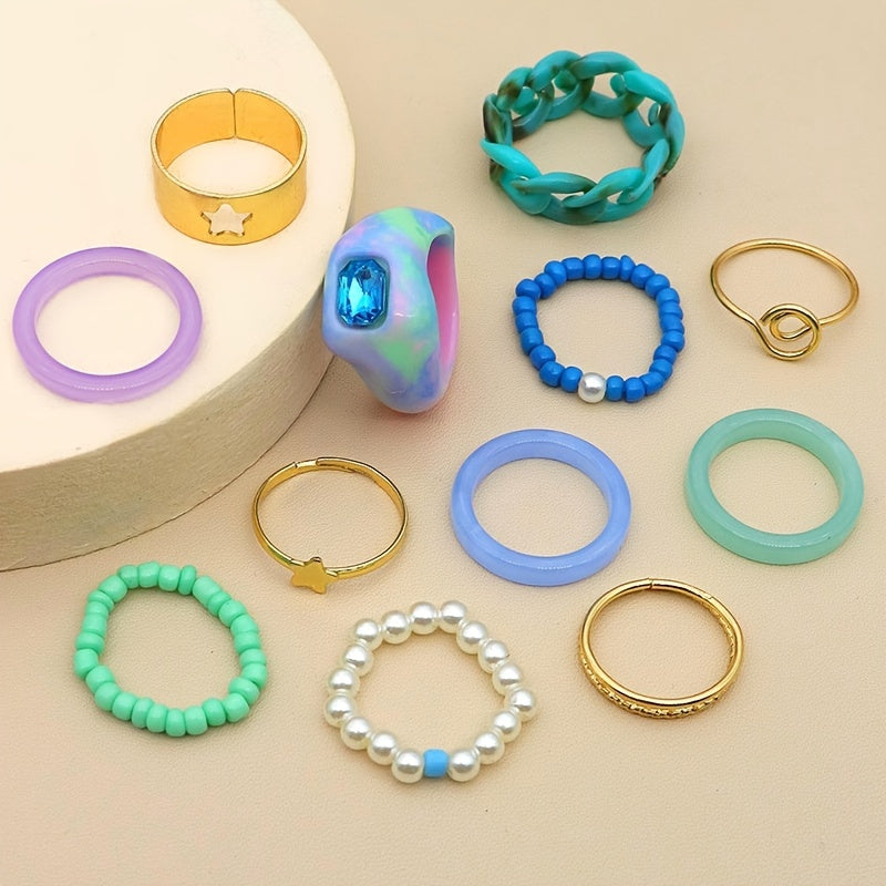 Enhance your teen's style with this fashionable set of 12 stackable rings. These boho rings feature starry sky and faux pearl decorations, perfect for creating trendy looks.