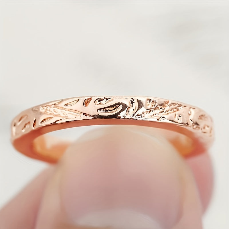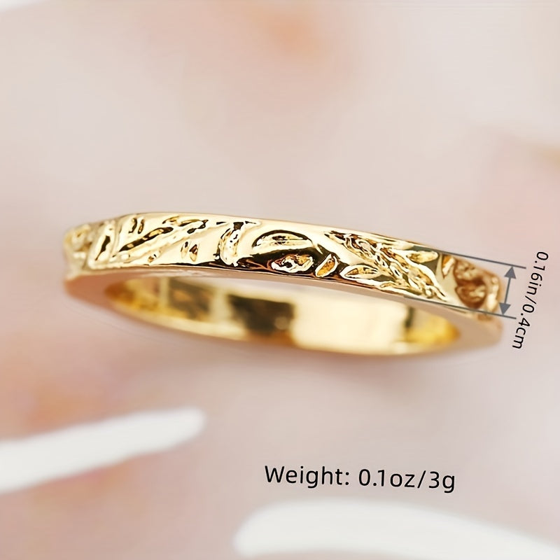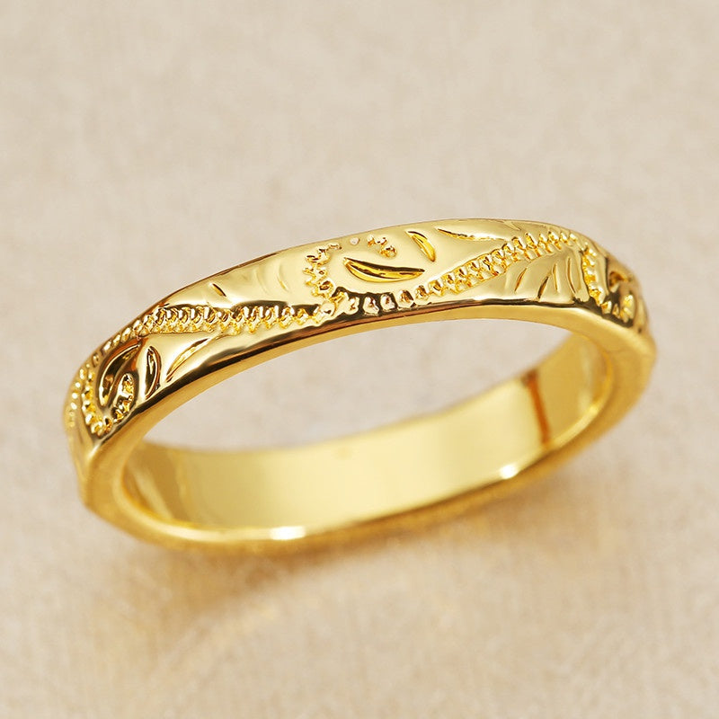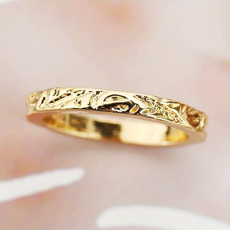 This beautiful band ring features a flower pattern design with intricate engraving. It is plated with 14K gold, making it an ideal choice for weddings, engagements, or as a thoughtful gift for a loved one.