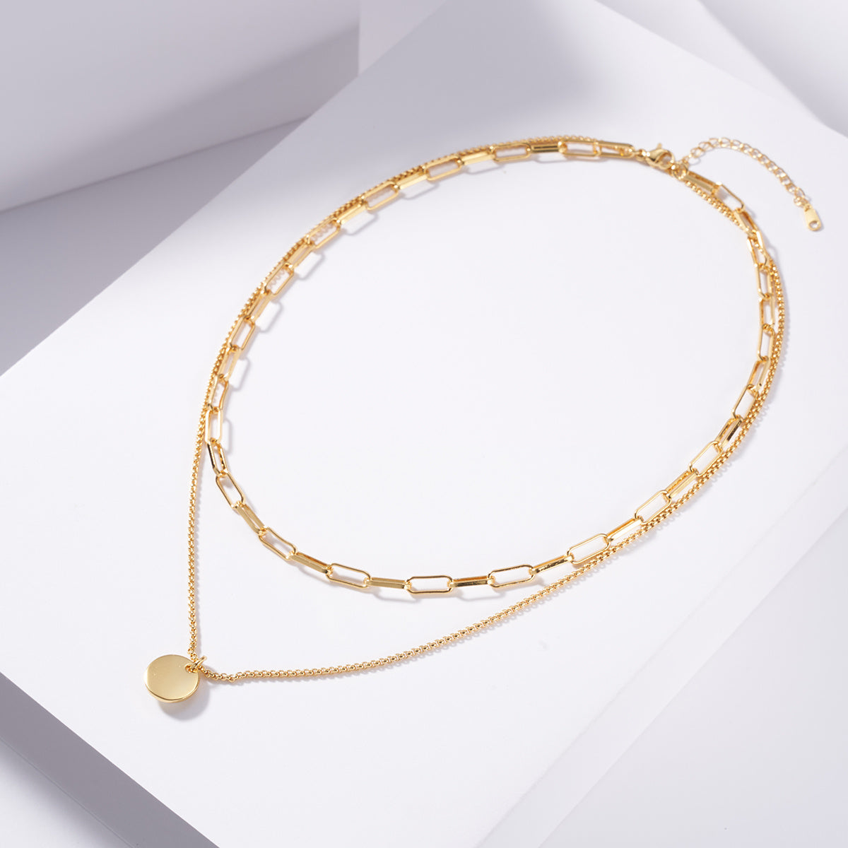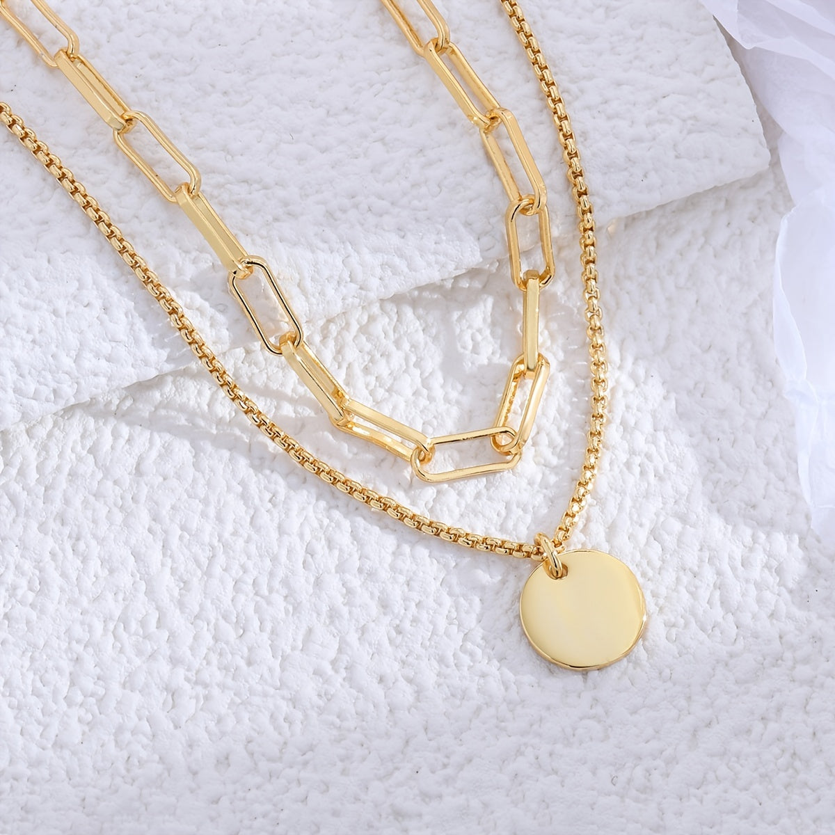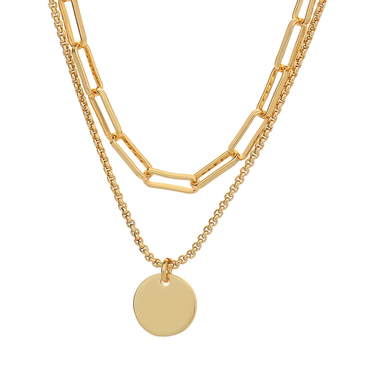 Add a touch of holiday style to your outfit with this elegant layered necklace featuring a flat round pendant. The necklace is made with high-quality 14K gold plating, perfect for women and girls of all ages.