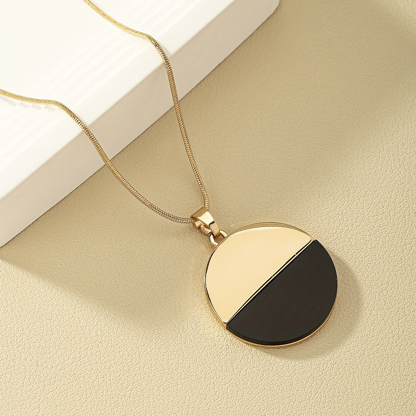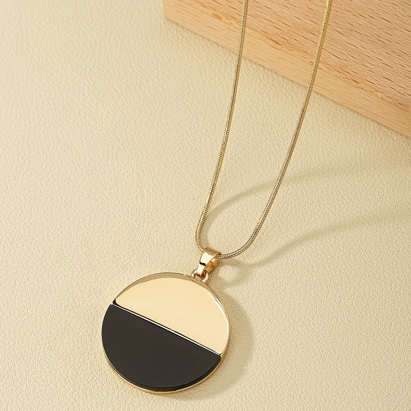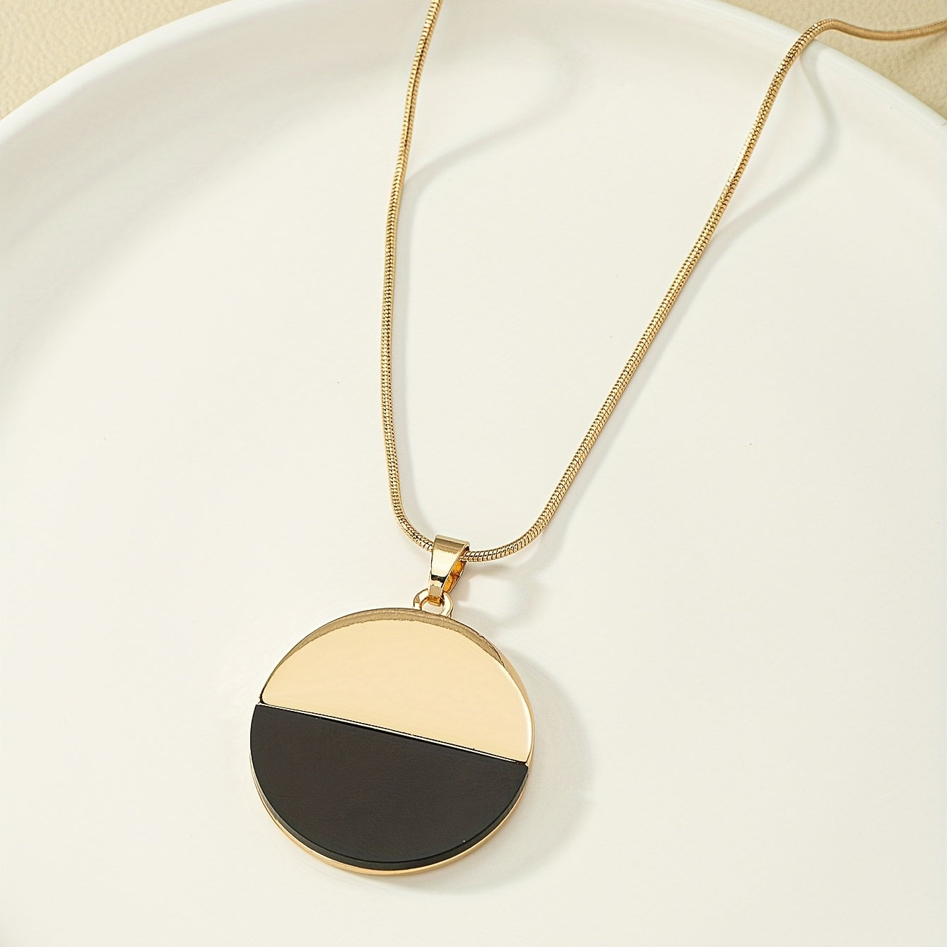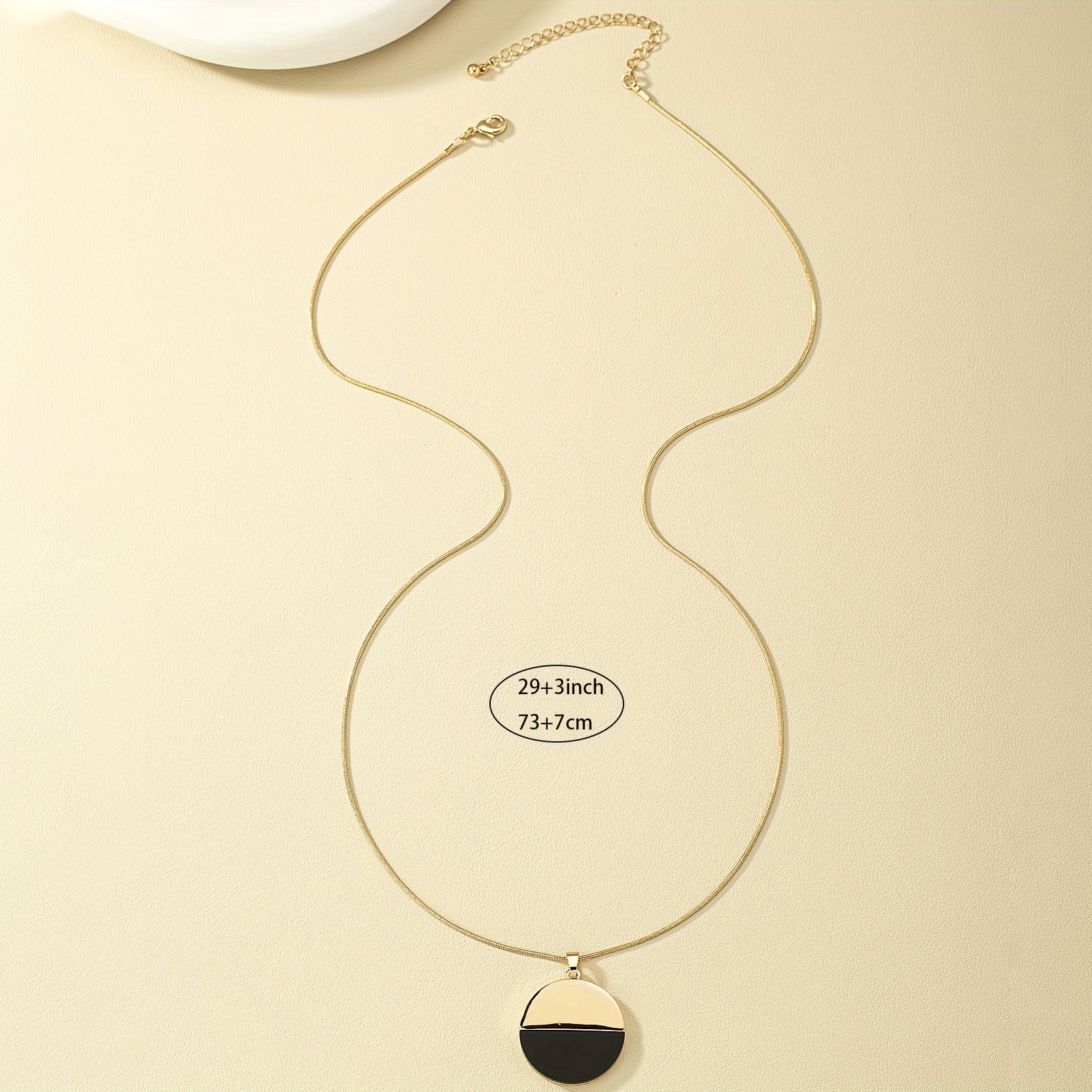 Elegant long necklace featuring a round and golden pendant, perfect for any occasion.