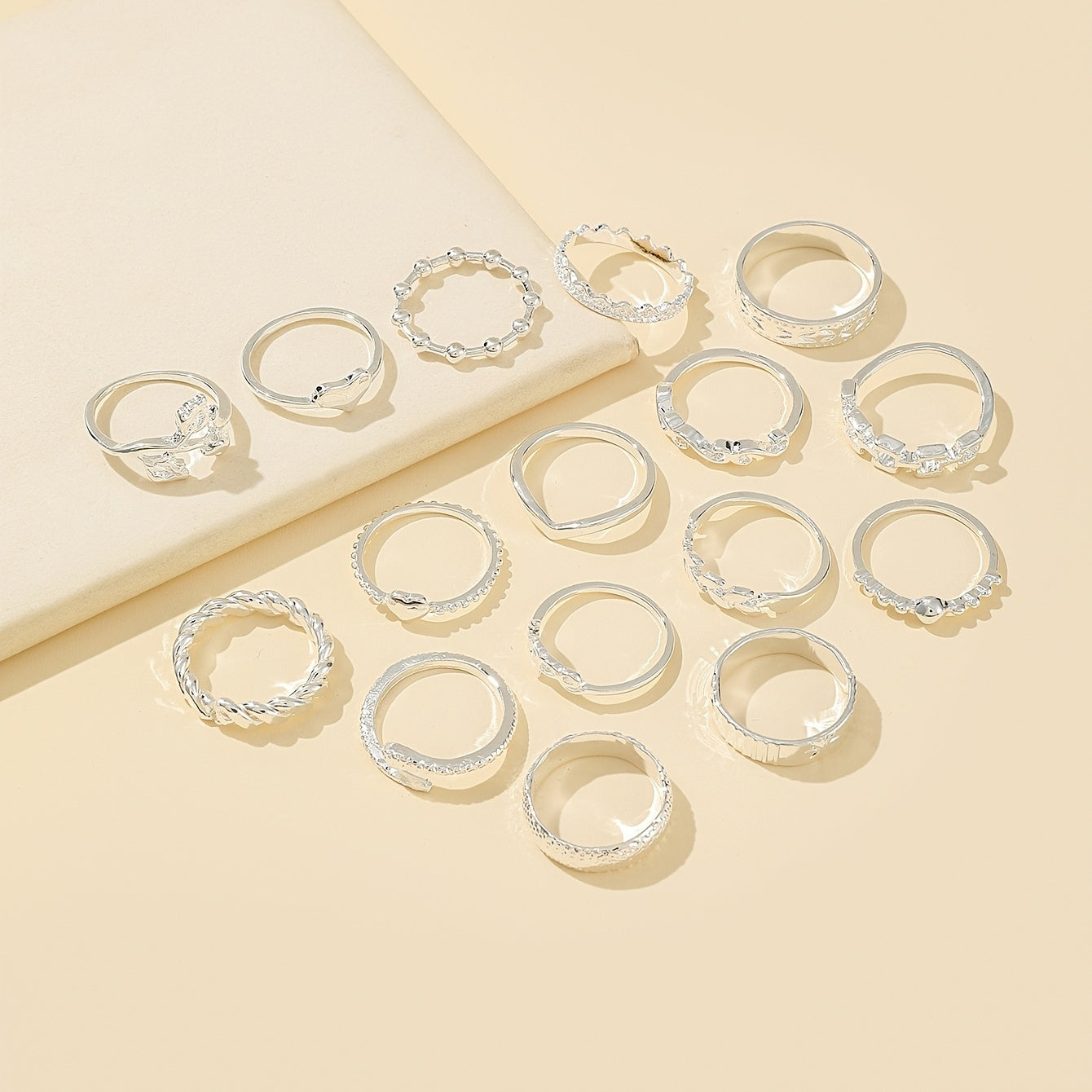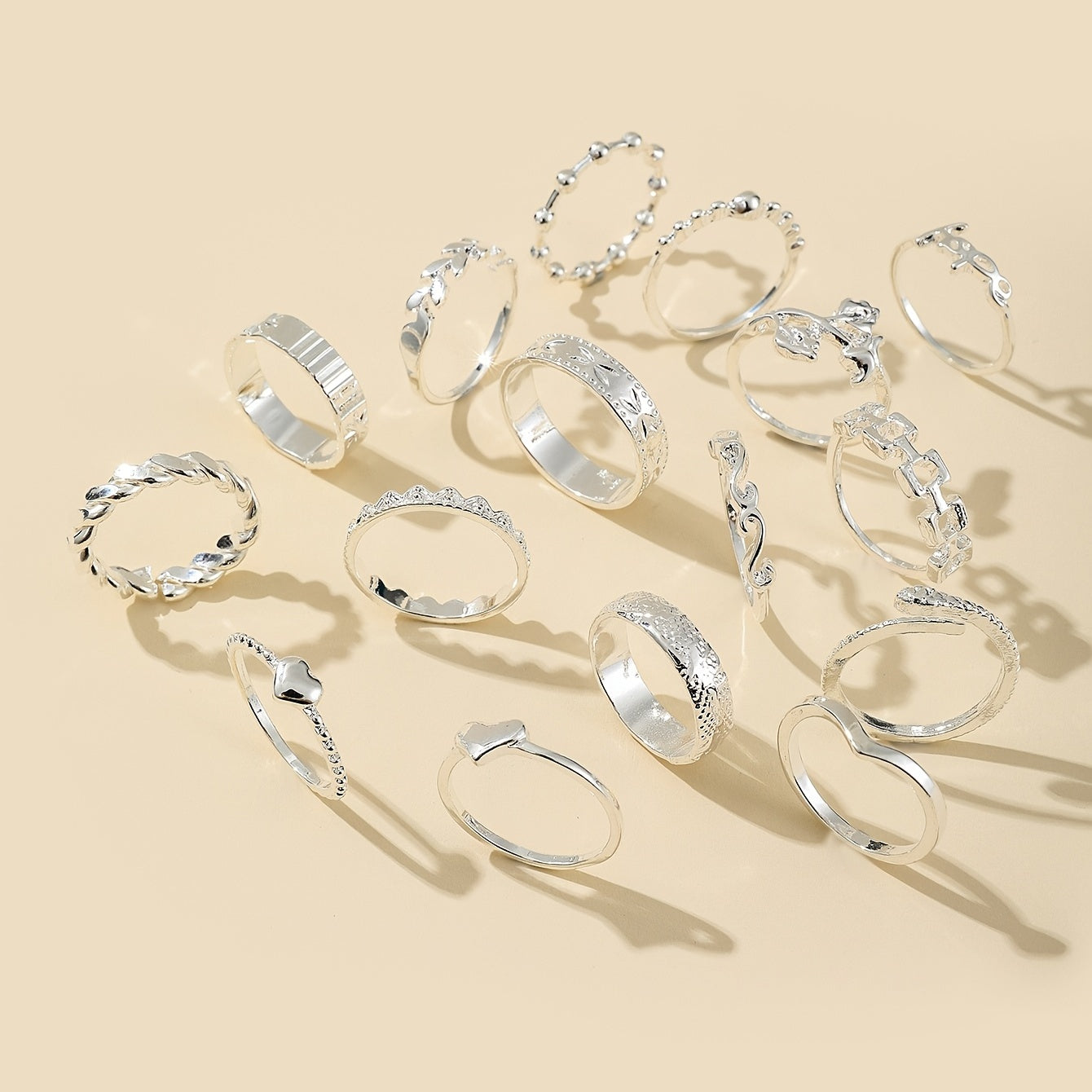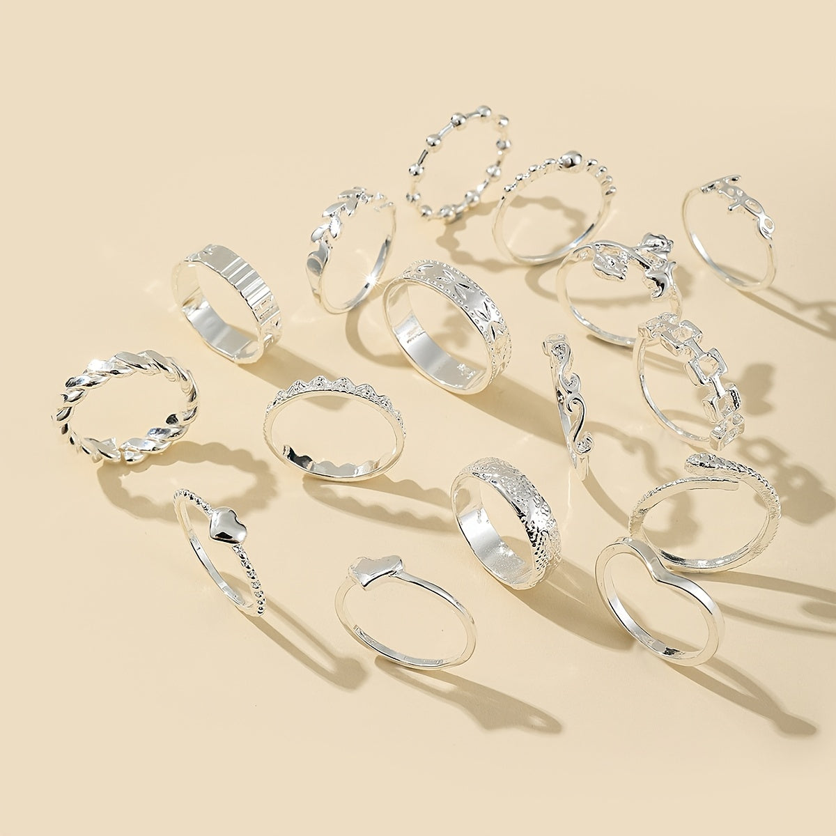 Add a touch of elegance with this set of 16 silver rings featuring shell, snake, love, and flower designs. Perfect for women and girls.
