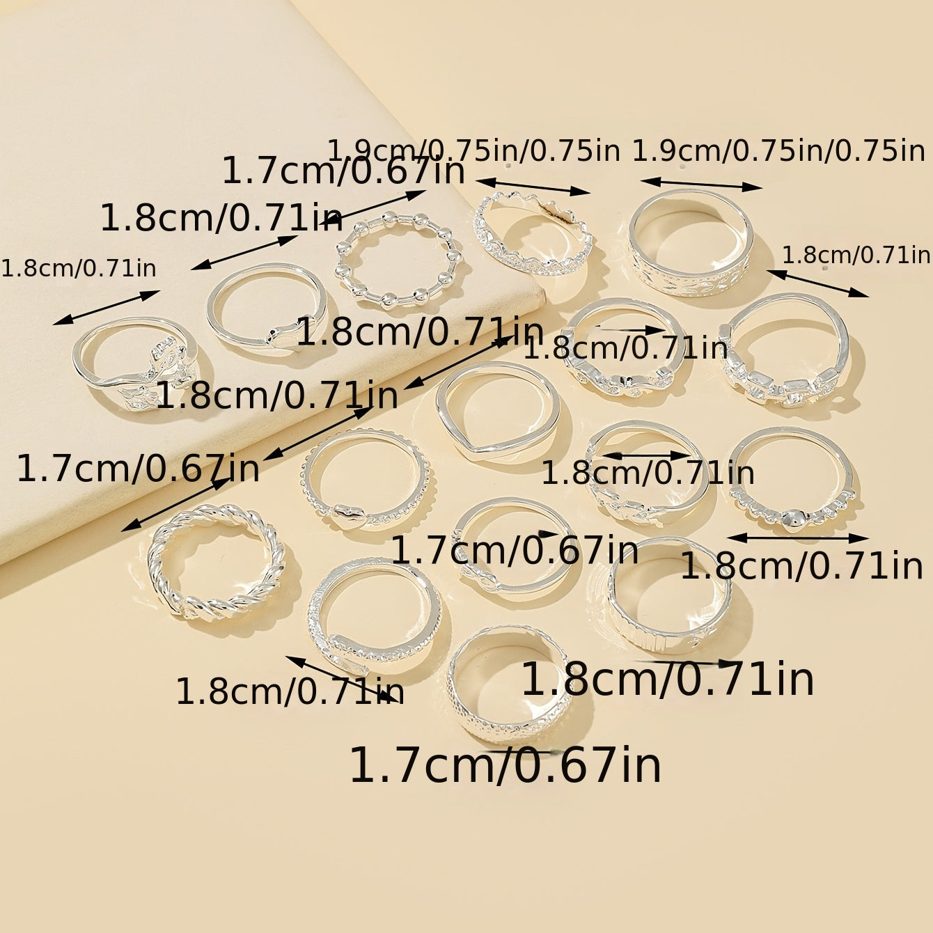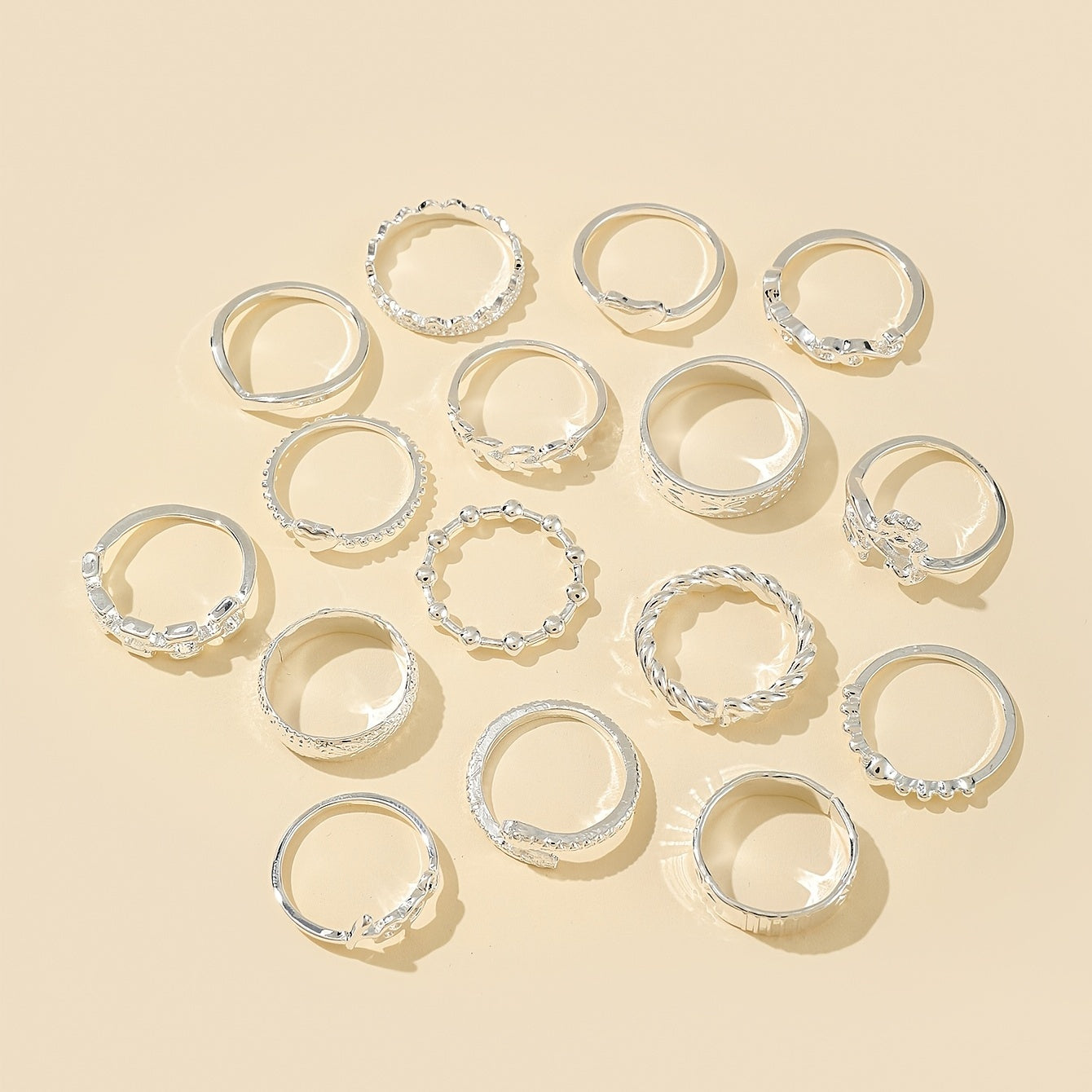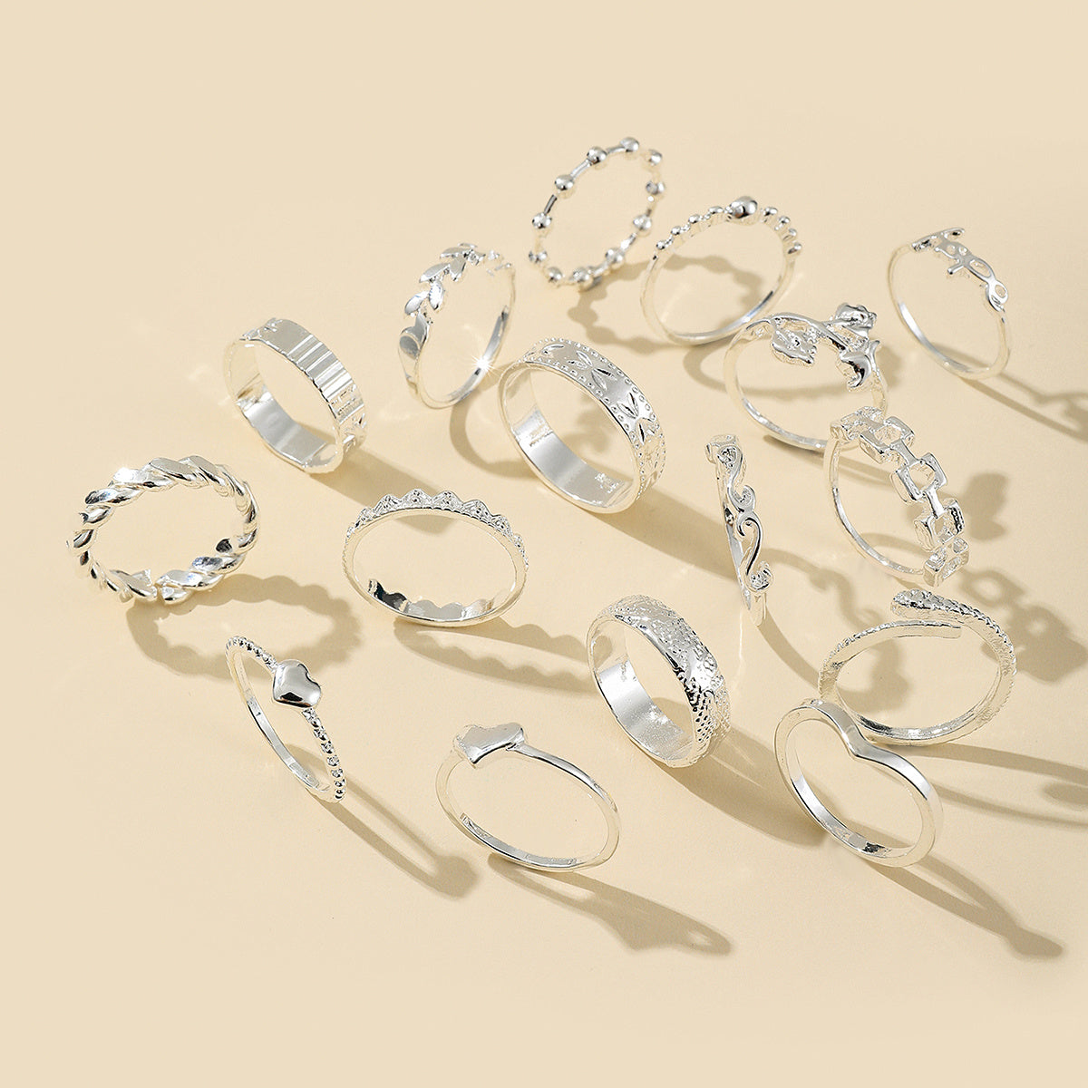 Add a touch of elegance with this set of 16 silver rings featuring shell, snake, love, and flower designs. Perfect for women and girls.