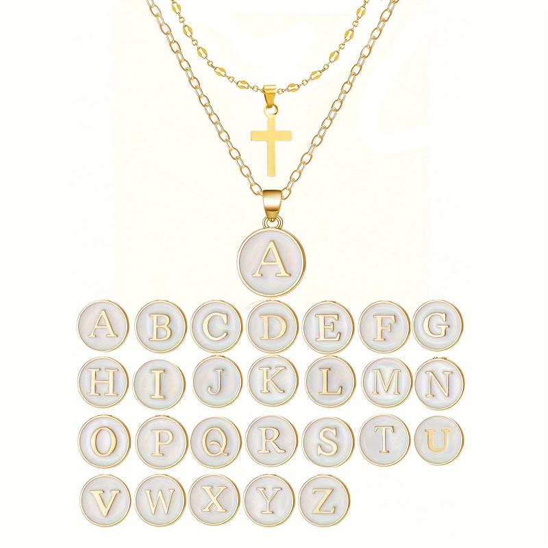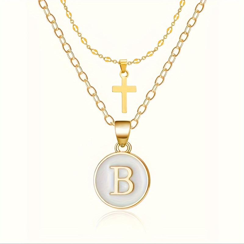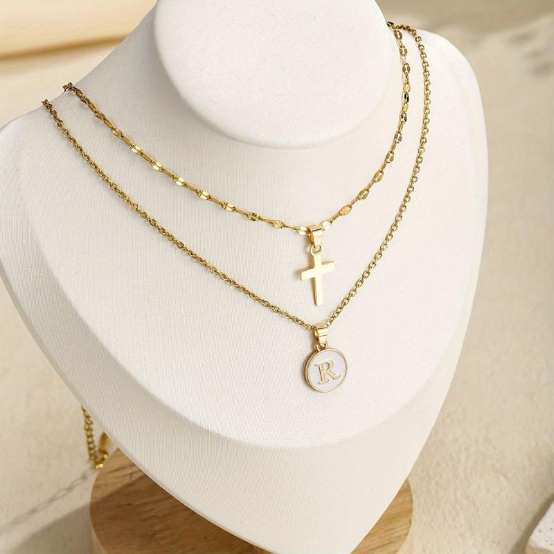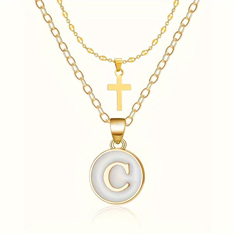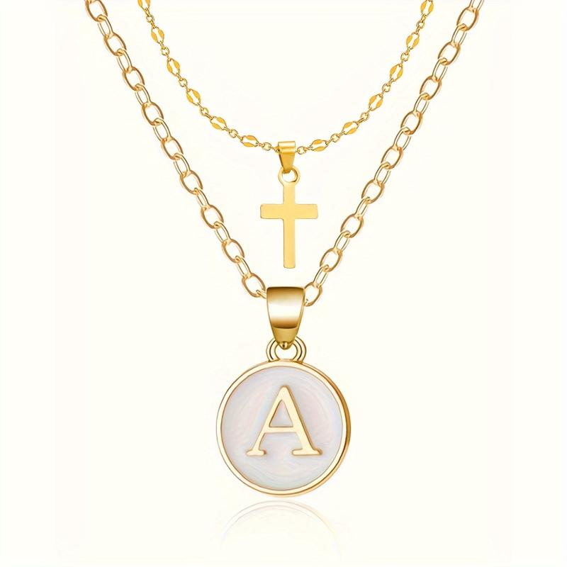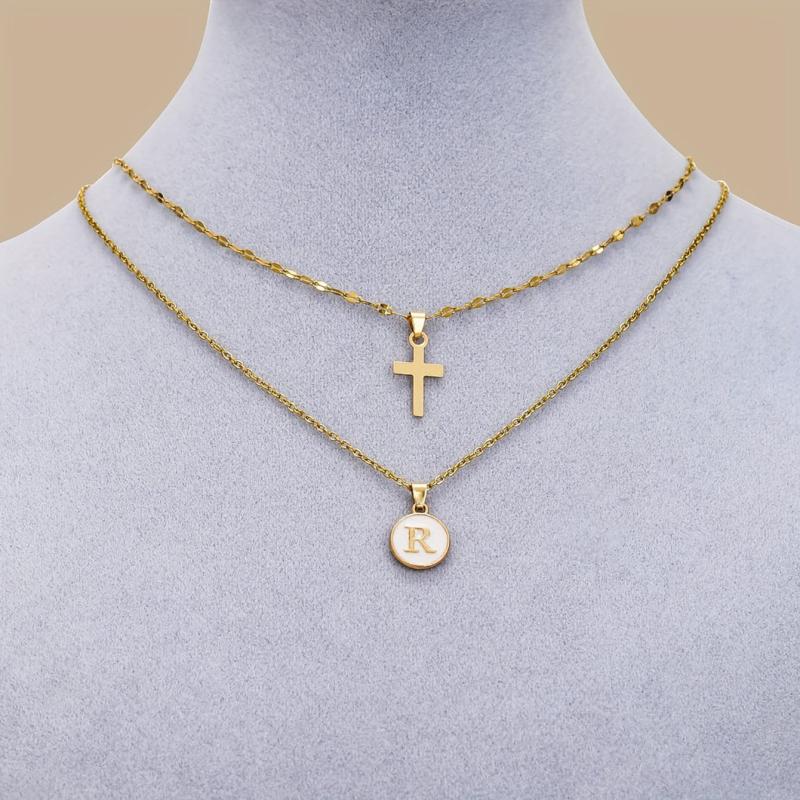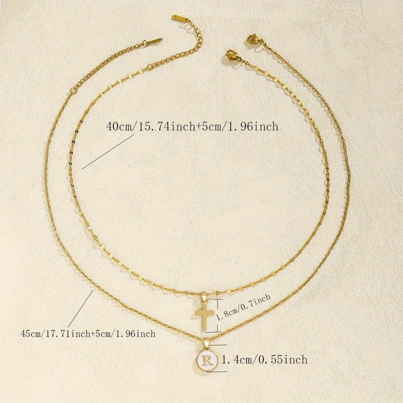 Two-pack set of stainless steel necklaces with golden plated initial letter and cross pendants. Perfect for daily wear or vacation. Ideal Thanksgiving gift.