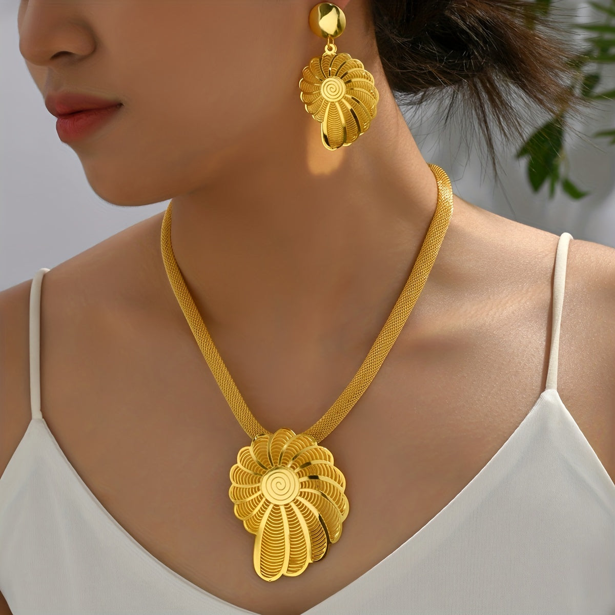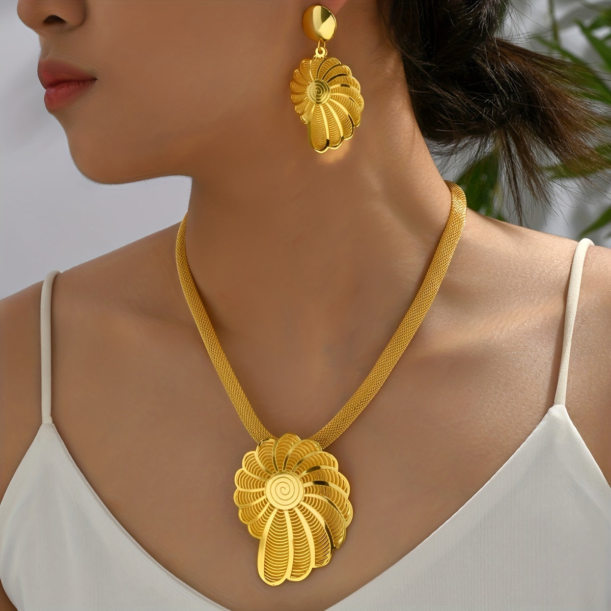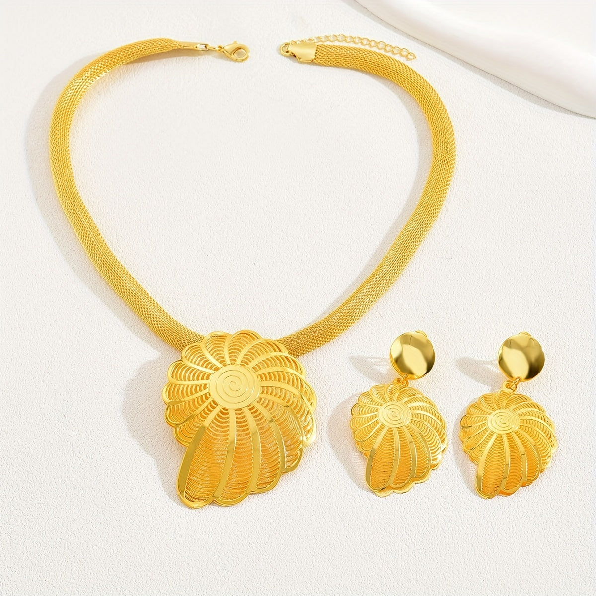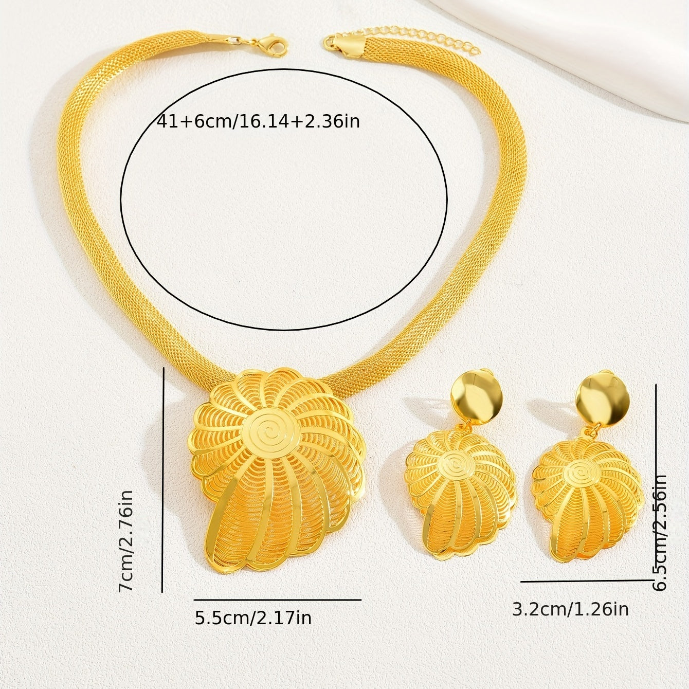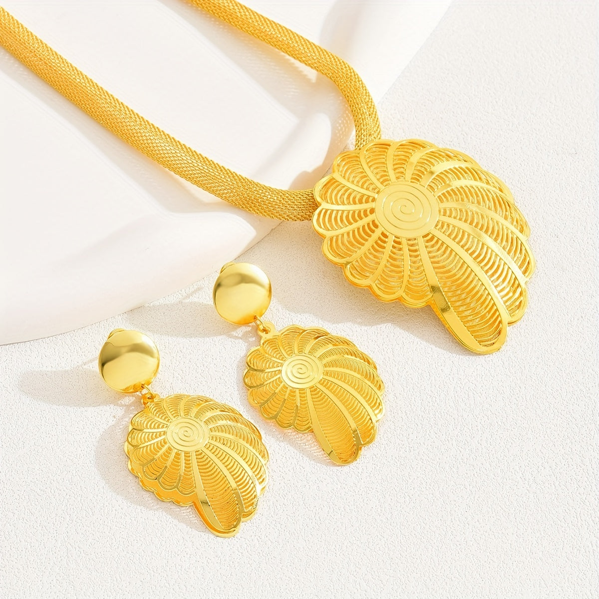 Upgrade your bridal look with this stunning 18K plated conch necklace and drop earrings set. Perfect for banquets, weddings, or special occasions.