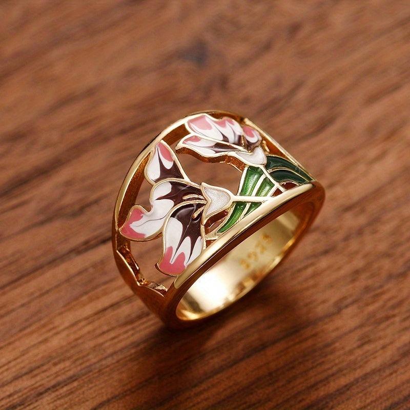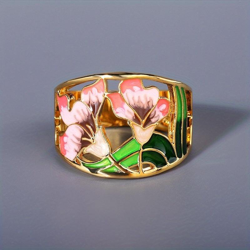 Enhance your daily casual look with this elegant 18K plated hollow enamel wide flower ring. Ideal for daily wear or as an anniversary gift.