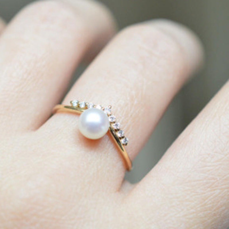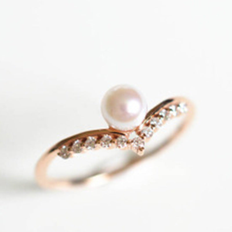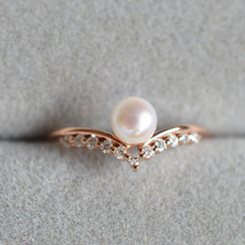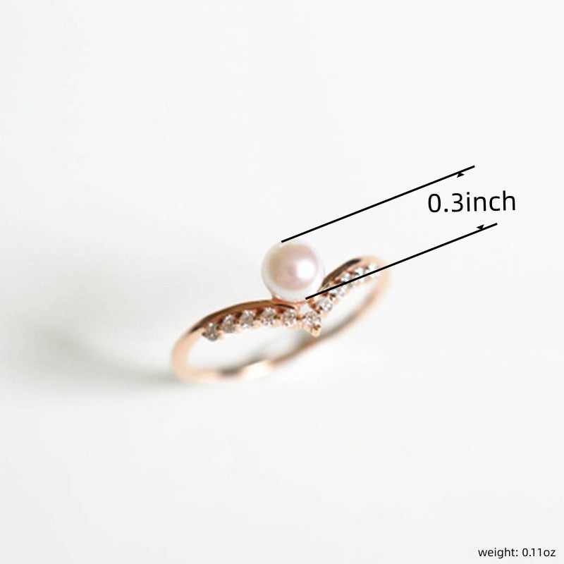 Elevate your look with this stunning 18k plated ring featuring a V shape design with inlaid shining zircon and a milky stone. Perfect for daily wear or a special occasion.