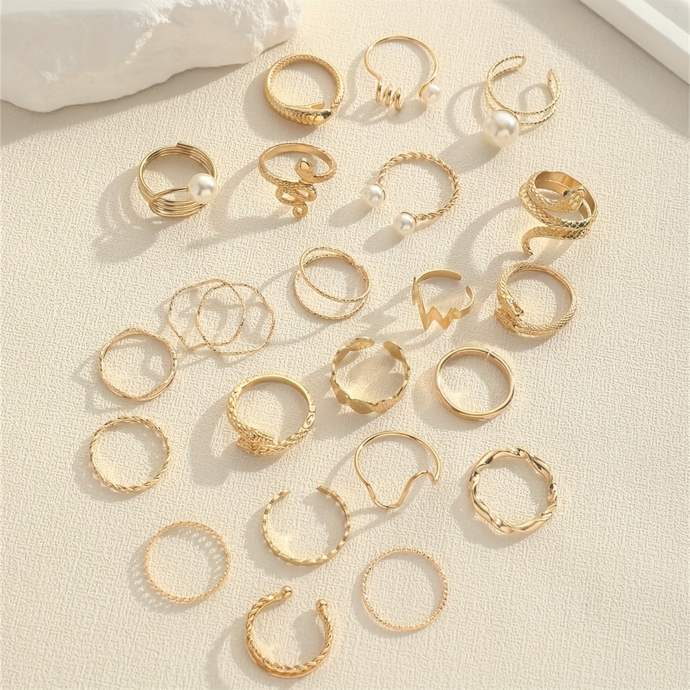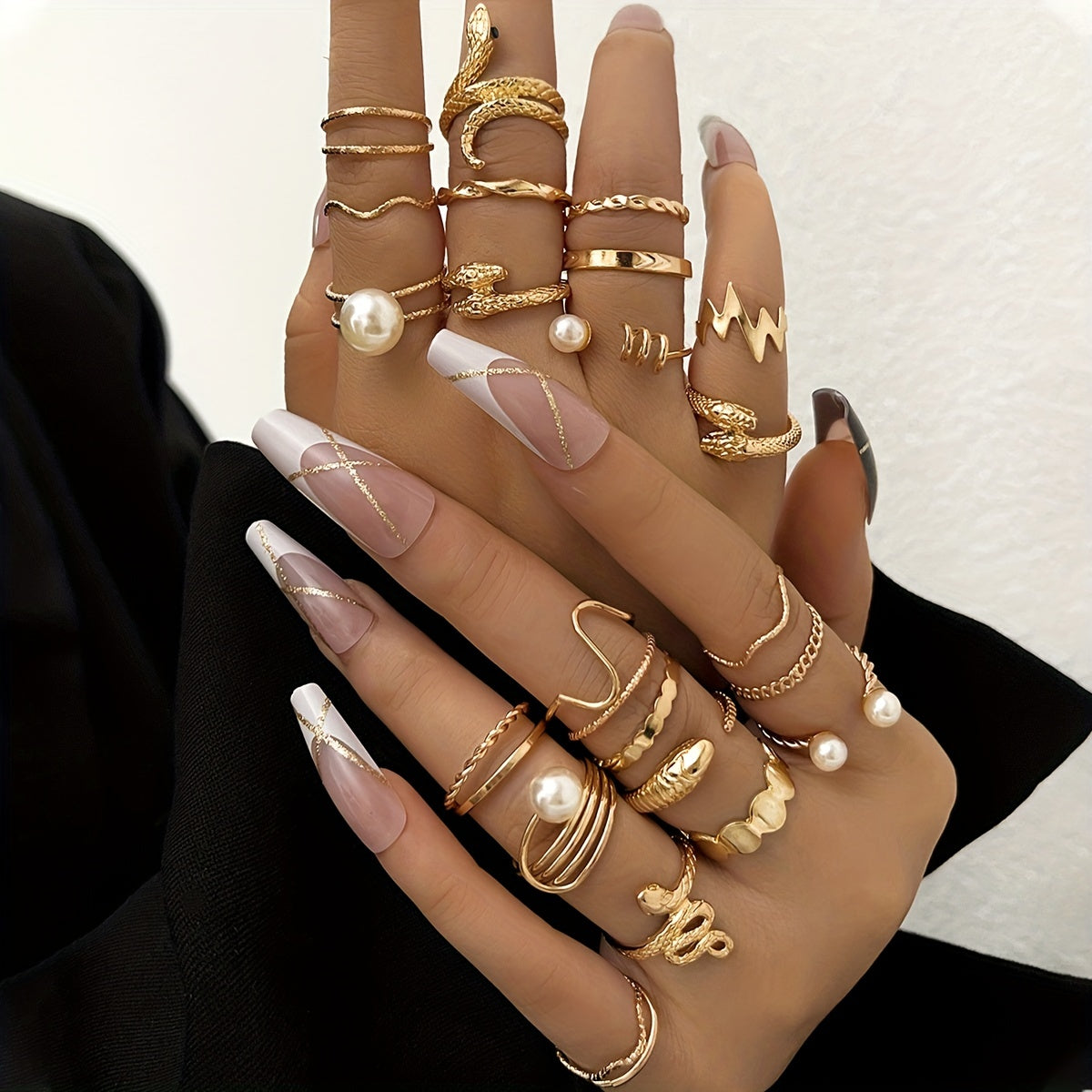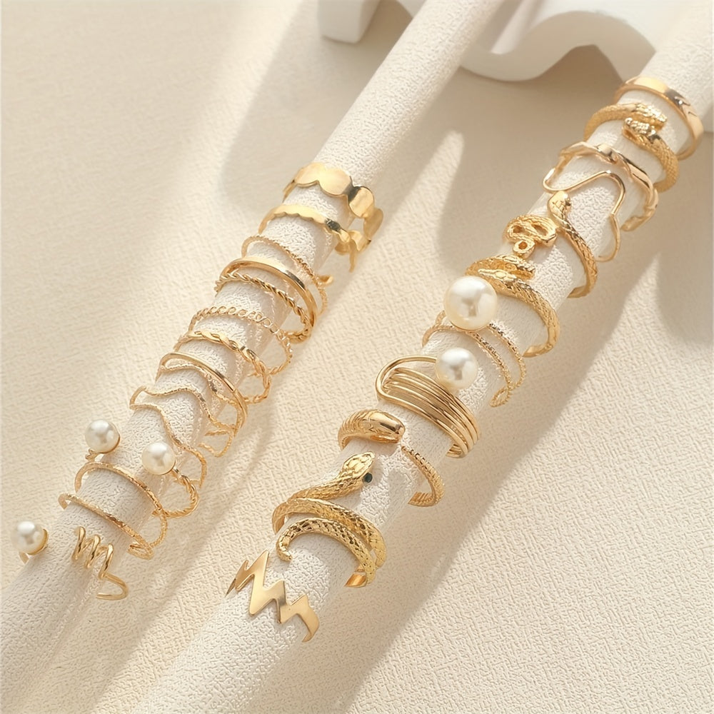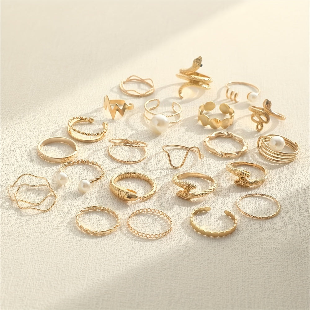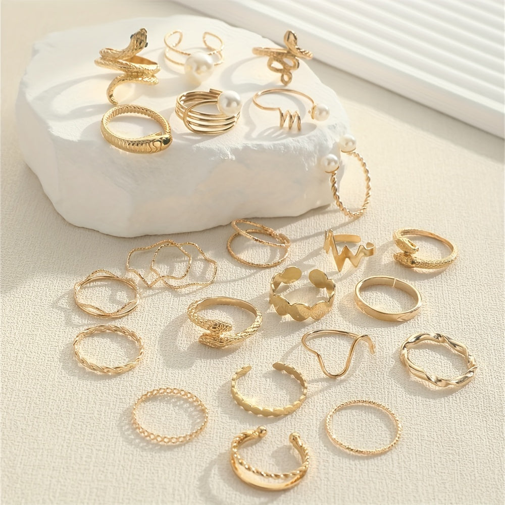 Add a touch of glamour to your daily outfits with these 23pcs golden stacking rings featuring snake embracing patterns. Perfect for parties and everyday wear.