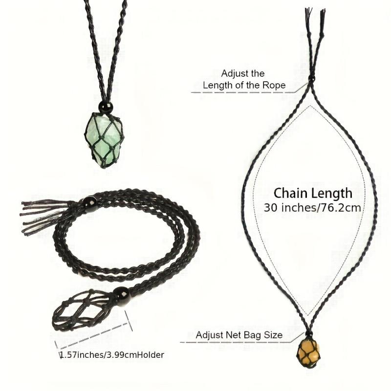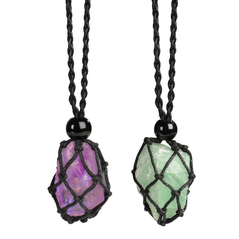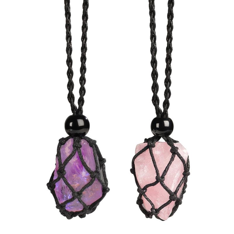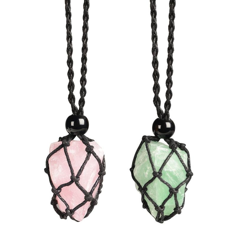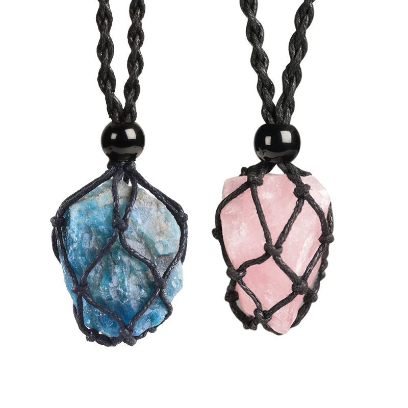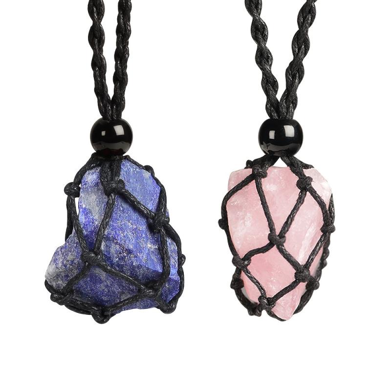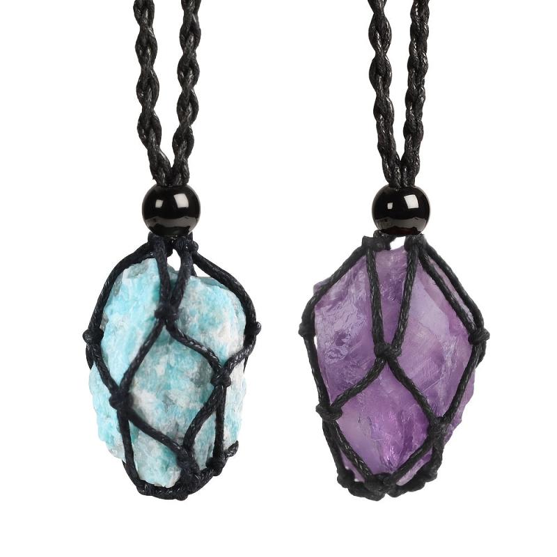 Boho style pendant necklaces with hand-woven rope and vintage-inspired design. Perfect for daily wear or as a gift. Each necklace features a natural stone crystal pendant on an adjustable rope.