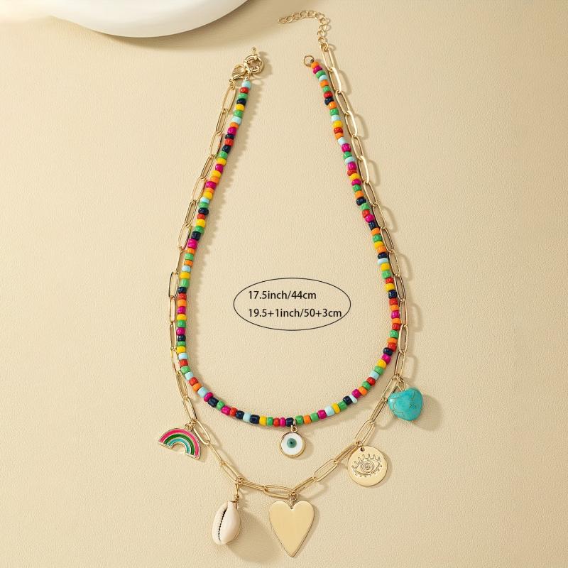 Elevate your style with this vintage boho necklace featuring stone, shell, and rainbow beads. Perfect for a Y2K-inspired look.