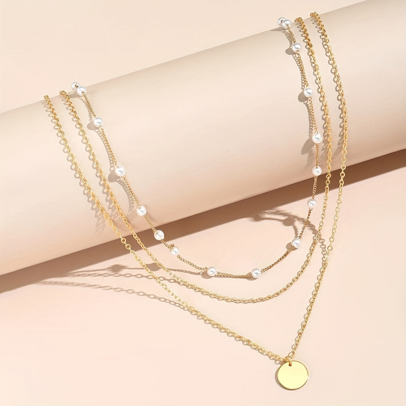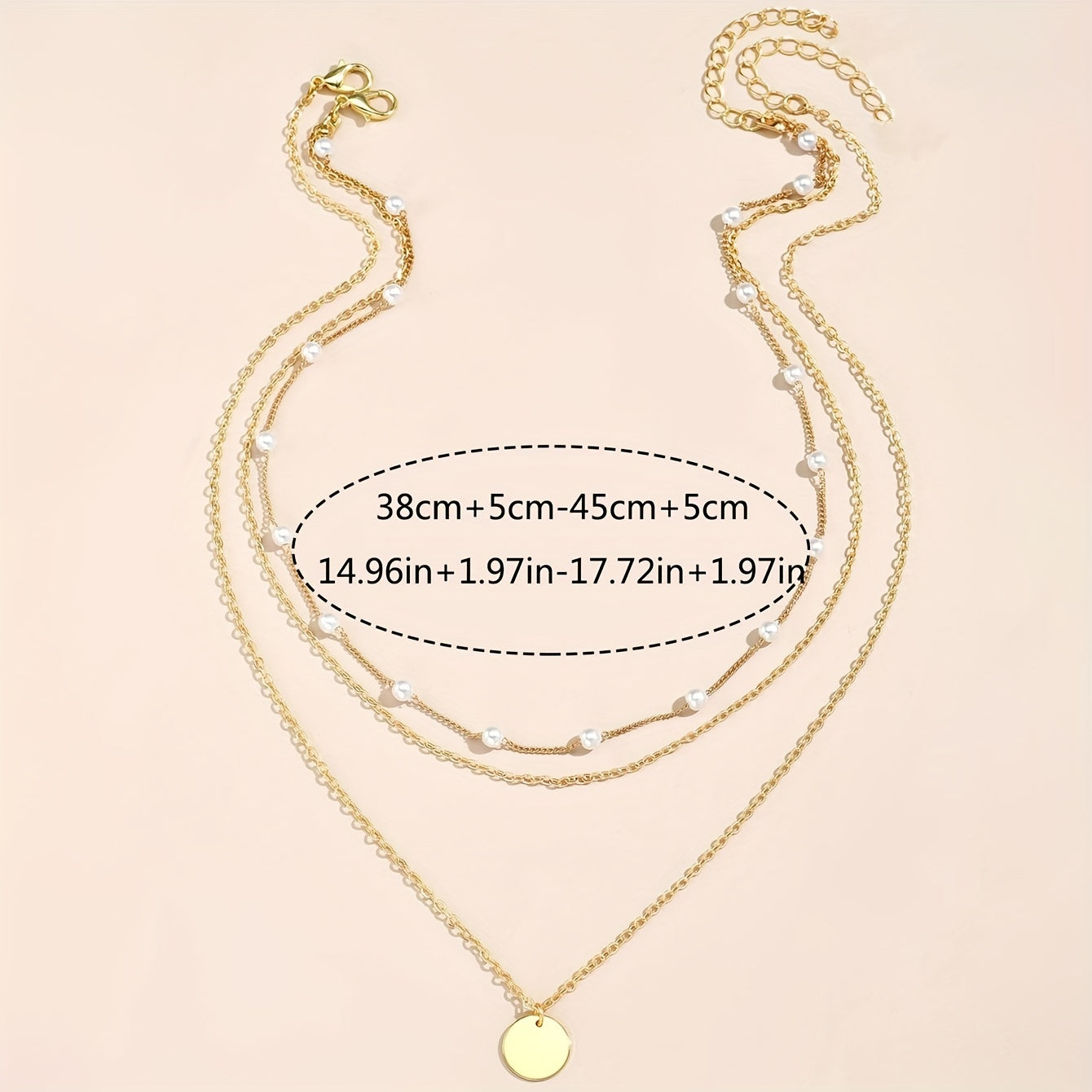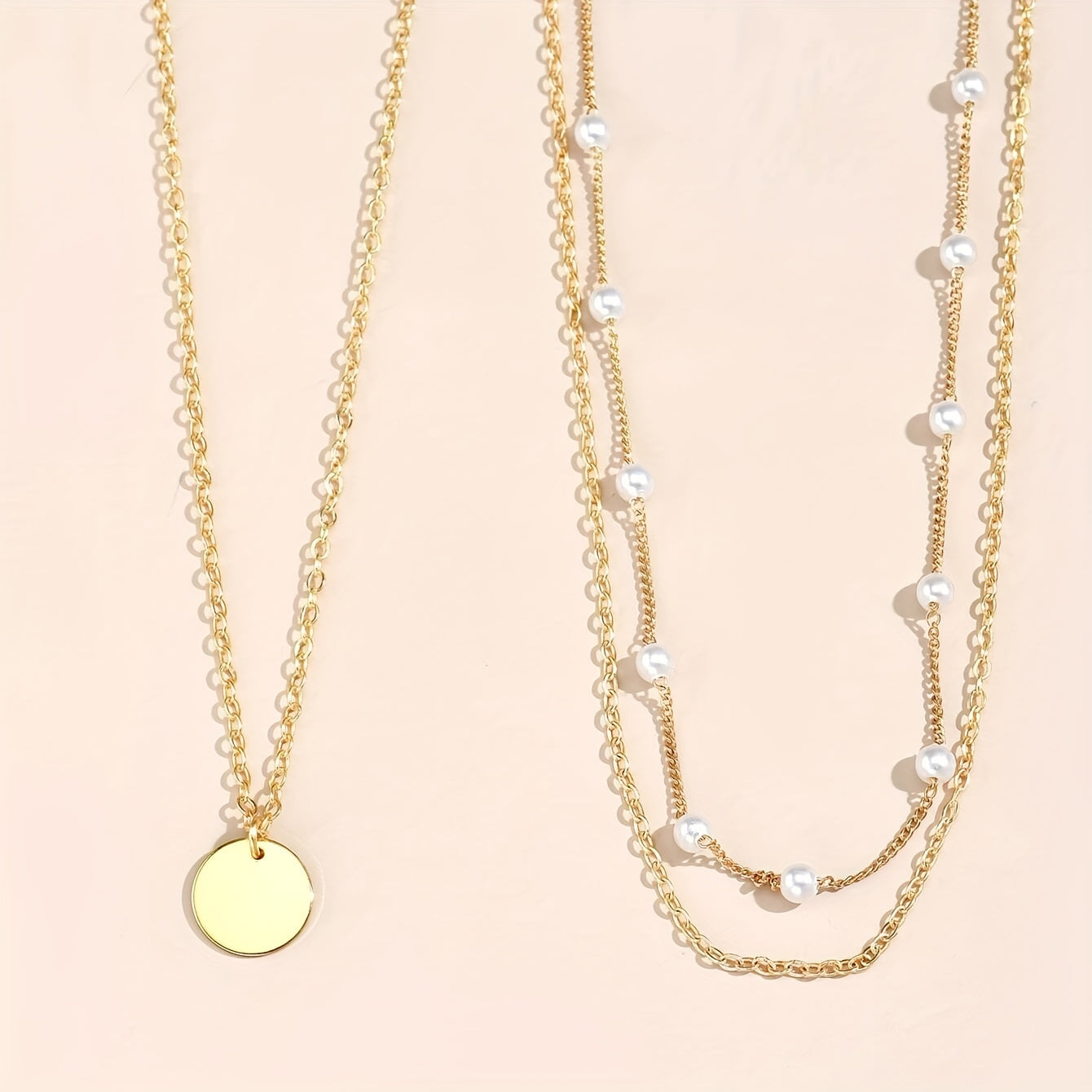 Elegant and stylish 2-piece necklace set featuring multilayer faux pearl design with geometric 14K plated disc. Perfect accessory for any occasion.