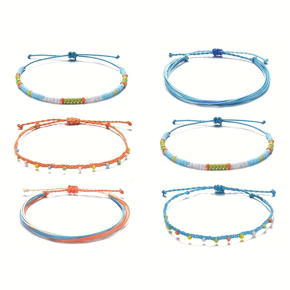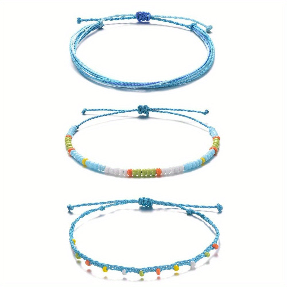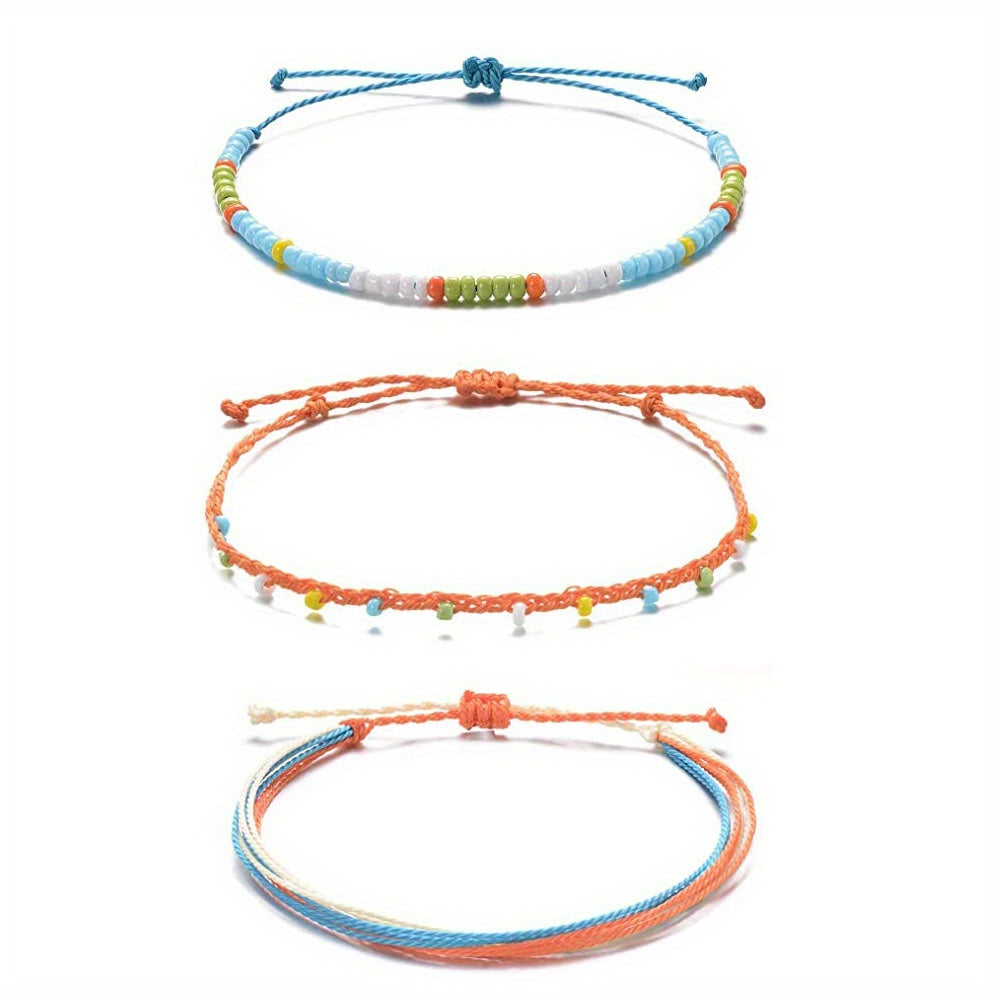 This set includes 3 colorful bead anklets with wax rope, perfect for summer. Adjustable and waterproof, ideal for beach and boho style lovers.