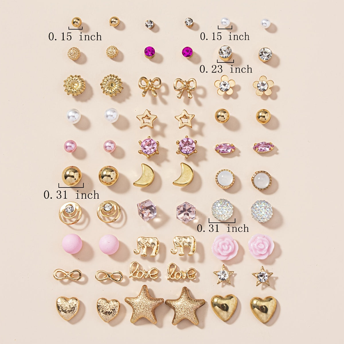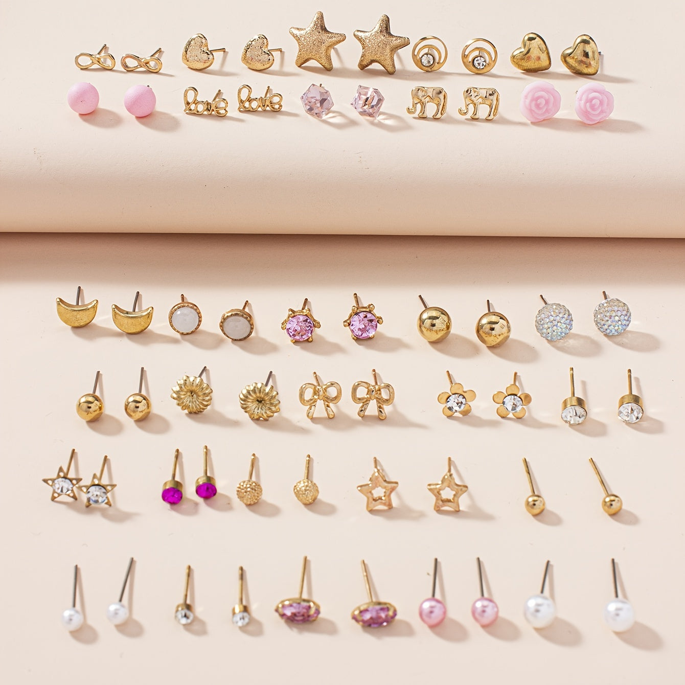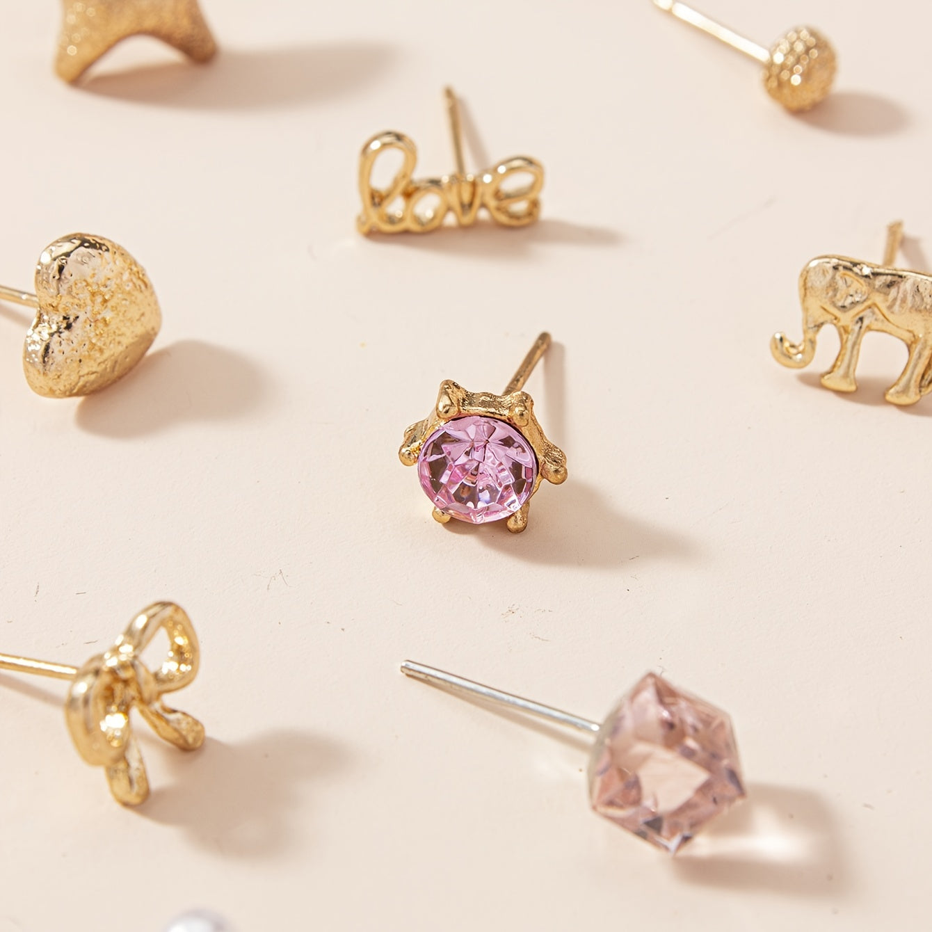 Enhance your style with this charming set of stud earrings featuring pink crystal bows, elephants, small flowers, faux pearls, and love stars.