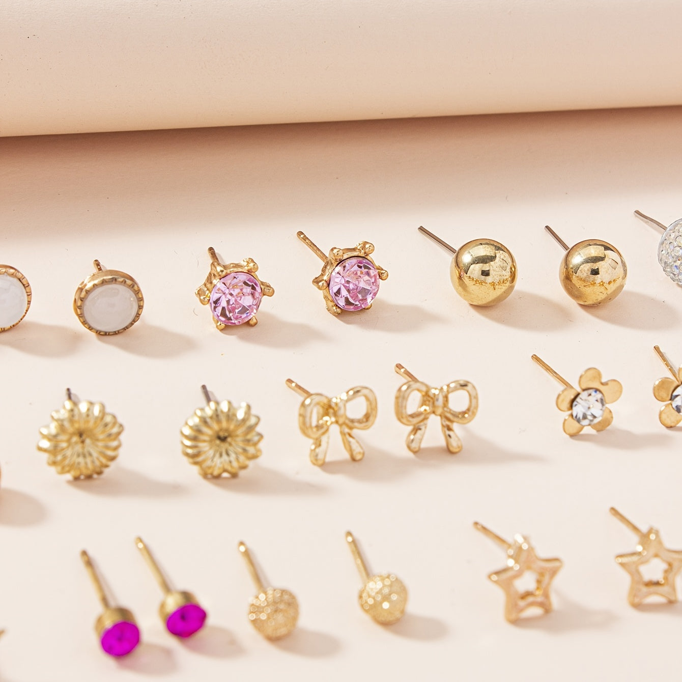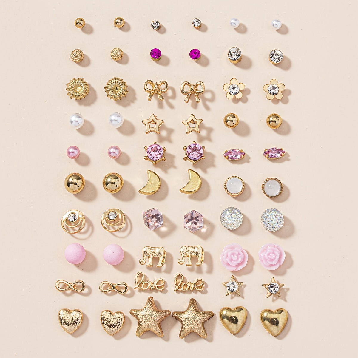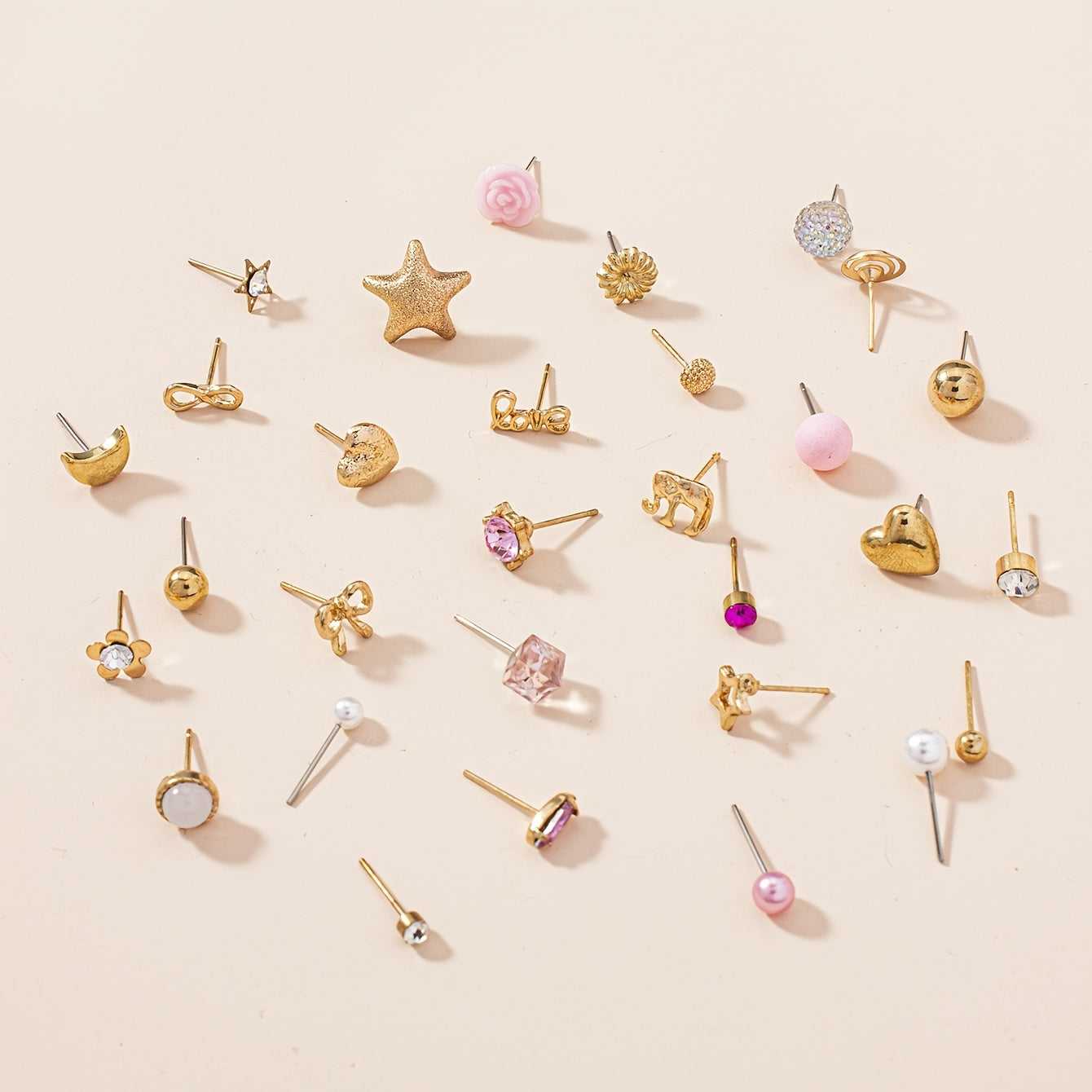 Enhance your style with this charming set of stud earrings featuring pink crystal bows, elephants, small flowers, faux pearls, and love stars.