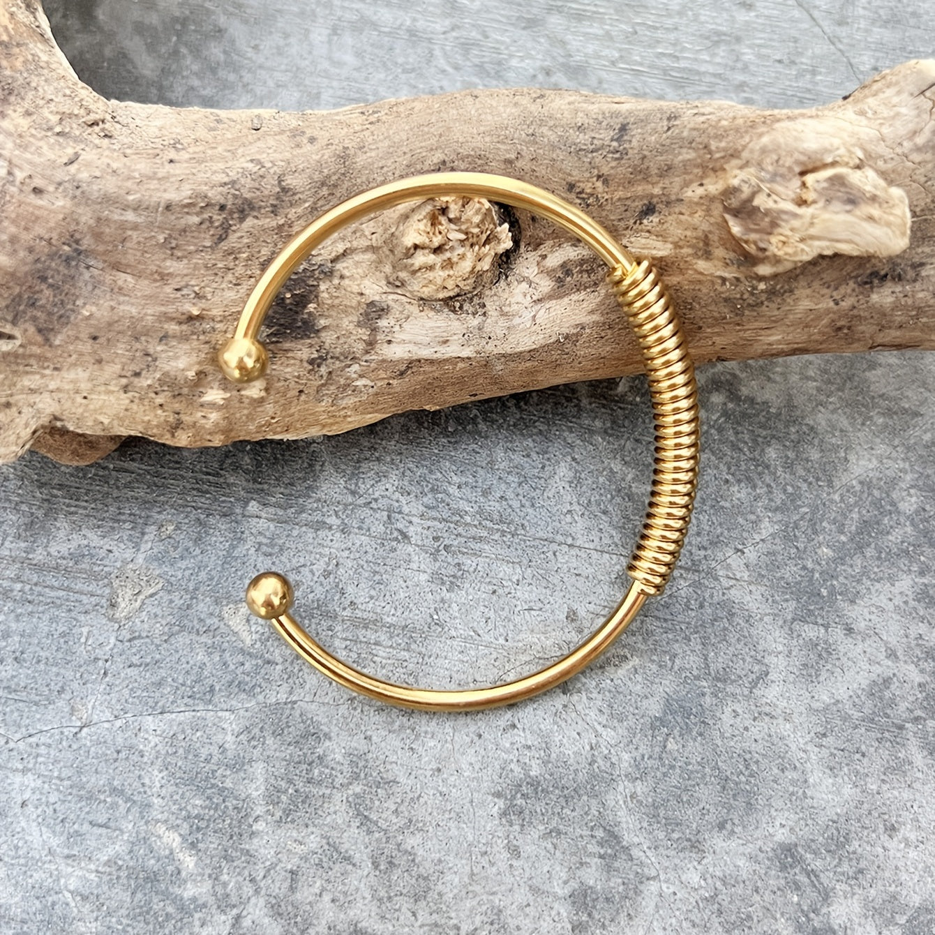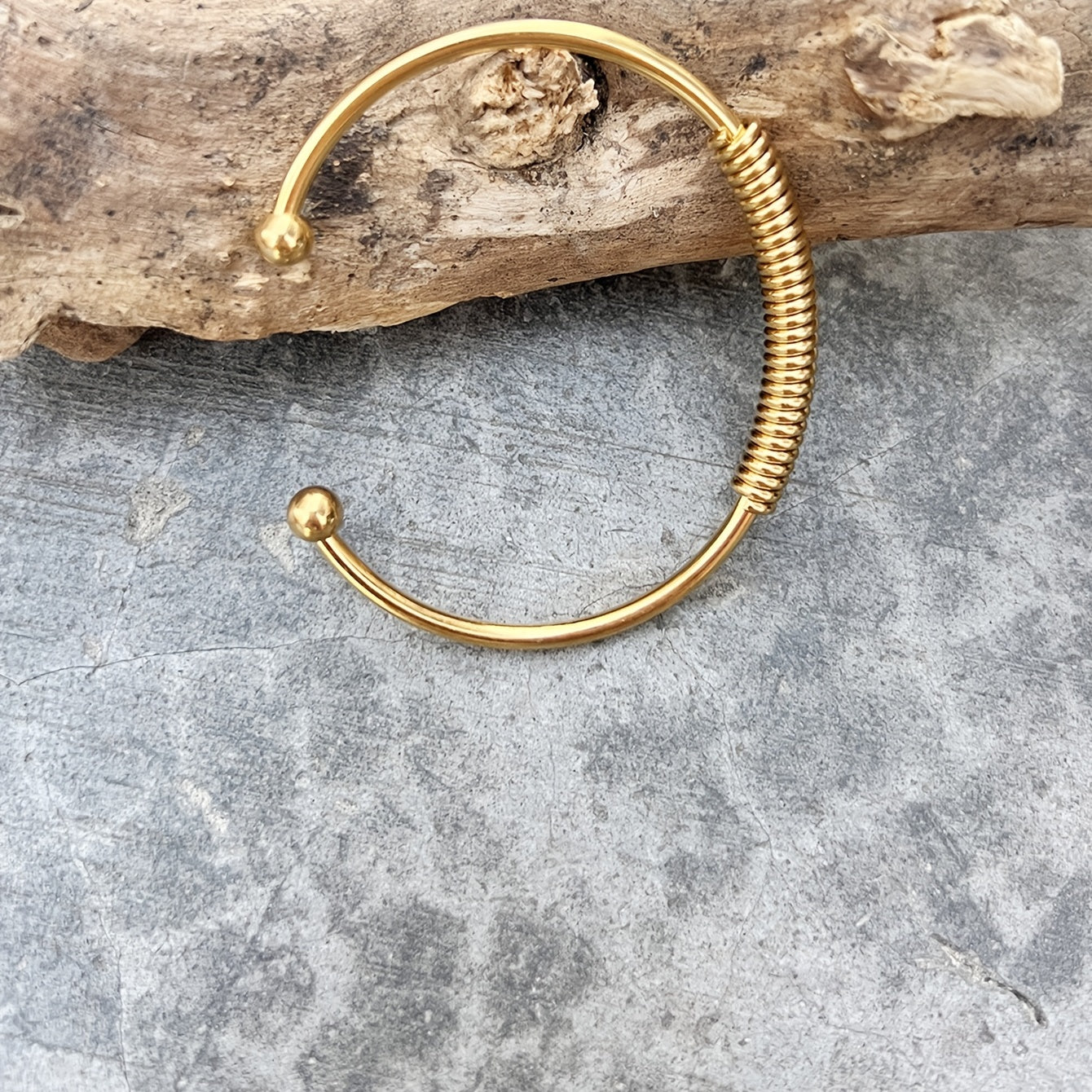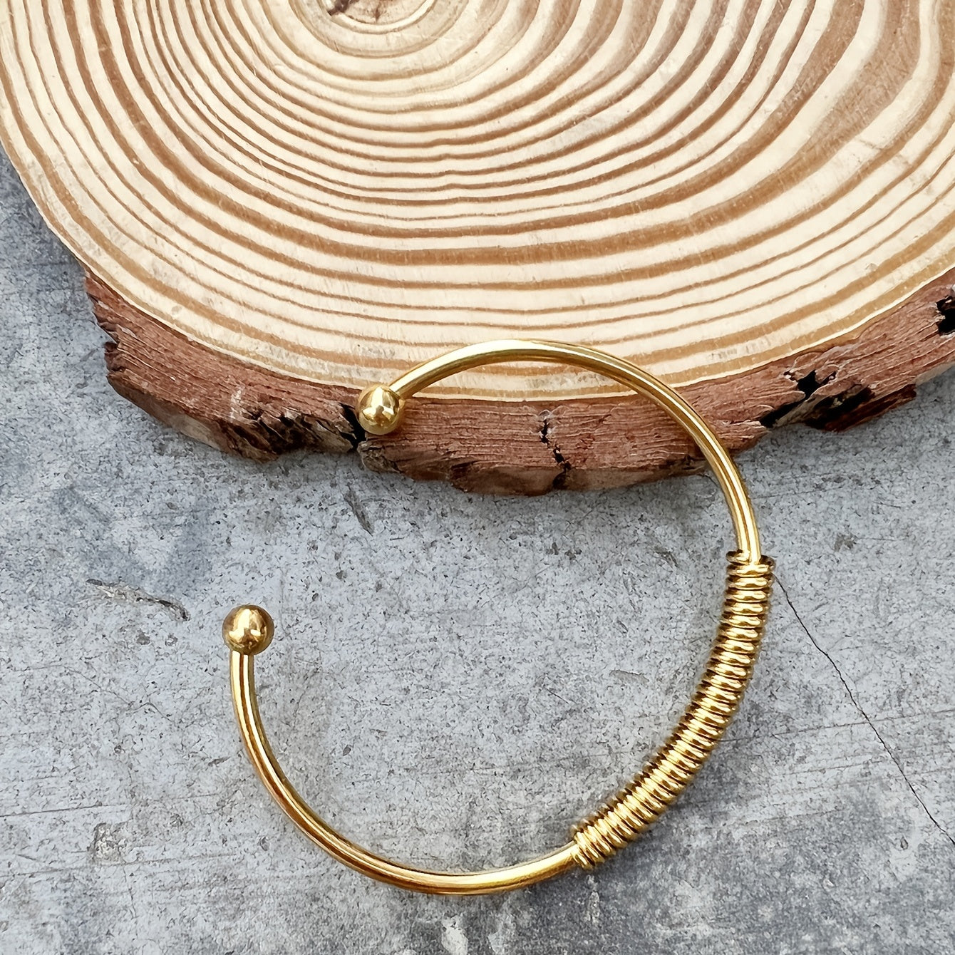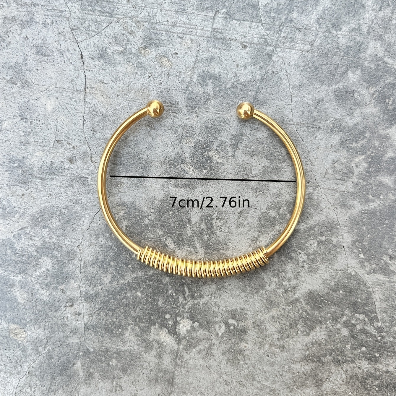 Elegant 304 stainless steel bangle bracelet with golden spring design. Perfect for adding a touch of glamour to any outfit. Adjustable to fit various wrist sizes.