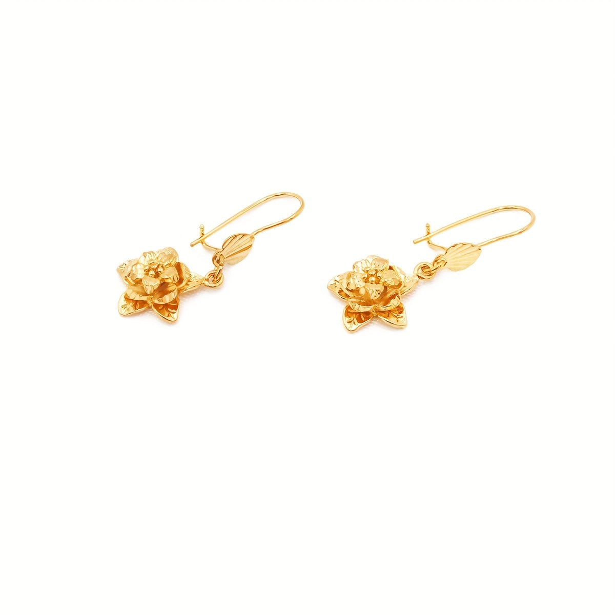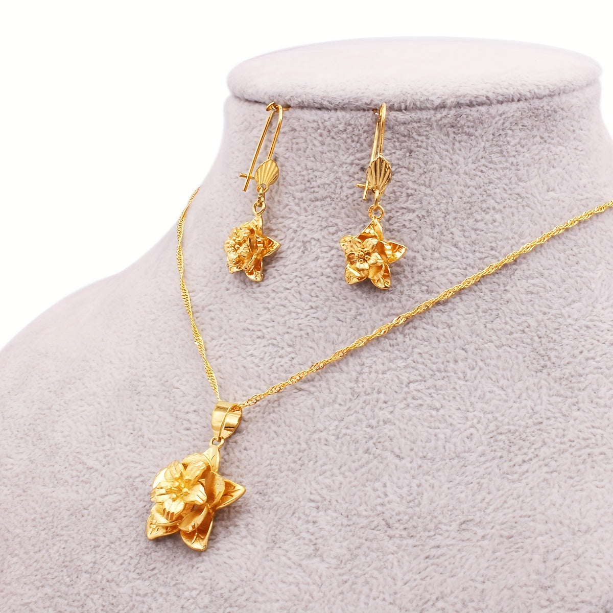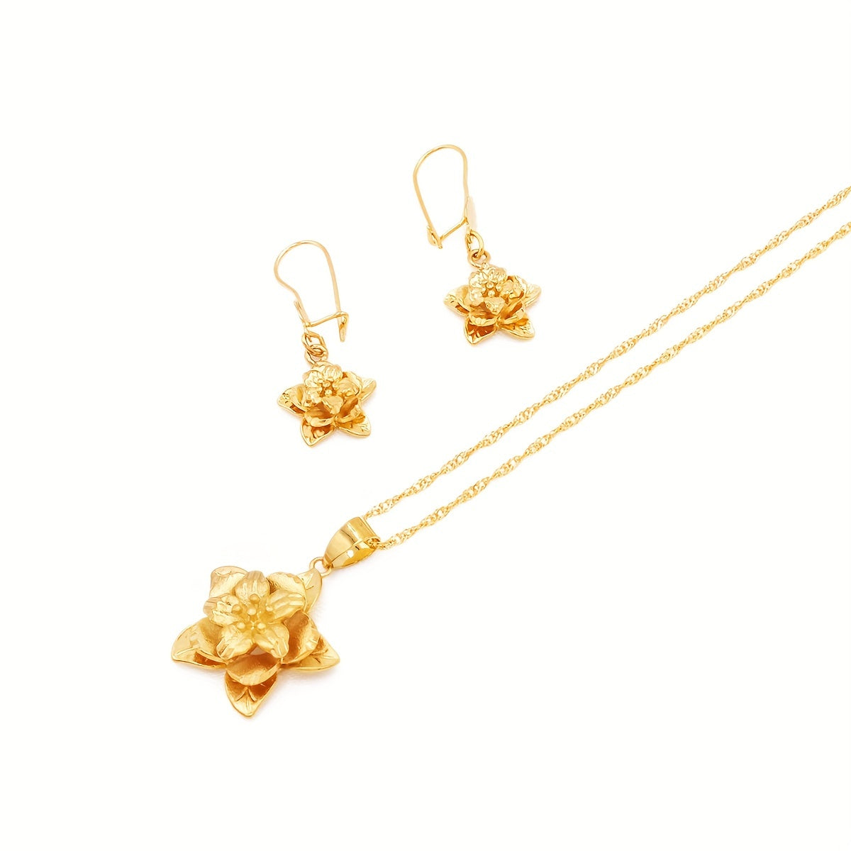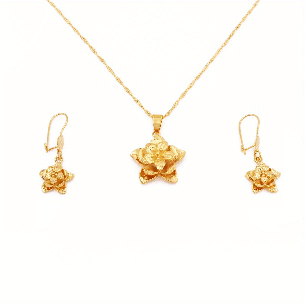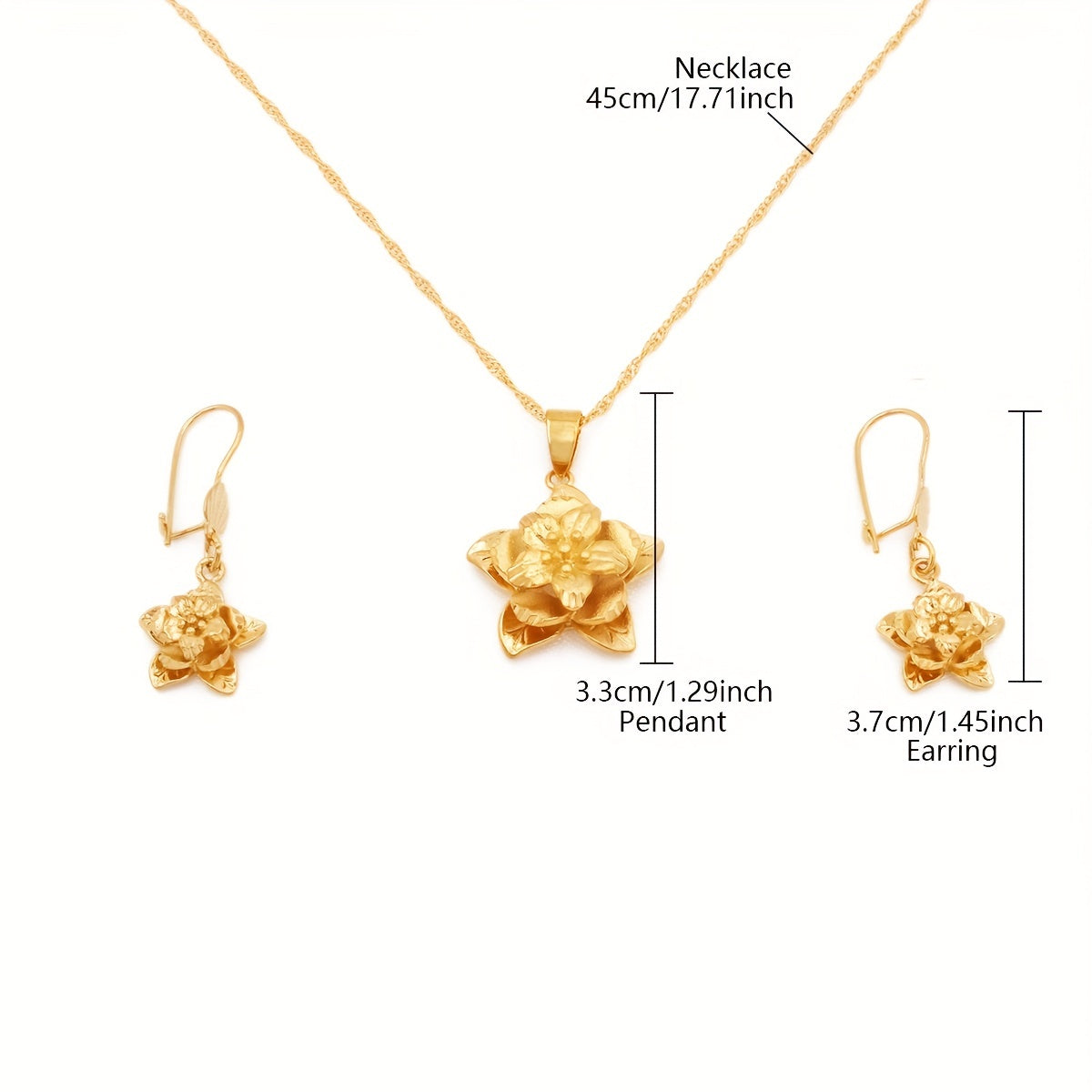 Complete your look with this elegant jewelry set featuring a special flower design symbolizing beauty. Made with 18k gold plating, this dainty set is perfect for parties.