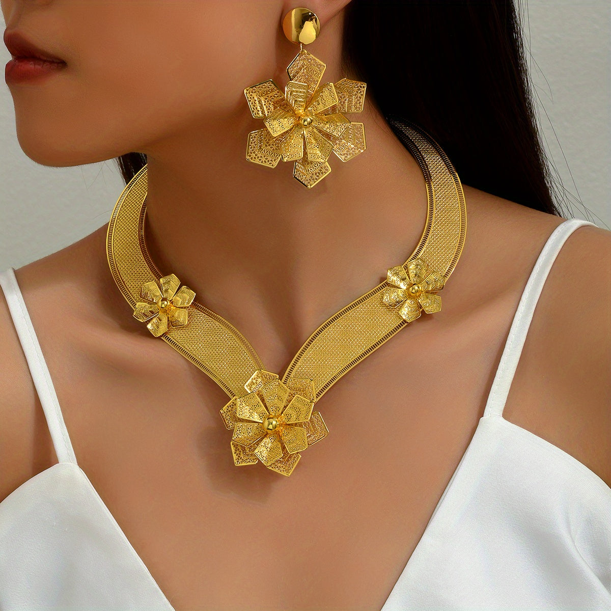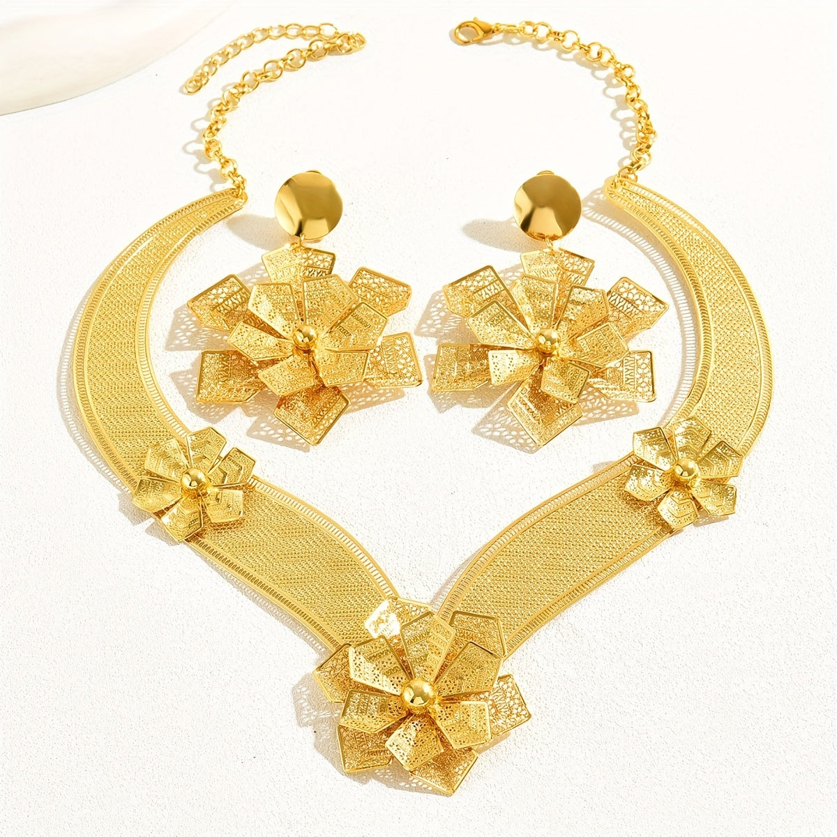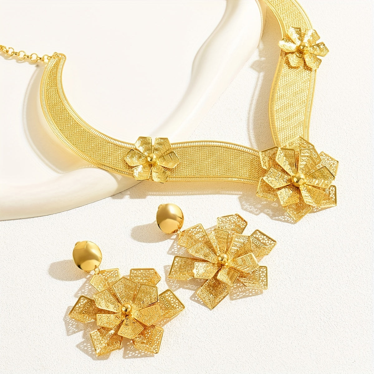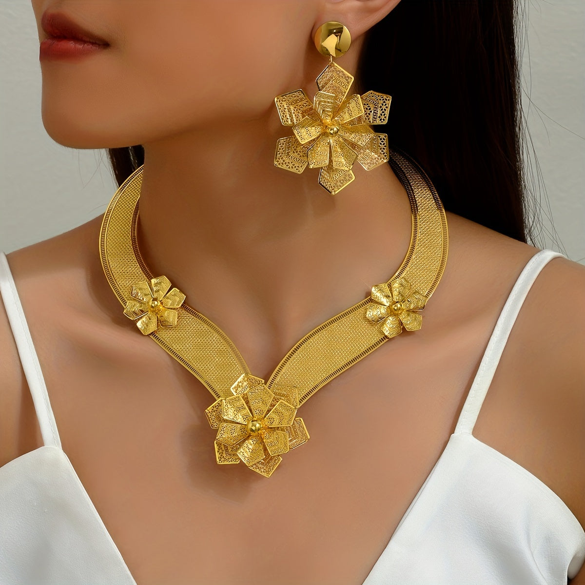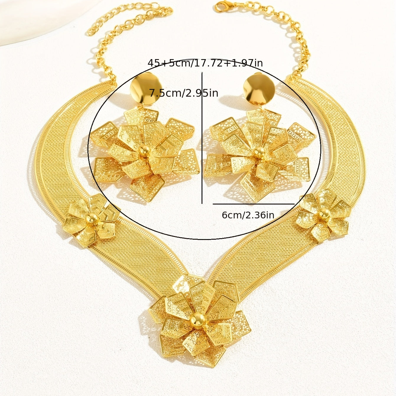 This stunning jewelry set includes 3 earrings and a necklace, perfect for a bride's wedding or as a Christmas gift for a female. The set features an elegant flower design and is plated with 18k gold.