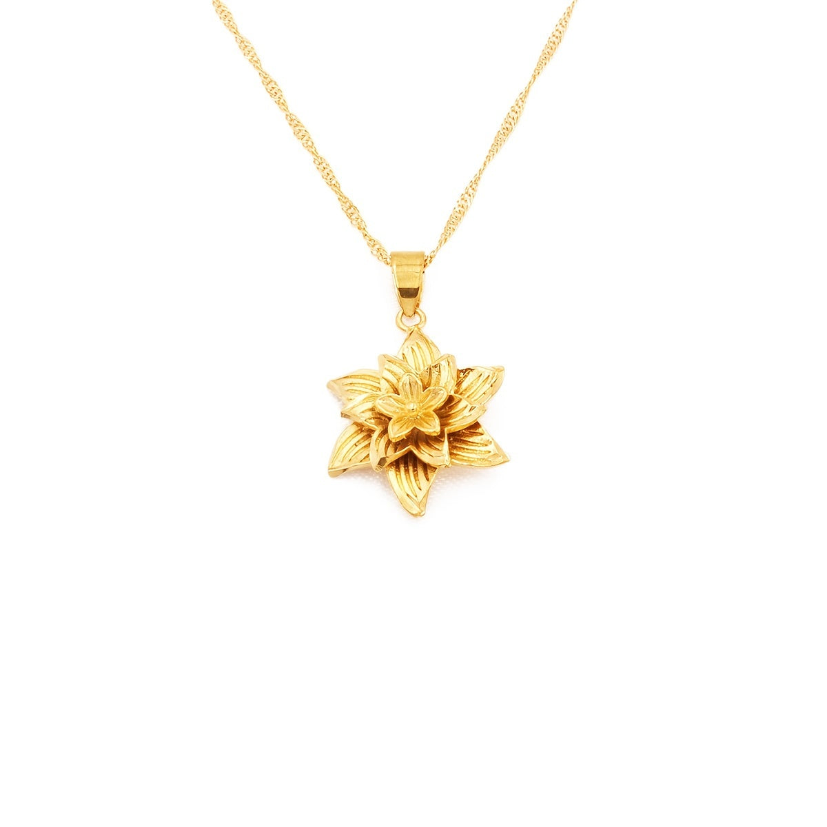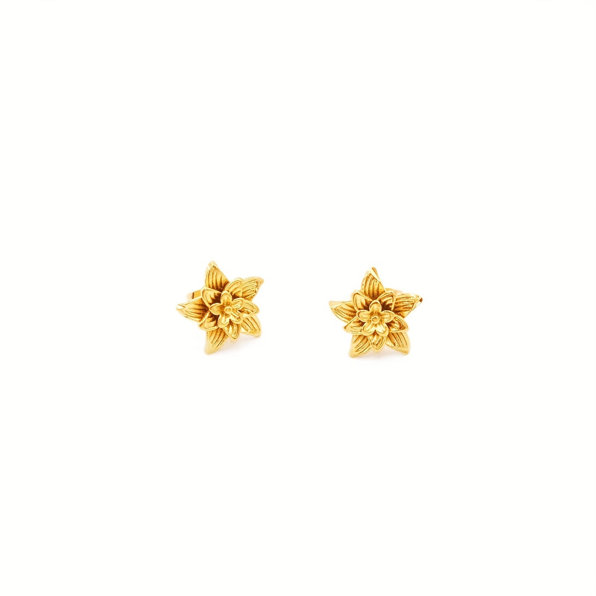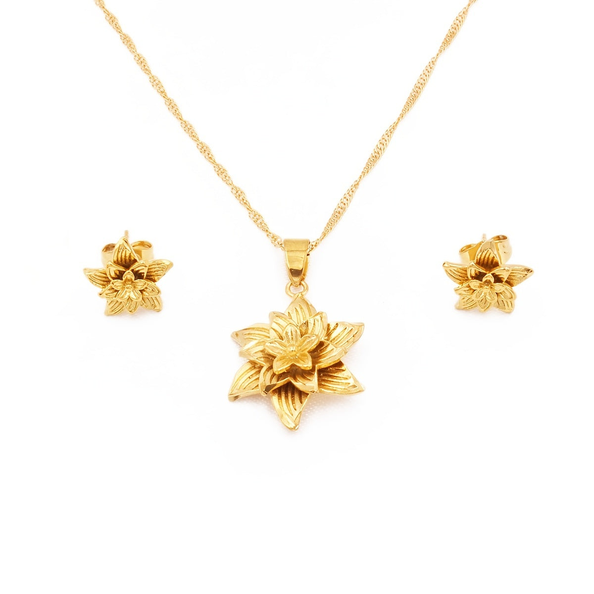 This 3-piece jewelry set includes earrings and a necklace, all featuring a delicate flower design. Made with 18k gold plating, this set is perfect for daily wear and makes a lovely gift for the holidays.