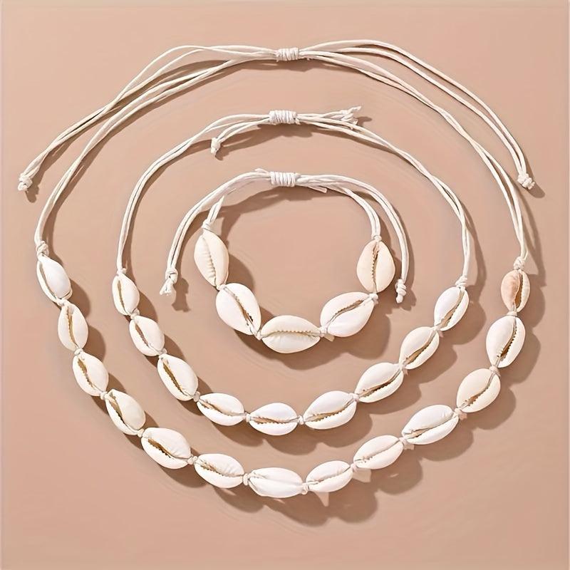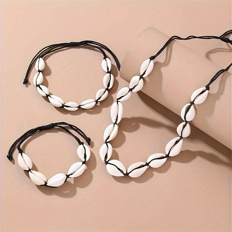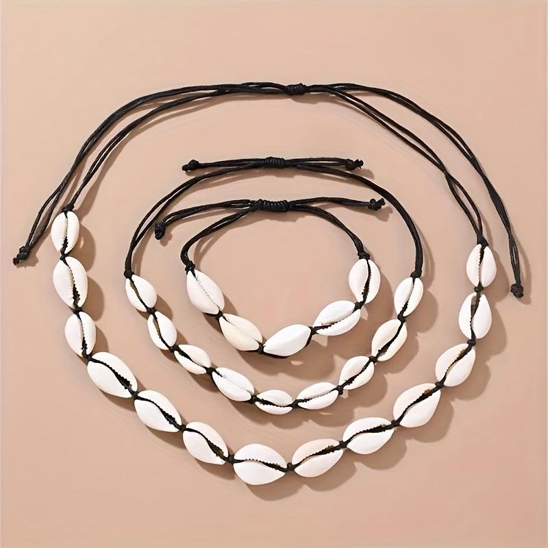 Get this beautiful set of adjustable shell bracelet, necklace, and foot chain suitable for travel and as a gift. Enhance your style with these lovely jewelry accessories.