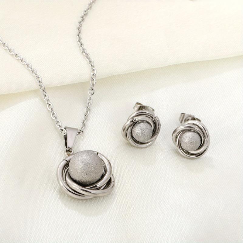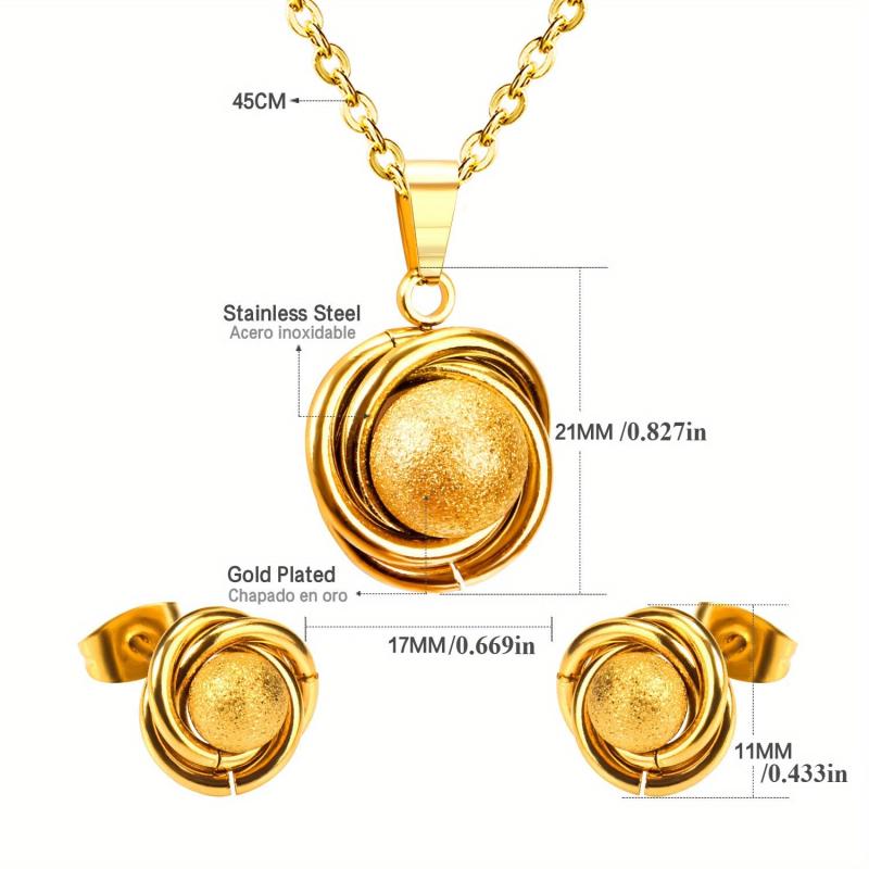 Elegant and trendy 3-piece set featuring round ball pendant necklace and earrings with 18K golden plating. Makes a perfect fashionable and minimalist gift choice.