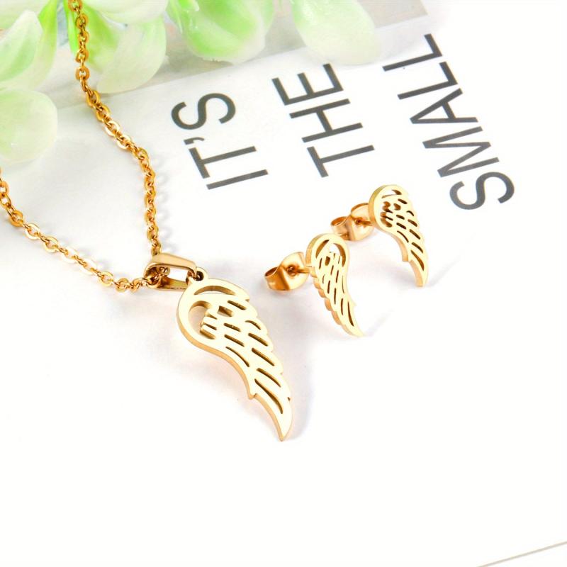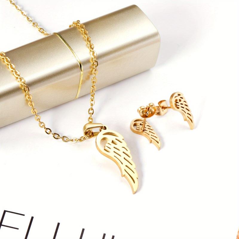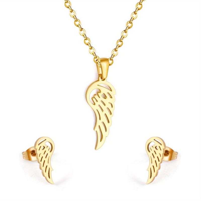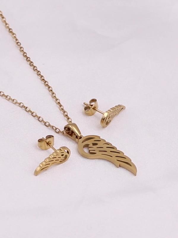 Complete your casual attire with this 3-piece jewelry set. It includes a hollow wing charm chain necklace and matching earrings. Crafted from stainless steel with 18K golden plating, these hypoallergenic studs are perfect for everyday wear.