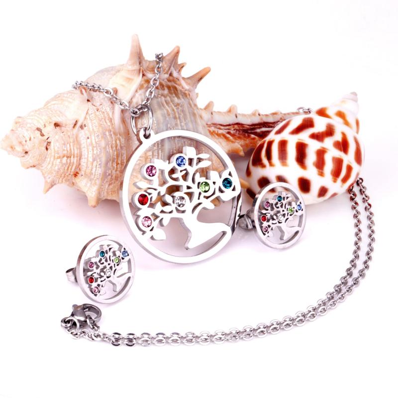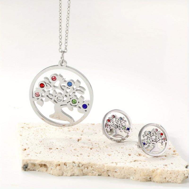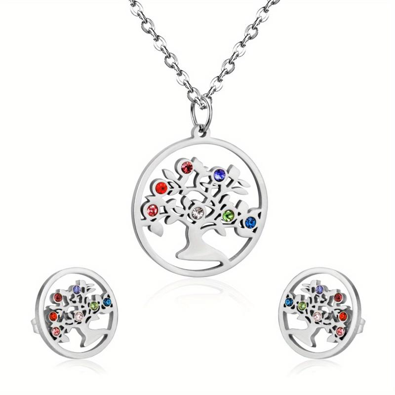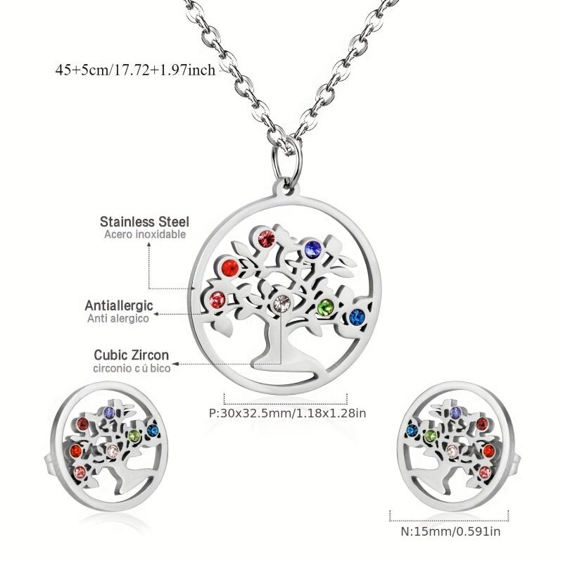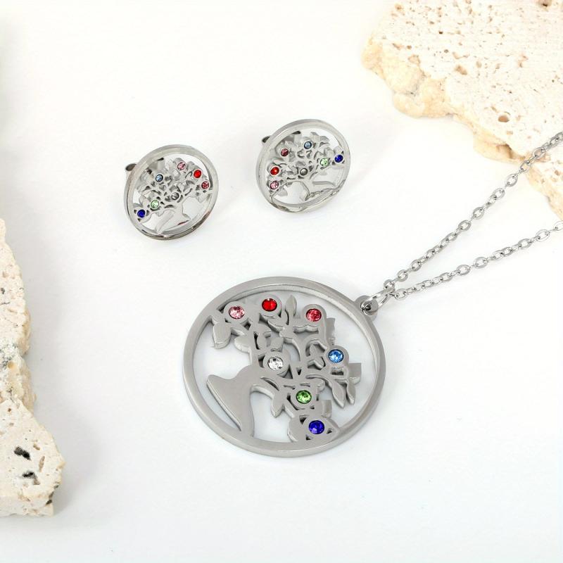 Complete your party or wedding look with this set featuring a tree-shaped pendant necklace and matching earrings adorned with colorful synthetic diamonds.