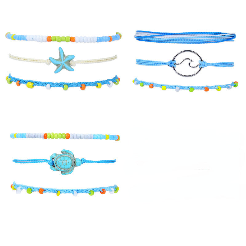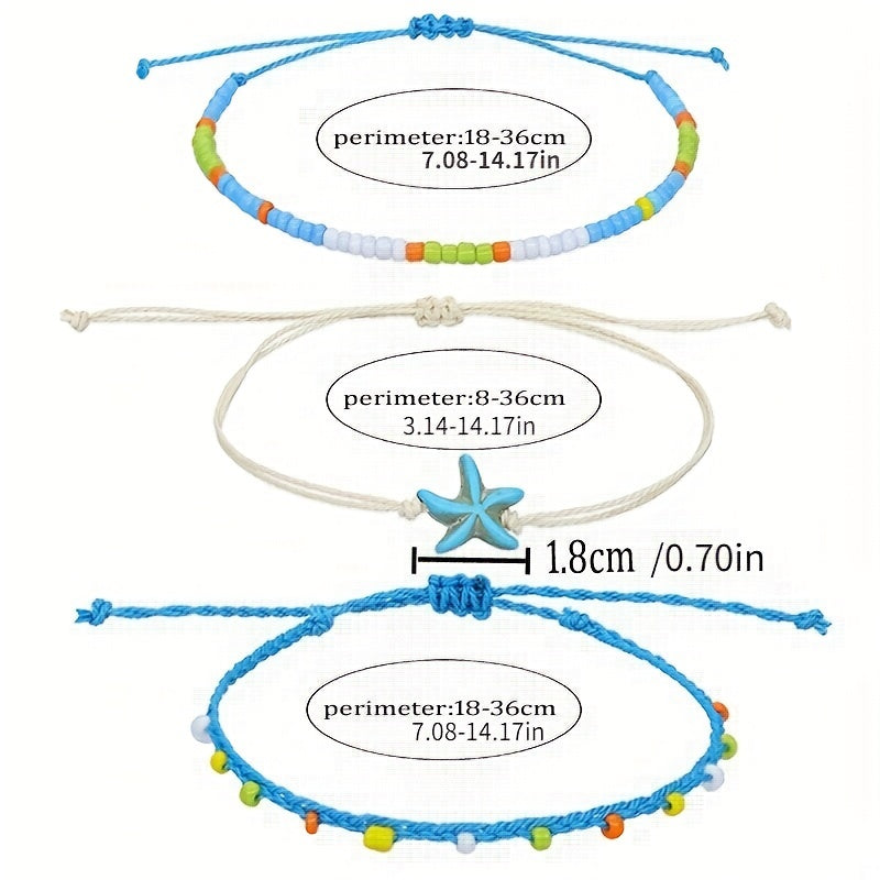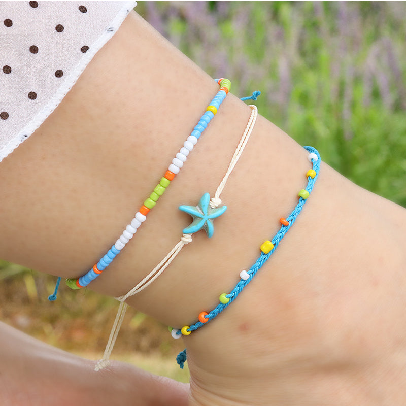 This set includes 3 waterproof wax thread anklets with colorful rice beads, perfect for stacking and adding a pop of color to your ankle jewelry collection.