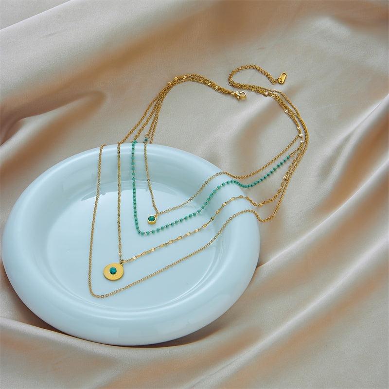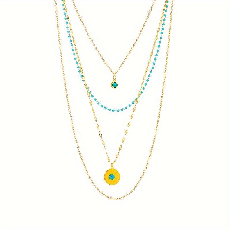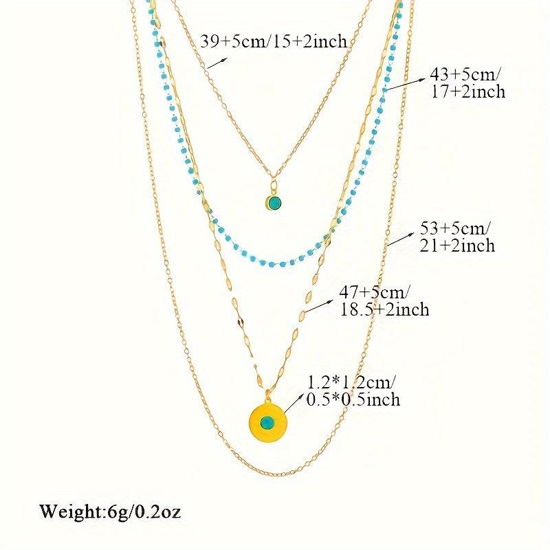 Elevate your style with this stunning 4-layer necklace featuring double turquoise and golden tone resin pendants. Made of high-quality stainless steel, this necklace is a perfect accessory for any occasion.
