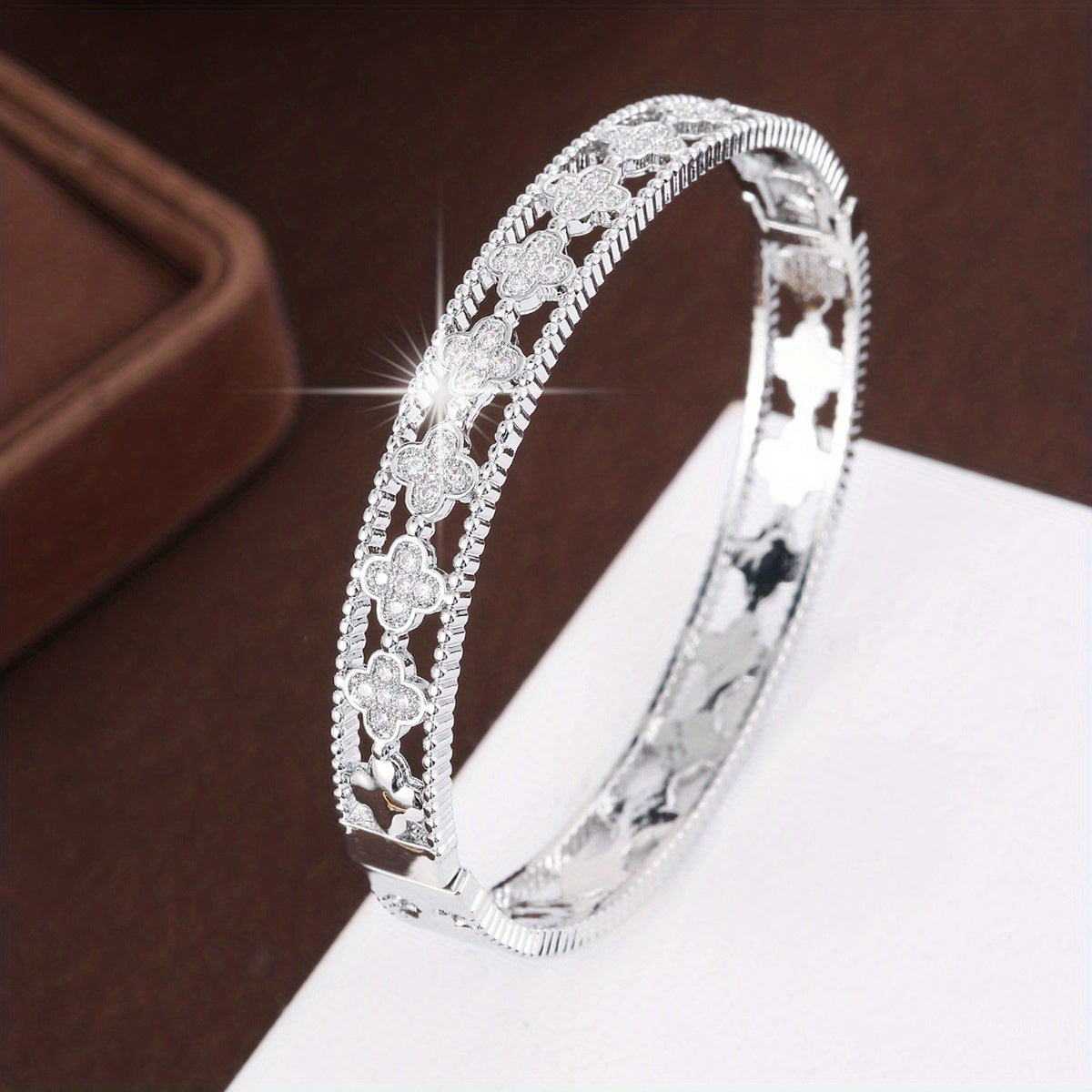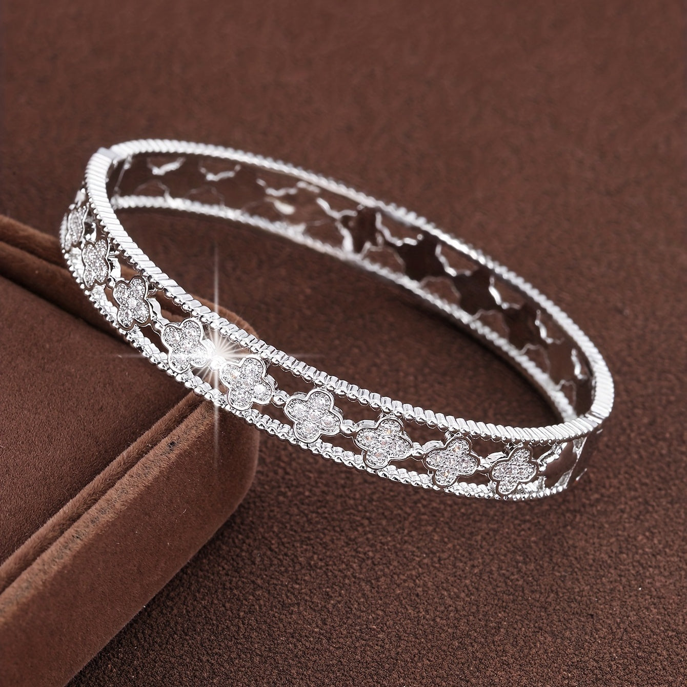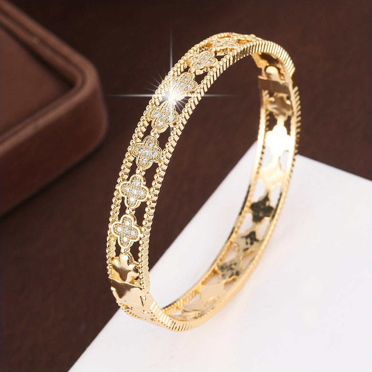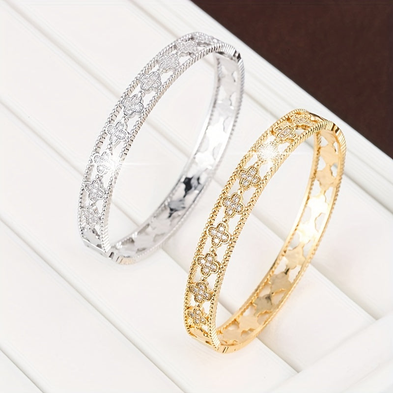 Add a touch of luck and sparkle with this 4 leaf clover micro zircon bangle. Golden 18K plated for a luxurious look.