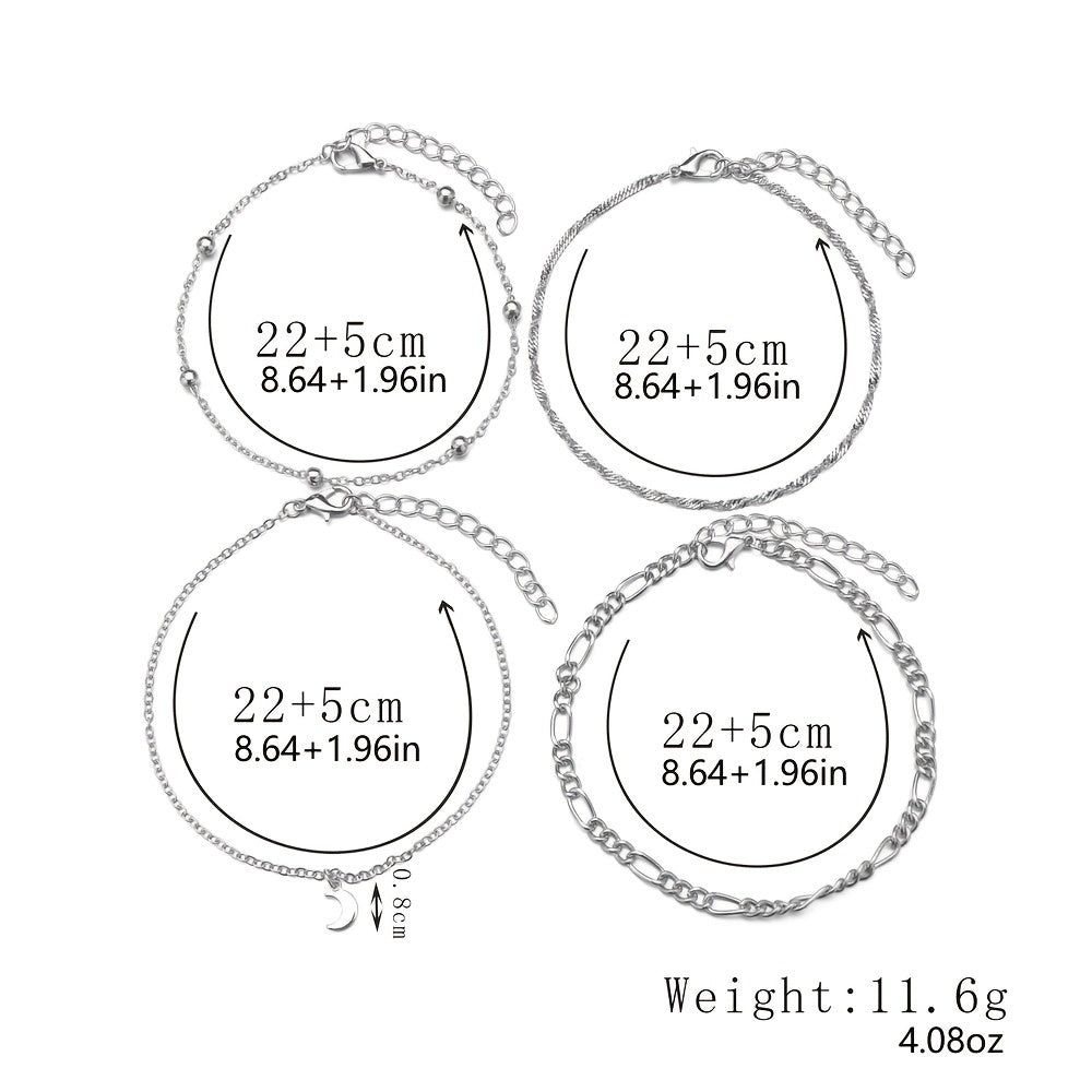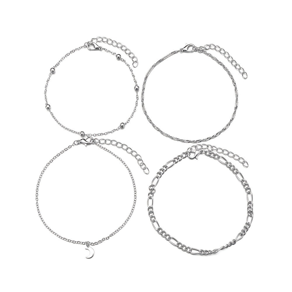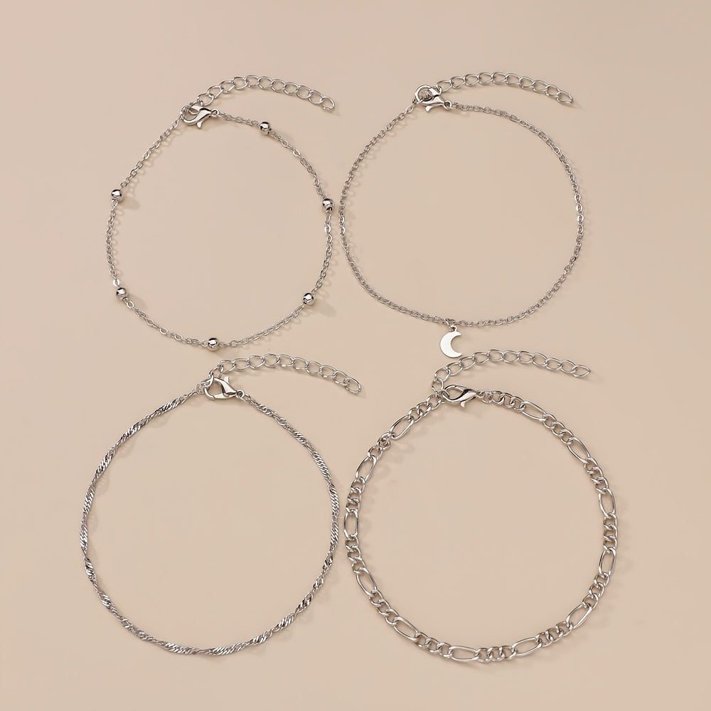 Enhance your ankle with this set of 4 moon-shaped pendant chain anklets made of high-quality alloy. Stackable design for a trendy look.