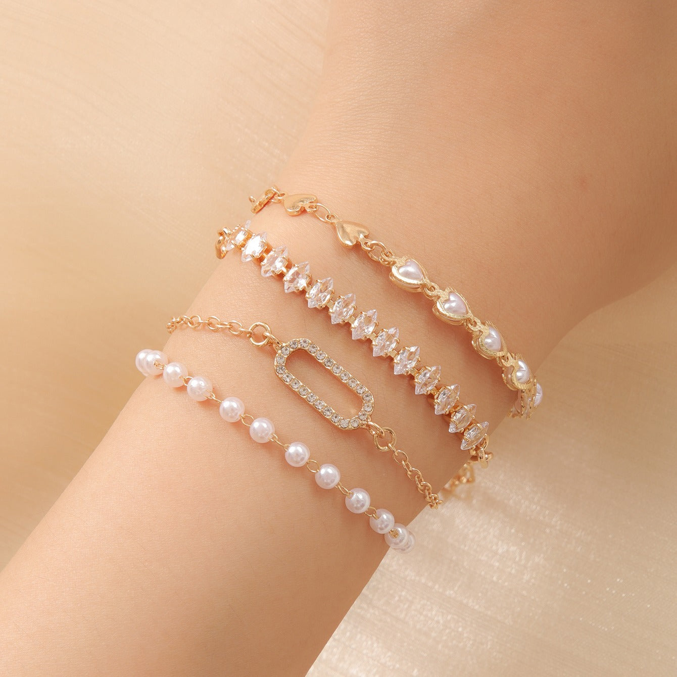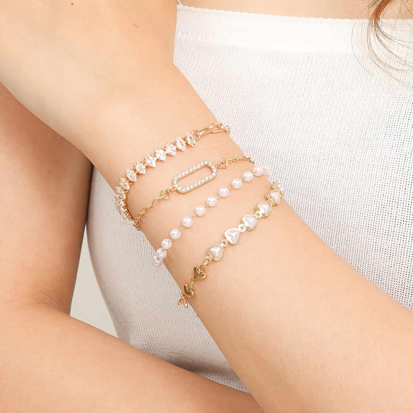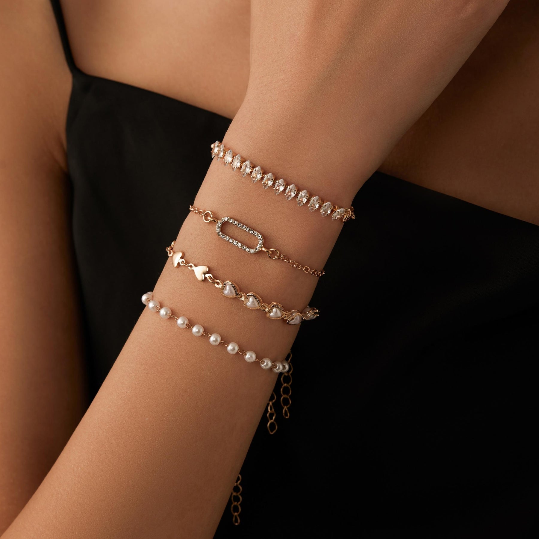 Elevate your beach look with this 4-piece beaded chain bracelet set. Each bracelet features a unique design with faux pearls and zircon beads, perfect for adding a touch of sparkle to your summer outfits. The elastic design ensures a comfortable fit for all wrist sizes.