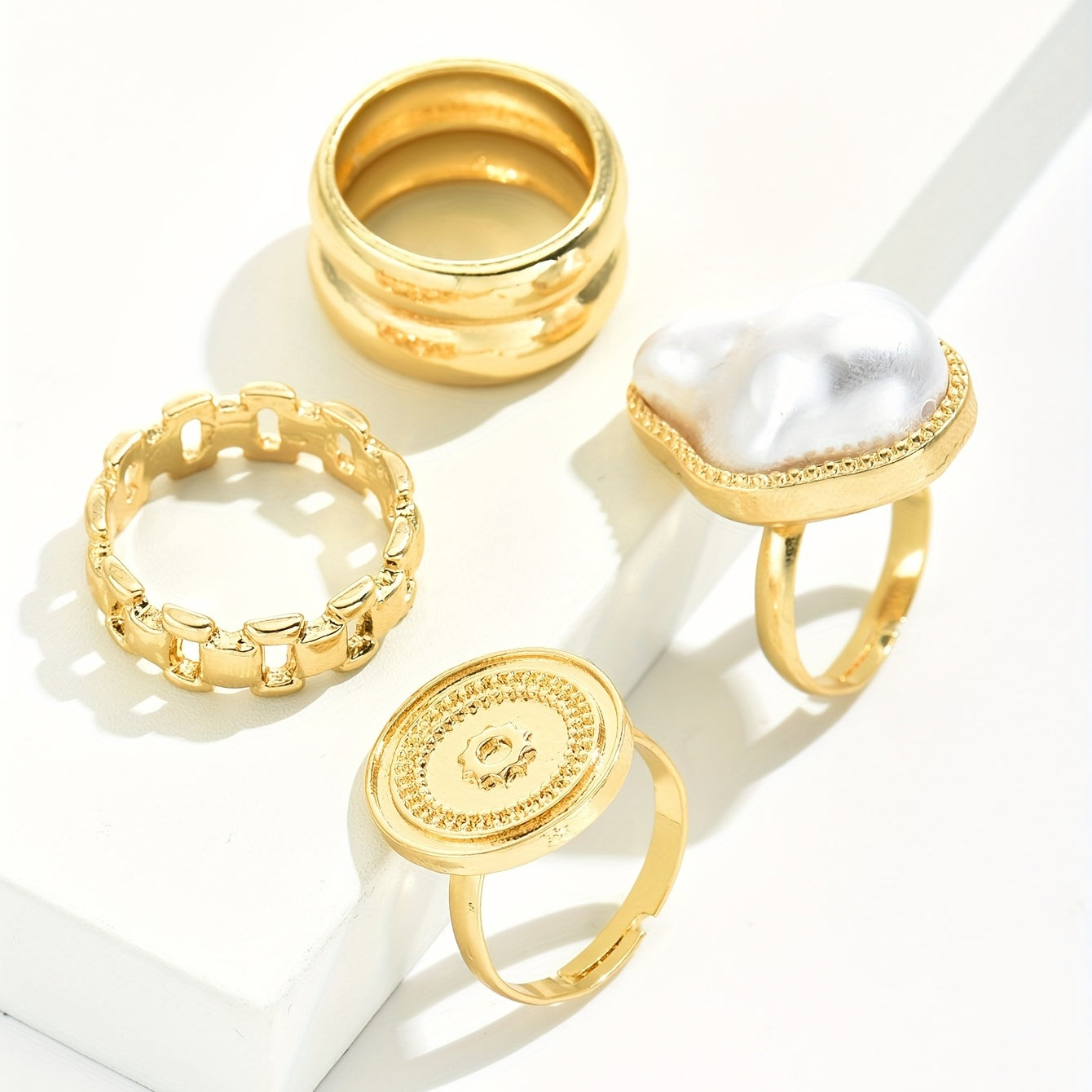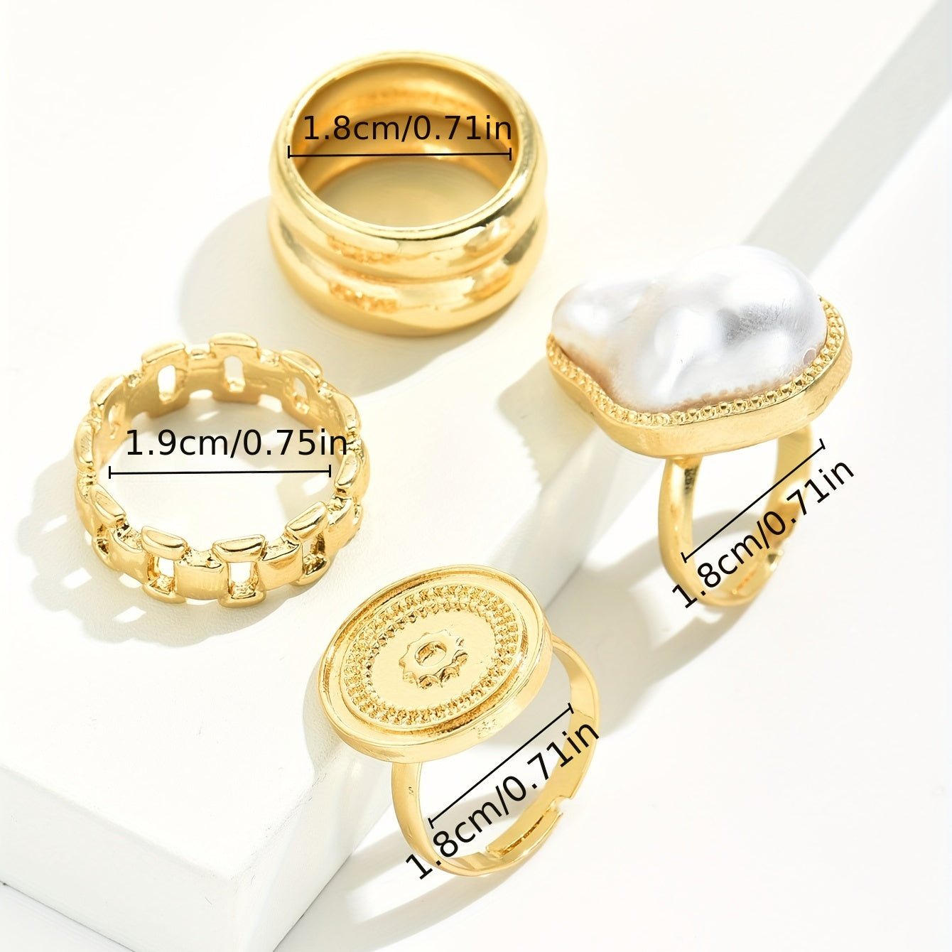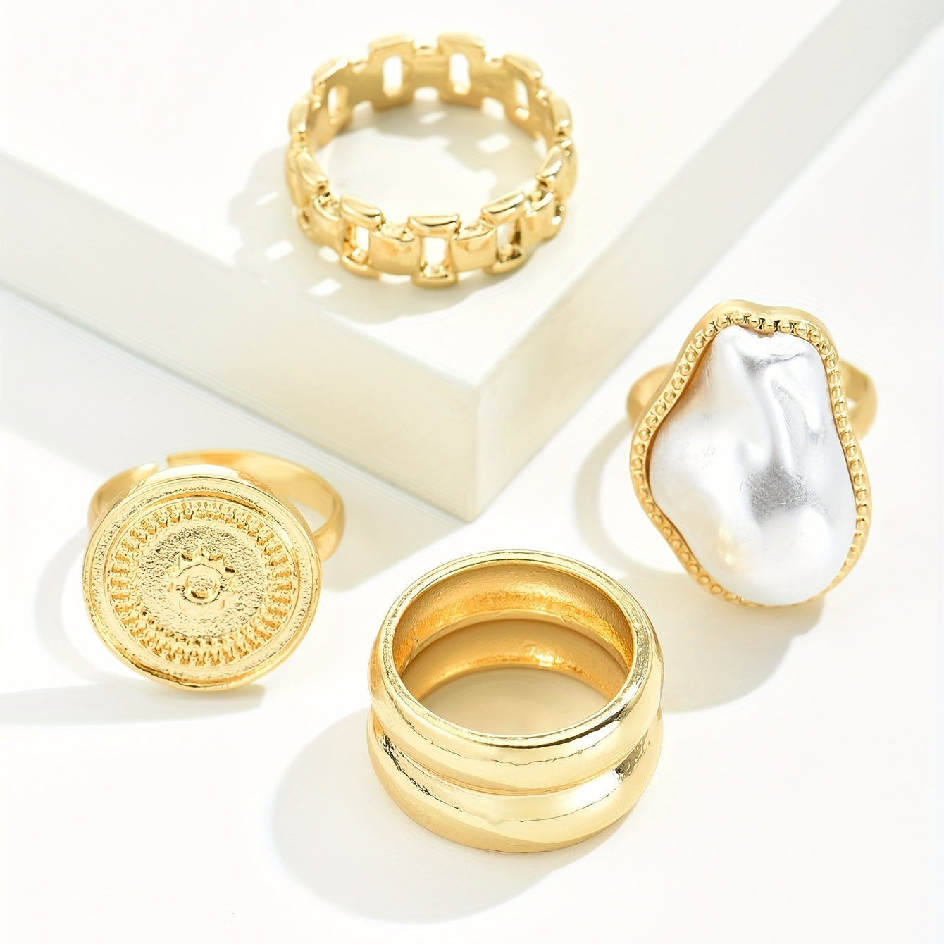 Elegantly designed set of 4 stackable rings with inlaid faux pearls. Perfect as a gift for a loved one or to elevate your own style.