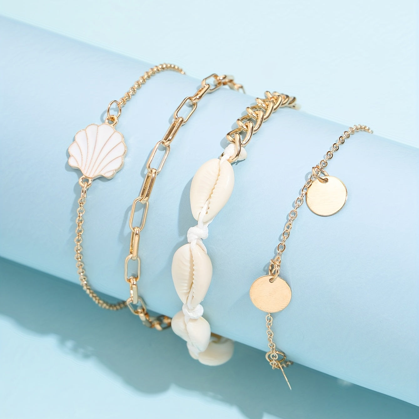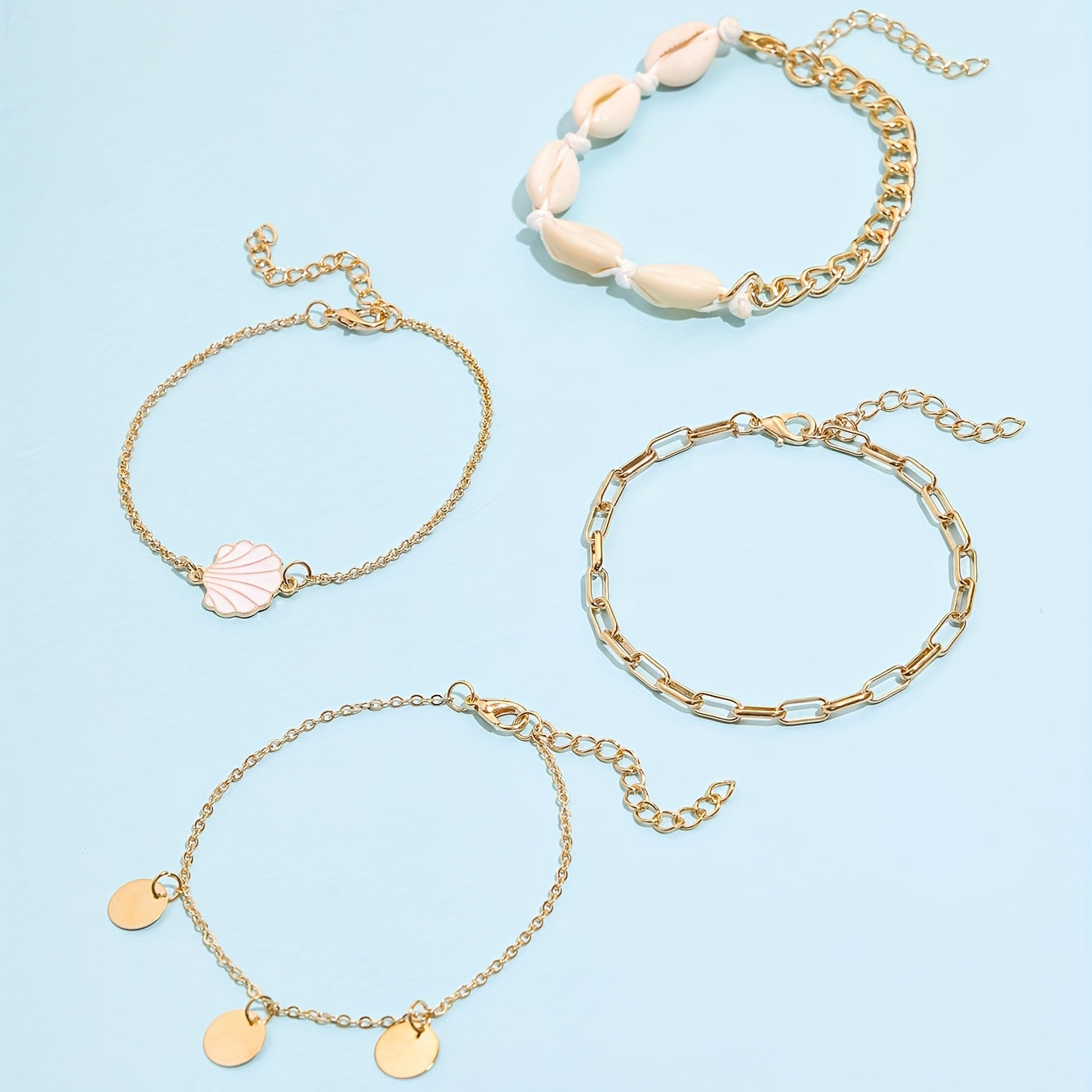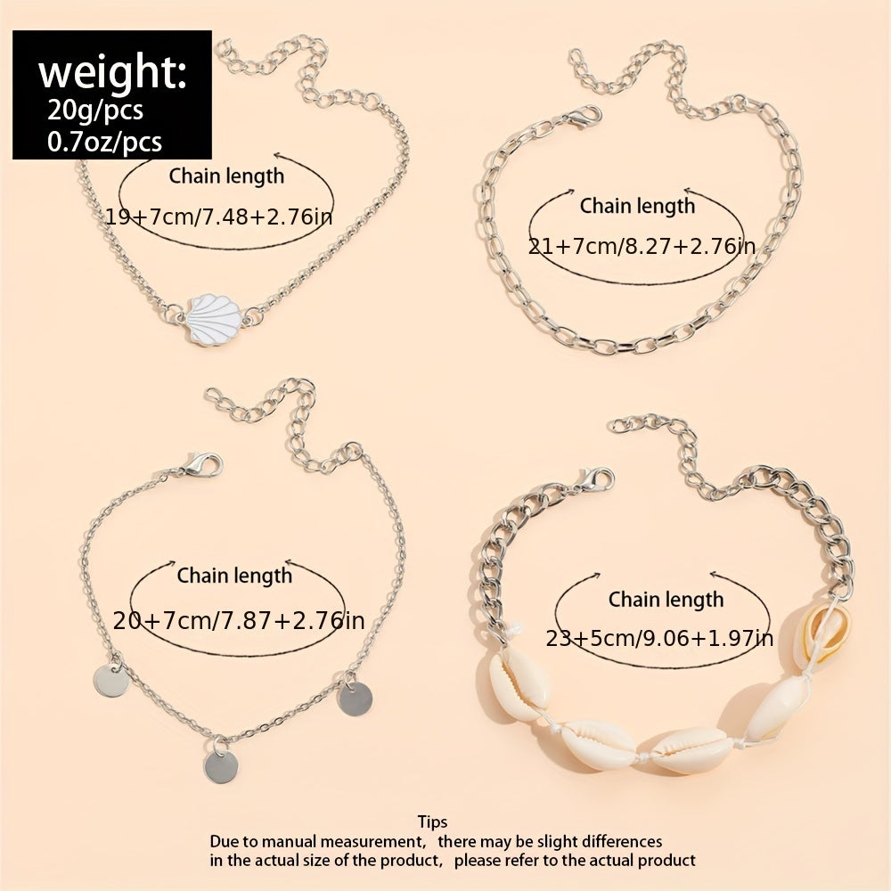 Elevate your boho look with this set of 4 tassel chain anklets featuring shell-shaped beads. Perfect for beach days or summer outfits.