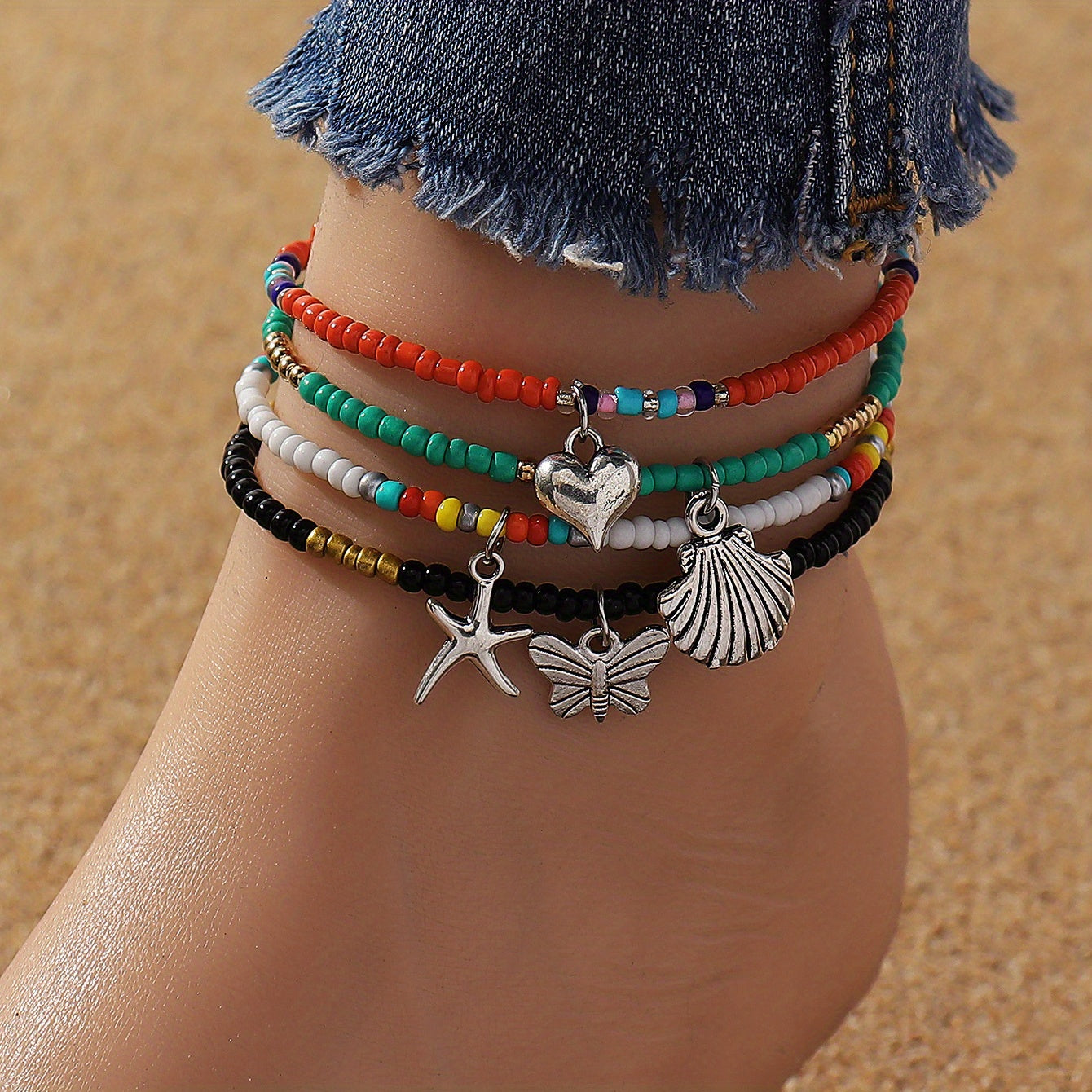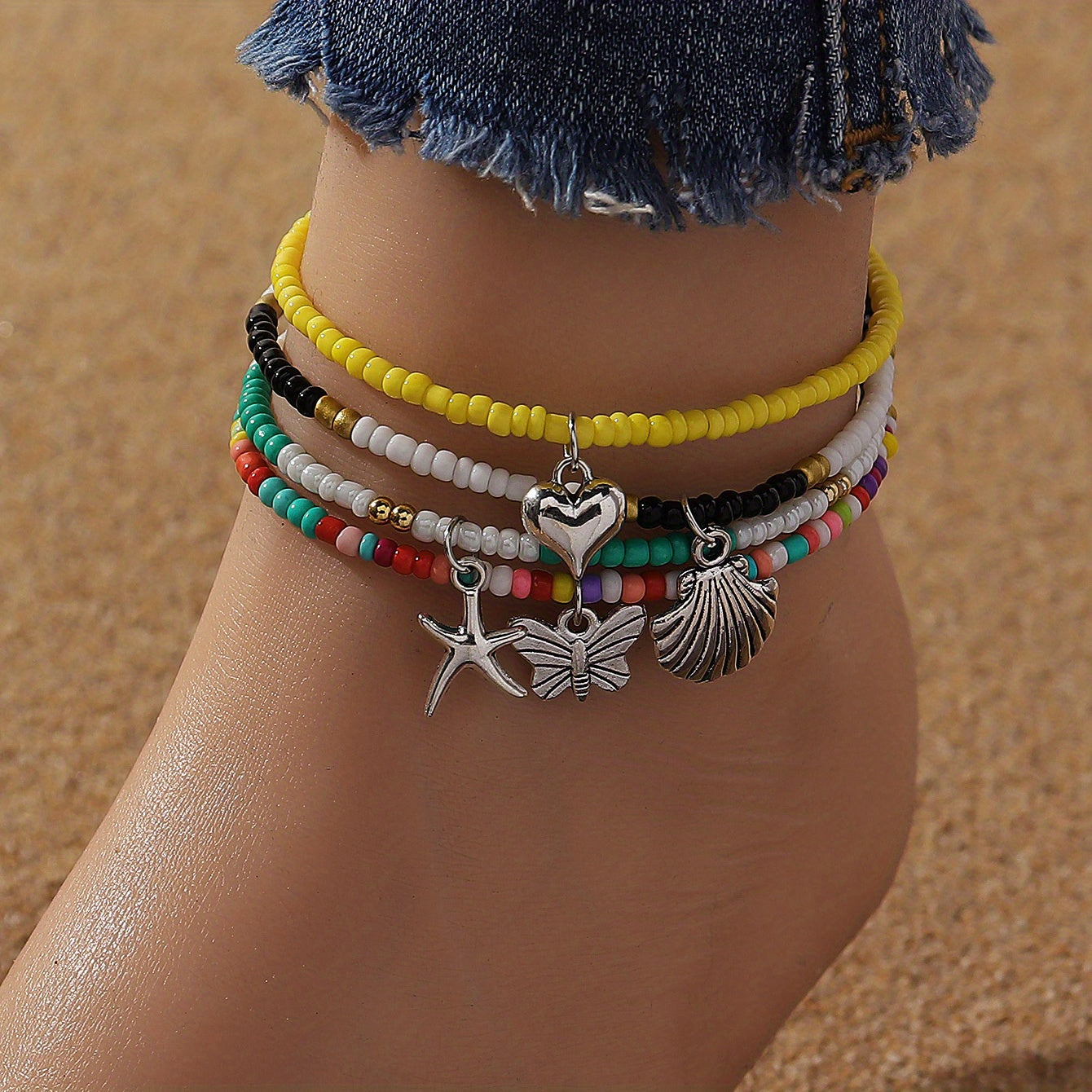 Add a touch of summer beach vibes with this set of 4 beaded ankle bracelets. The colorful rice beads and adjustable chain make these anklets perfect for any occasion.