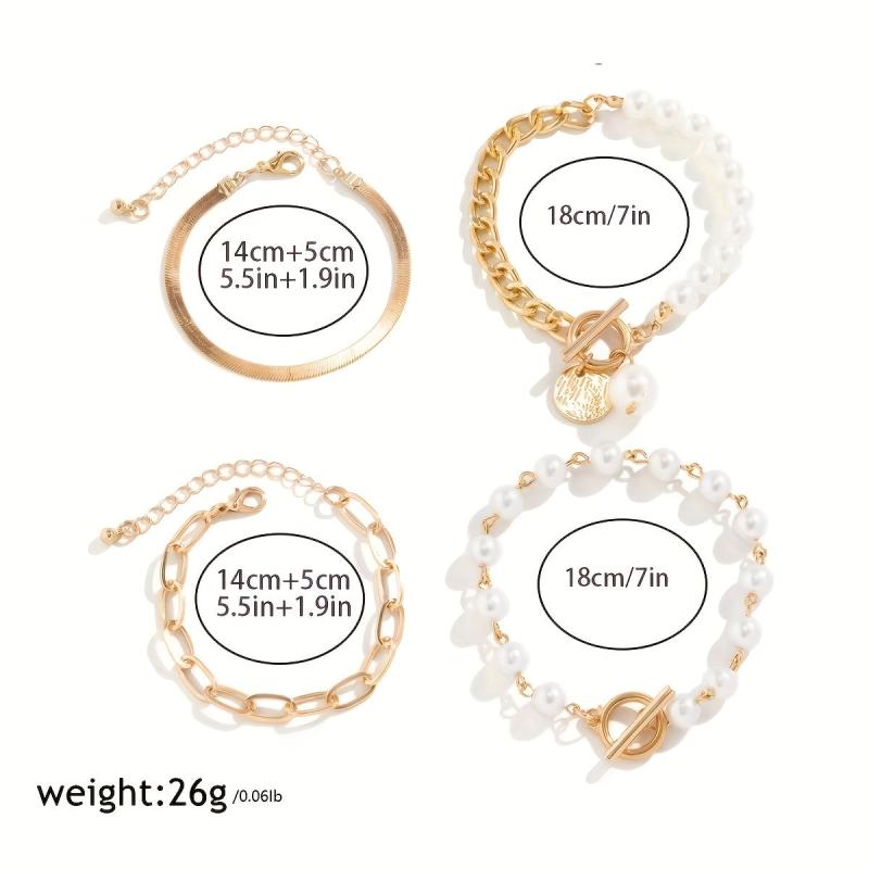 Enhance your look with this stunning 4-piece bracelet set featuring golden chain and bead designs. Made of high-quality materials with 18K gold plating, these bracelets are perfect for adding a touch of elegance to your outfit.