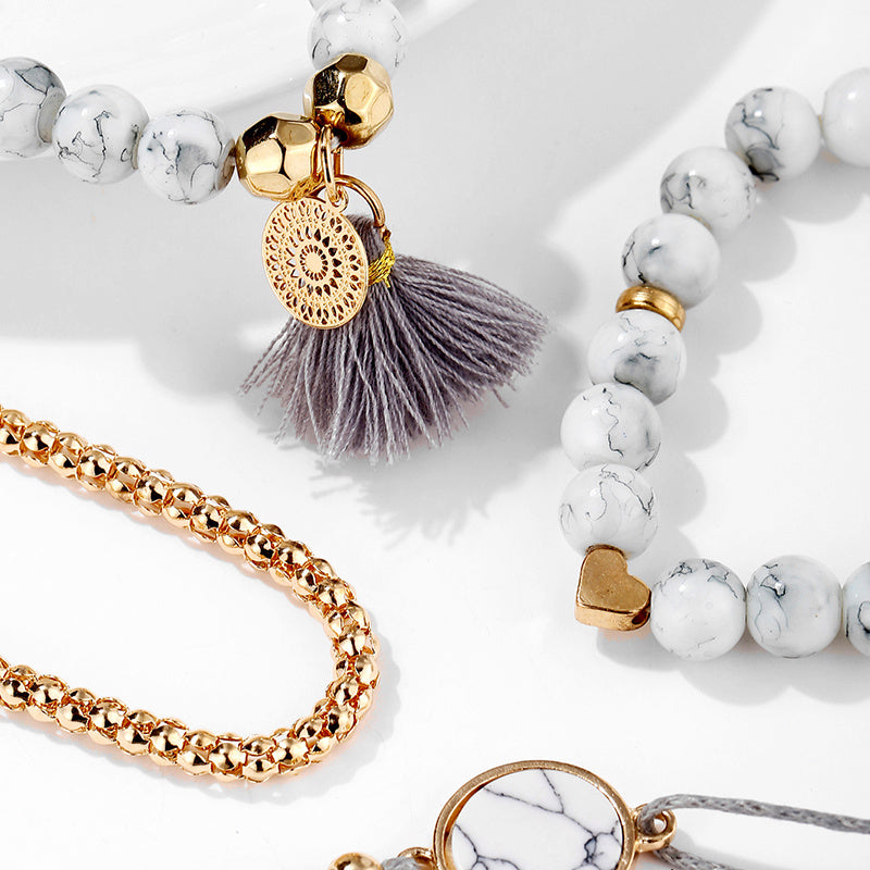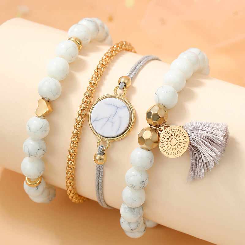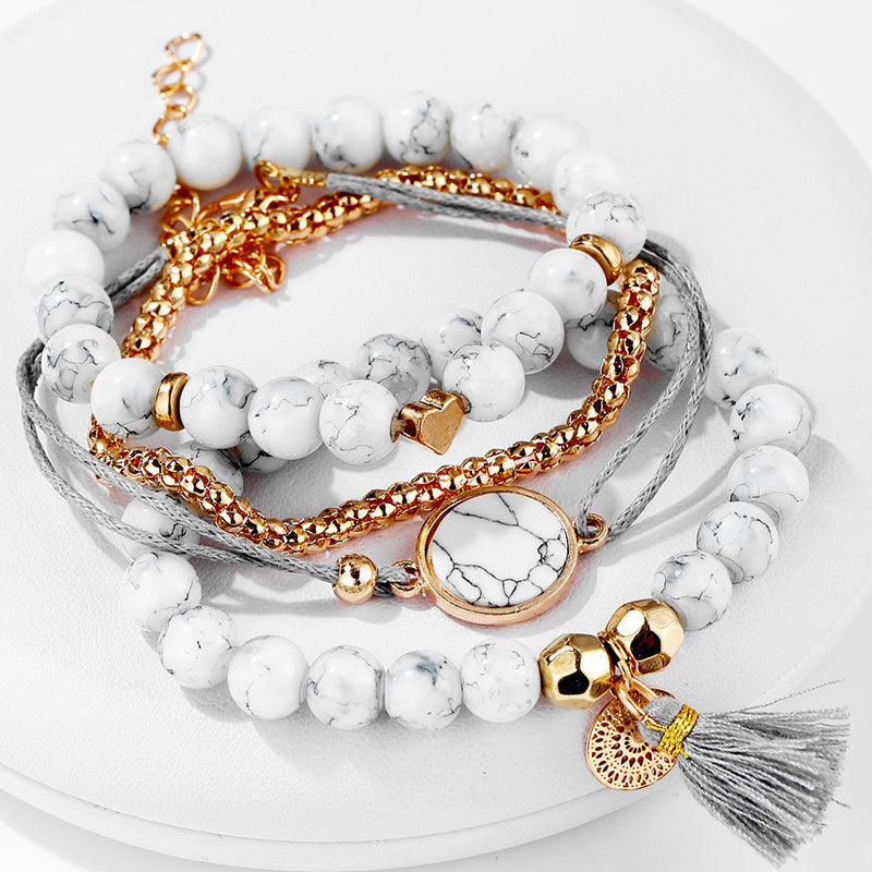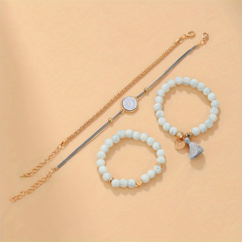 Enhance your boho look with this set of 4 turquoise tassel bracelets. Perfect for adding a pop of color to your outfit.