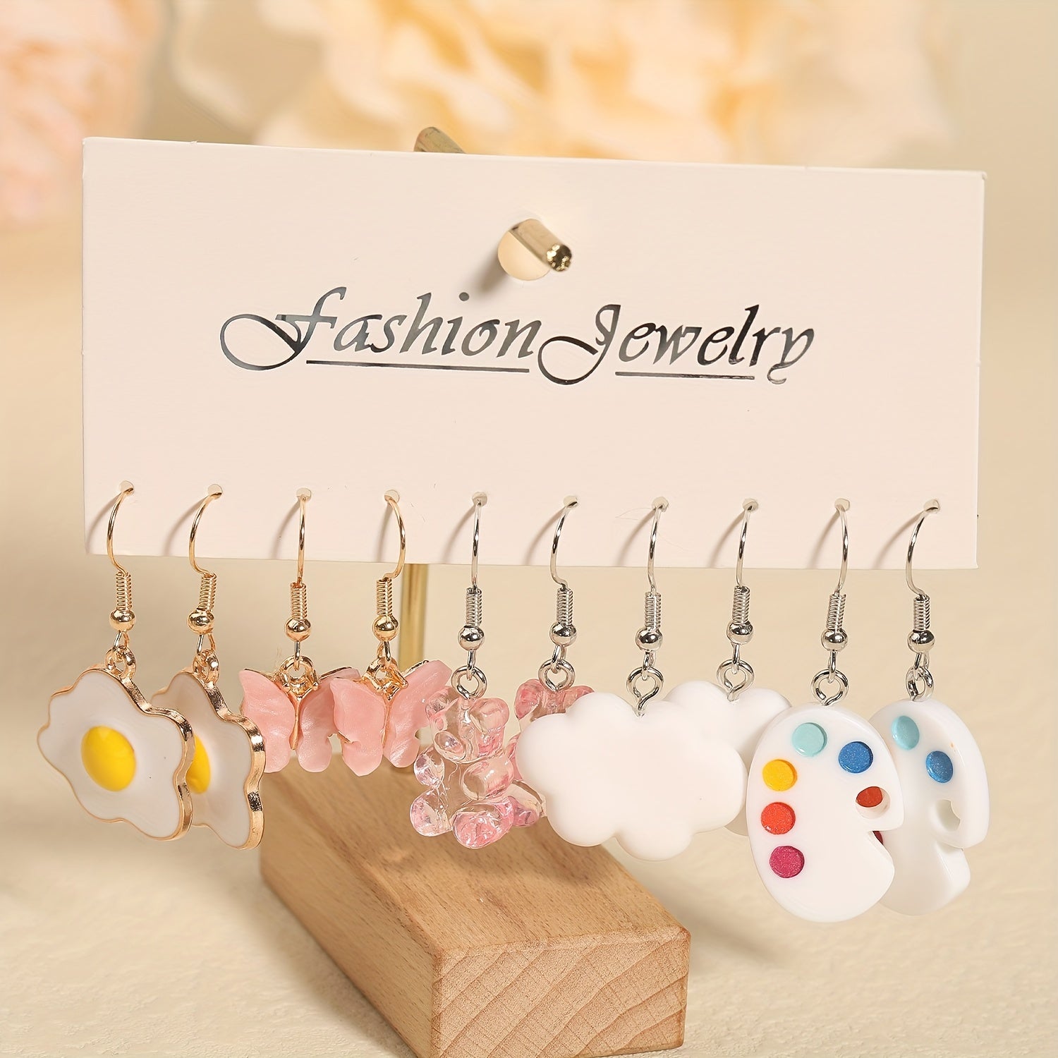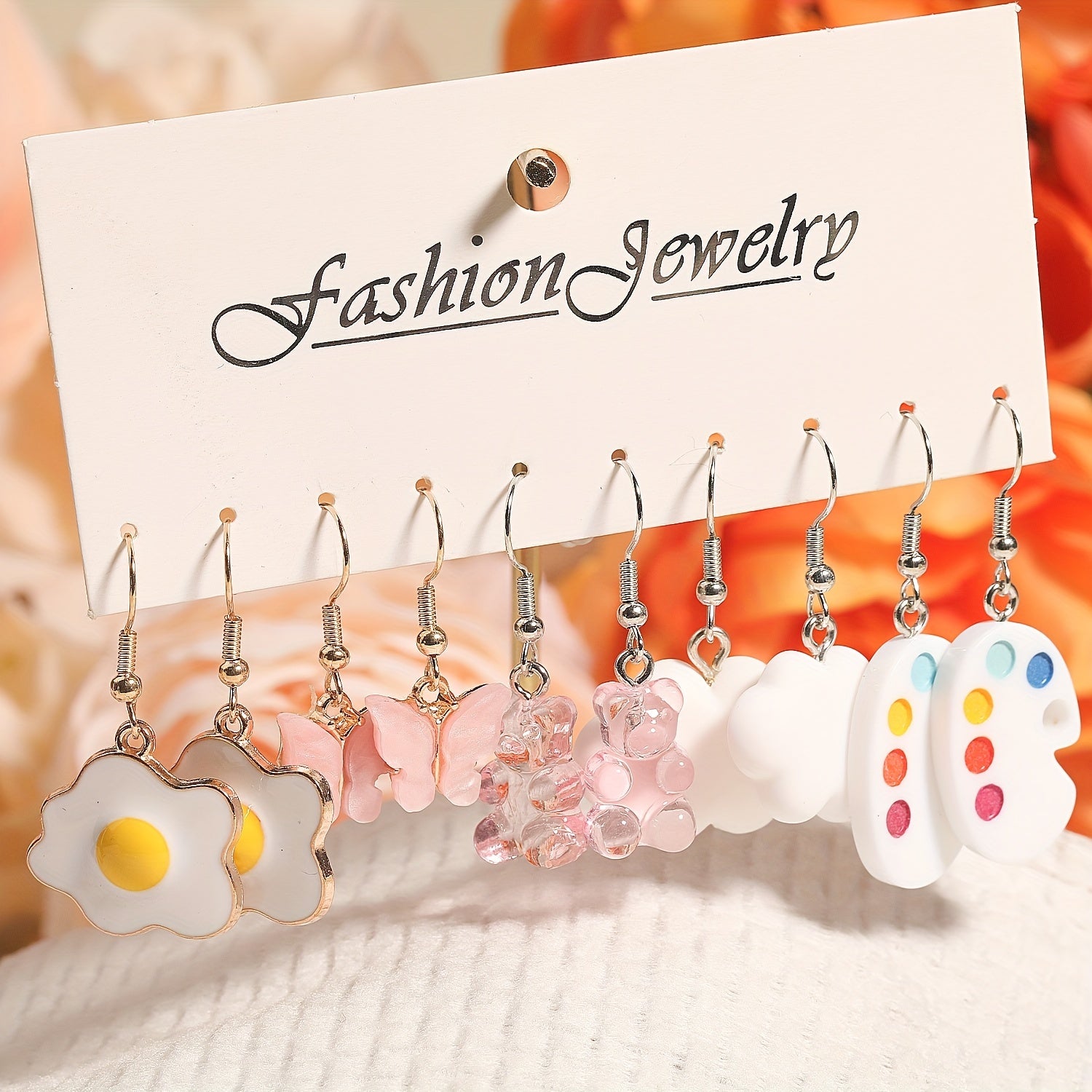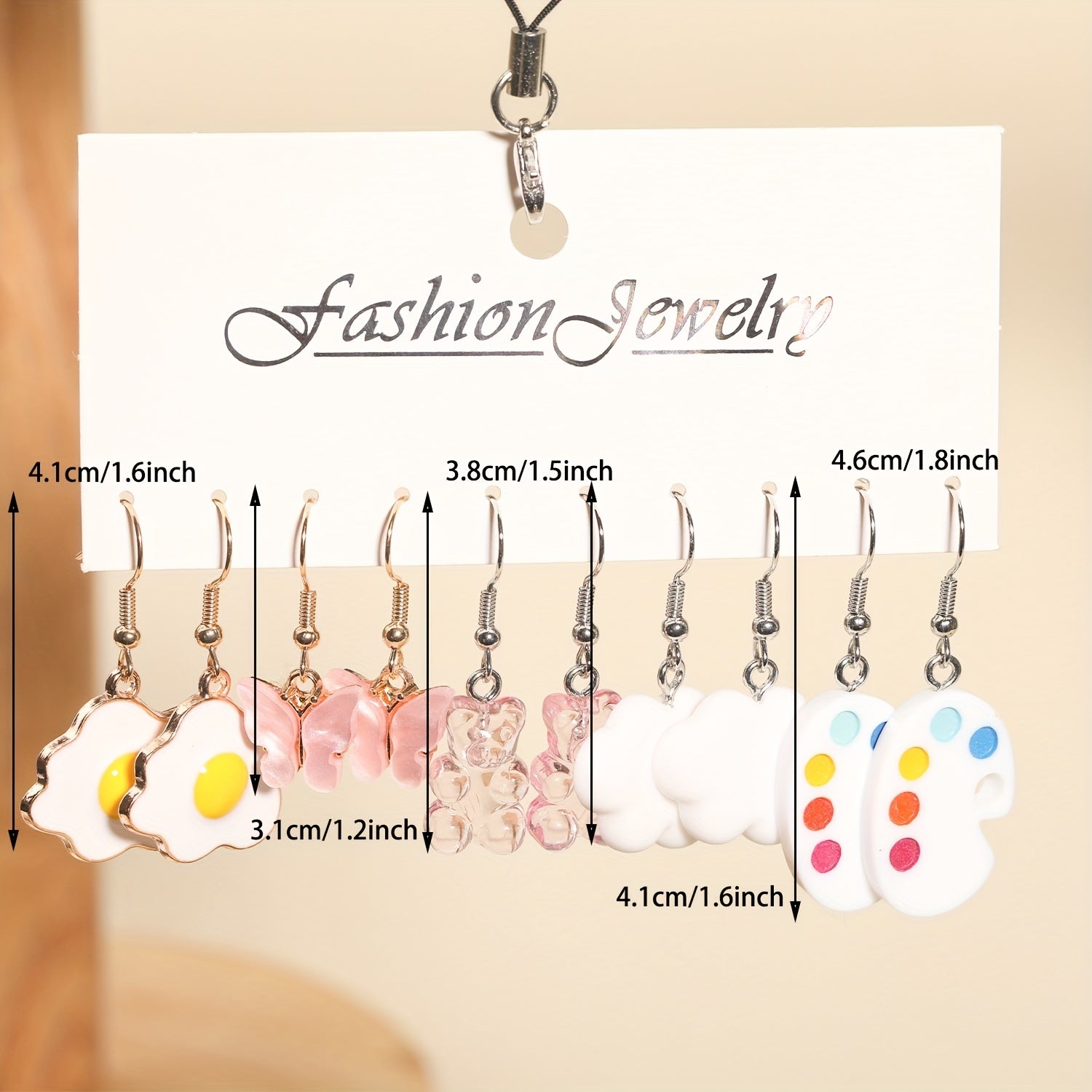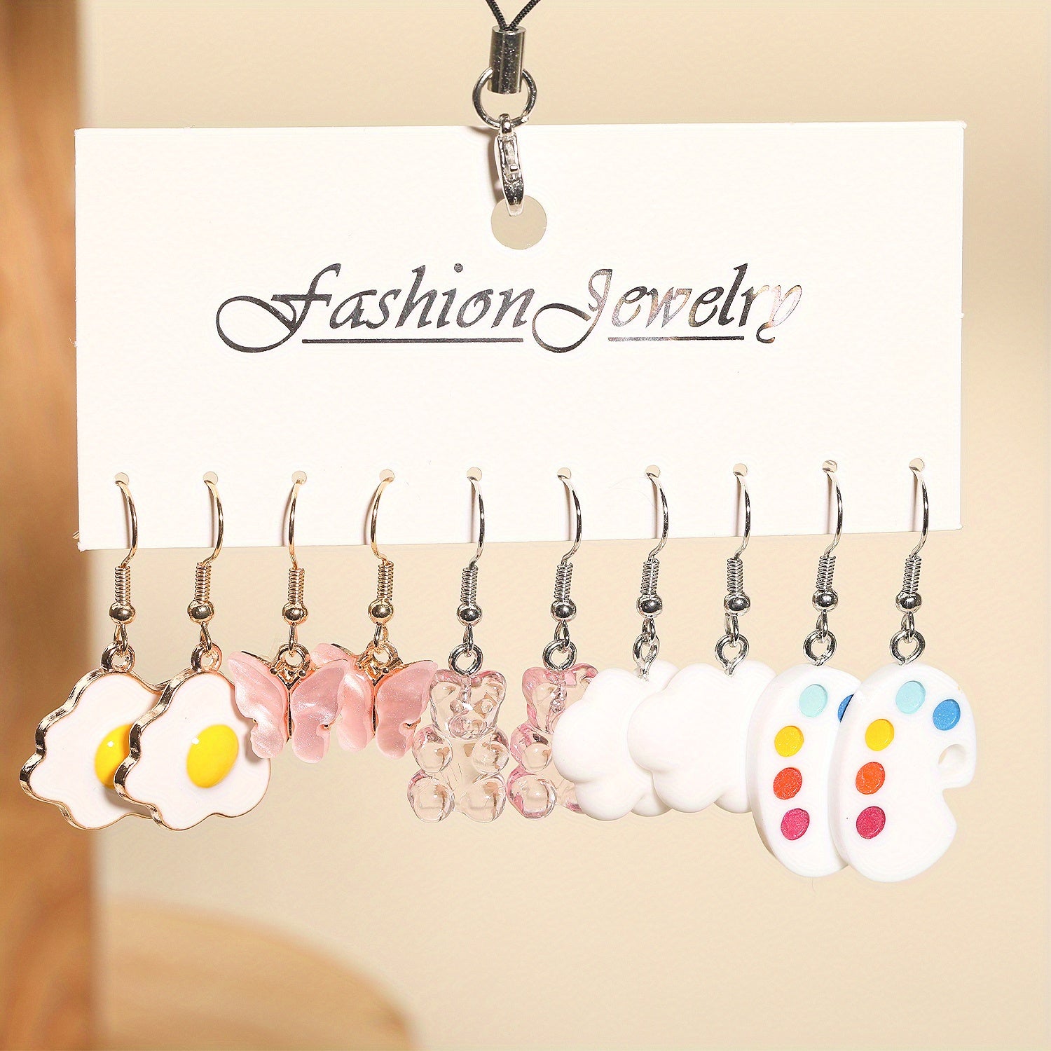 Get this set of 5 pairs of Y2K style resin dangle earrings featuring egg, butterfly, bear, and cloud designs. A perfect gift for females.
