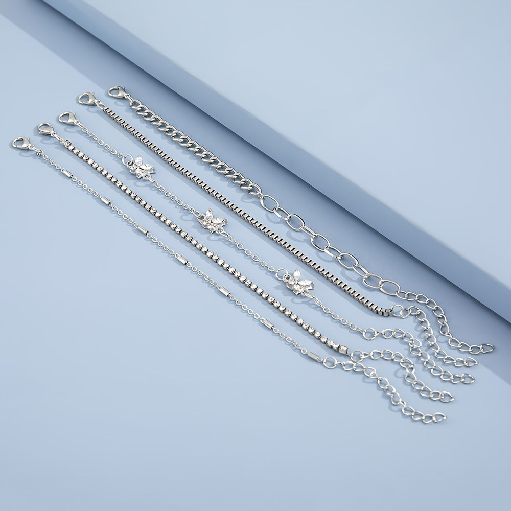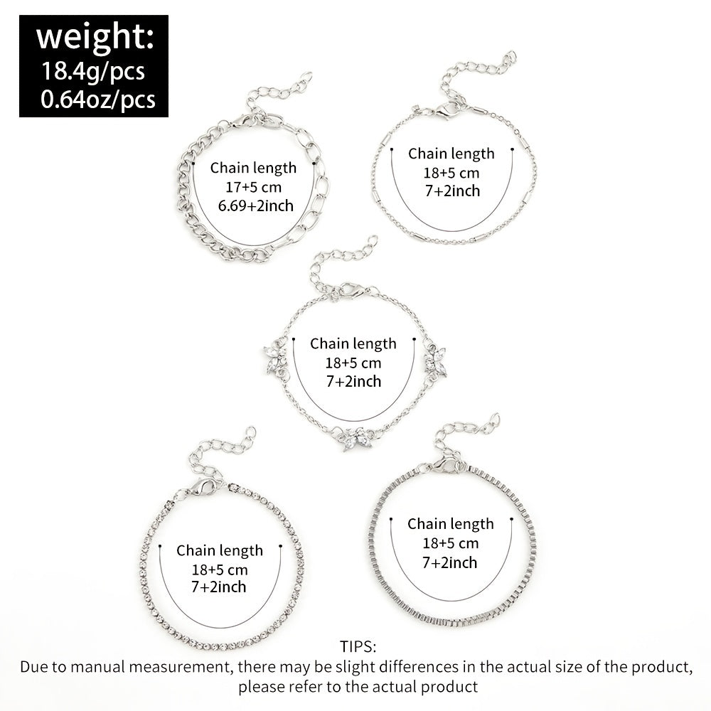 This set includes 5 chain bracelets with inlaid zircon stones, perfect for adding a touch of elegance to your outfit. The adjustable design ensures a comfortable fit for women and girls.