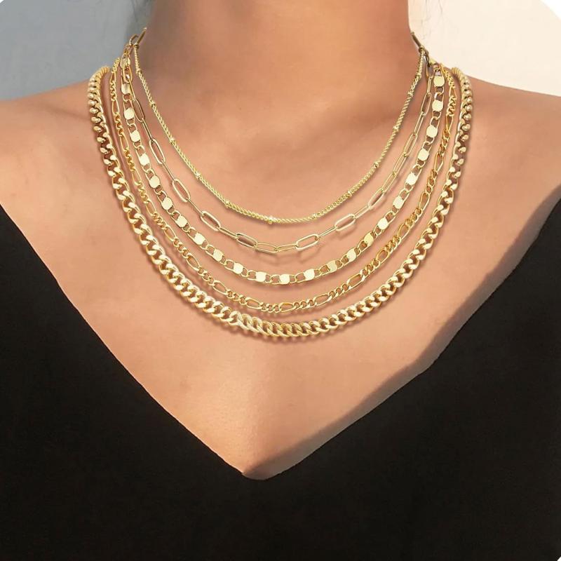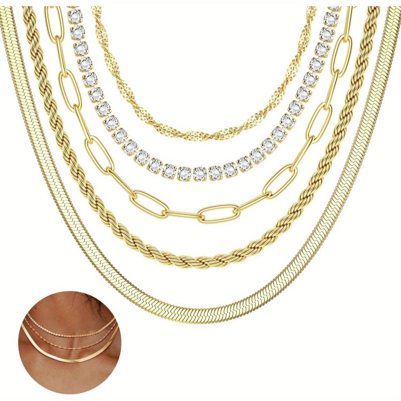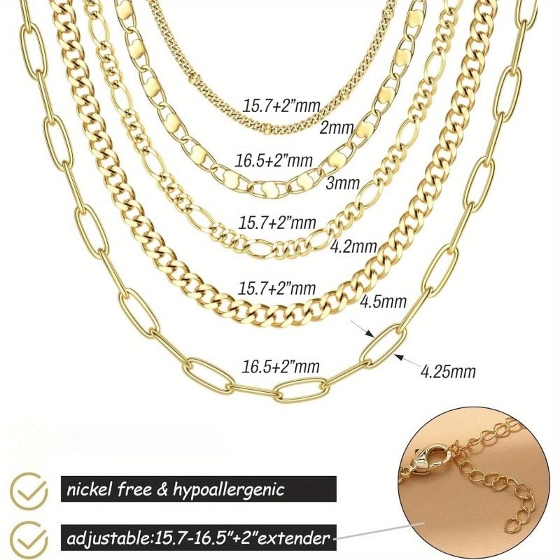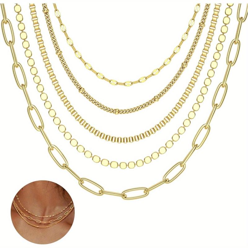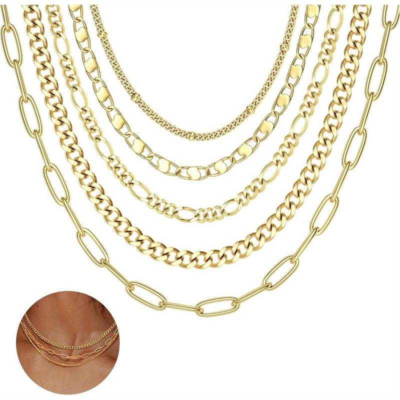 Elevate your style with this set of 5 golden plated layered necklaces. Made from high-quality stainless steel, featuring a paper clip, Cuban chain, and snake design for a trendy look.