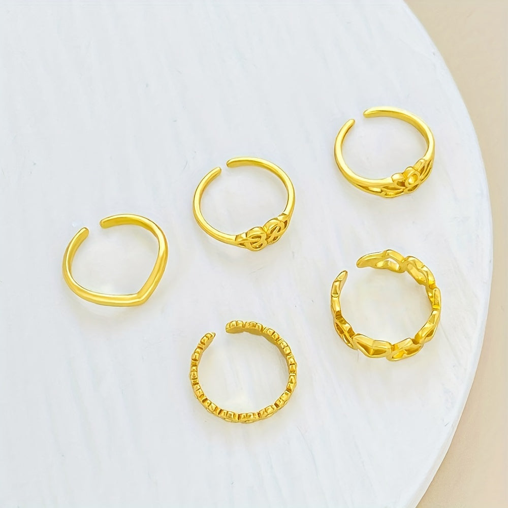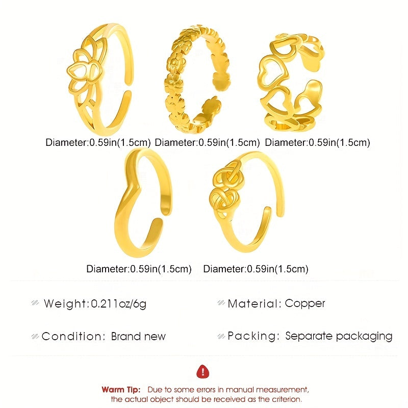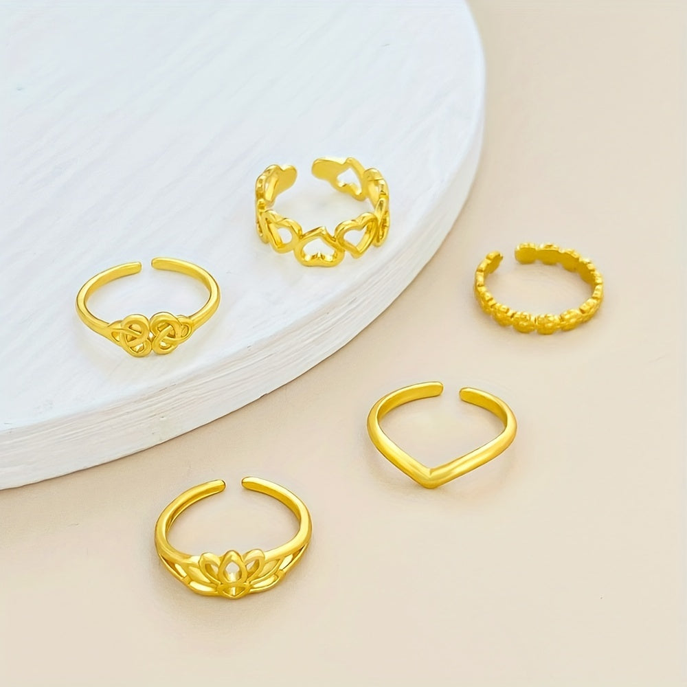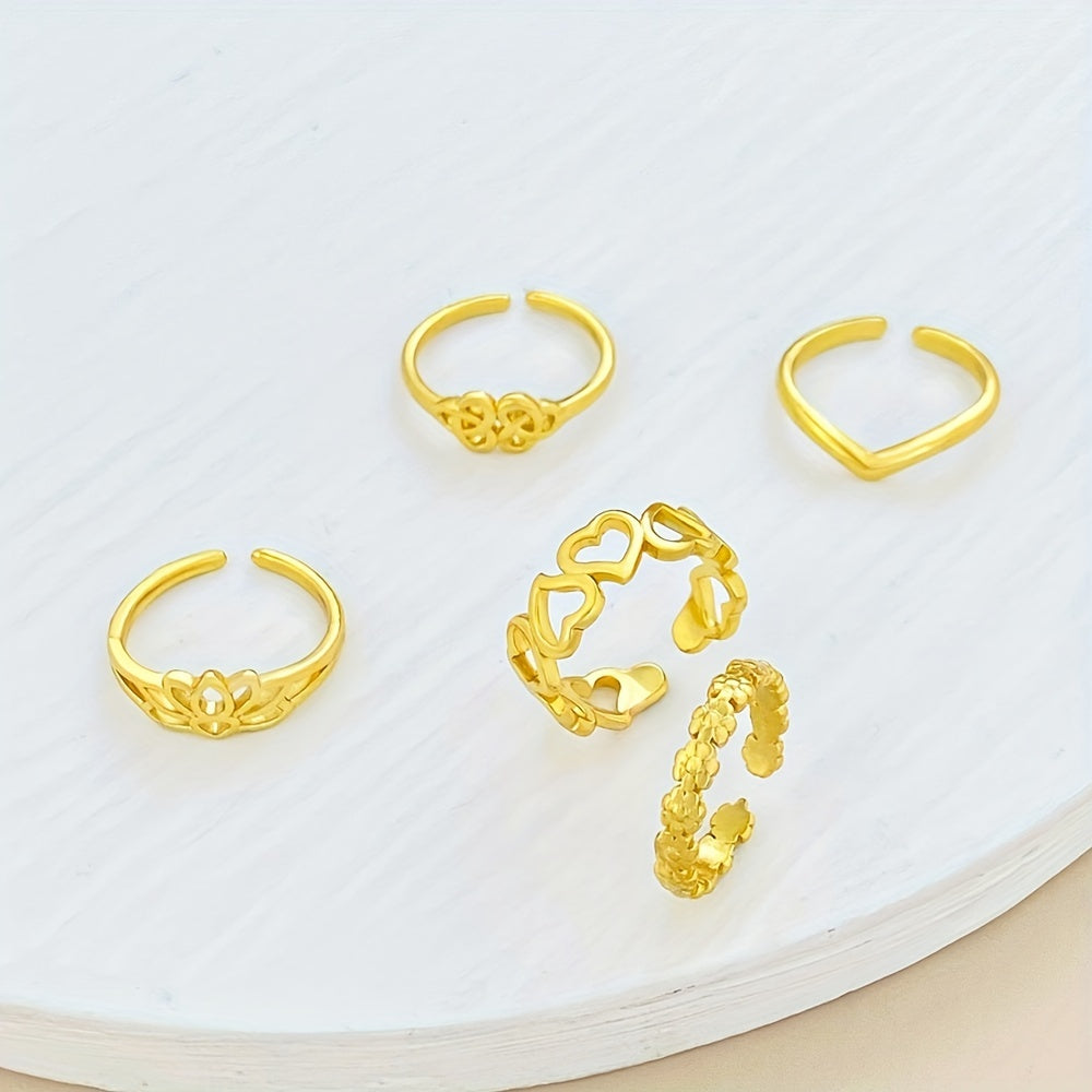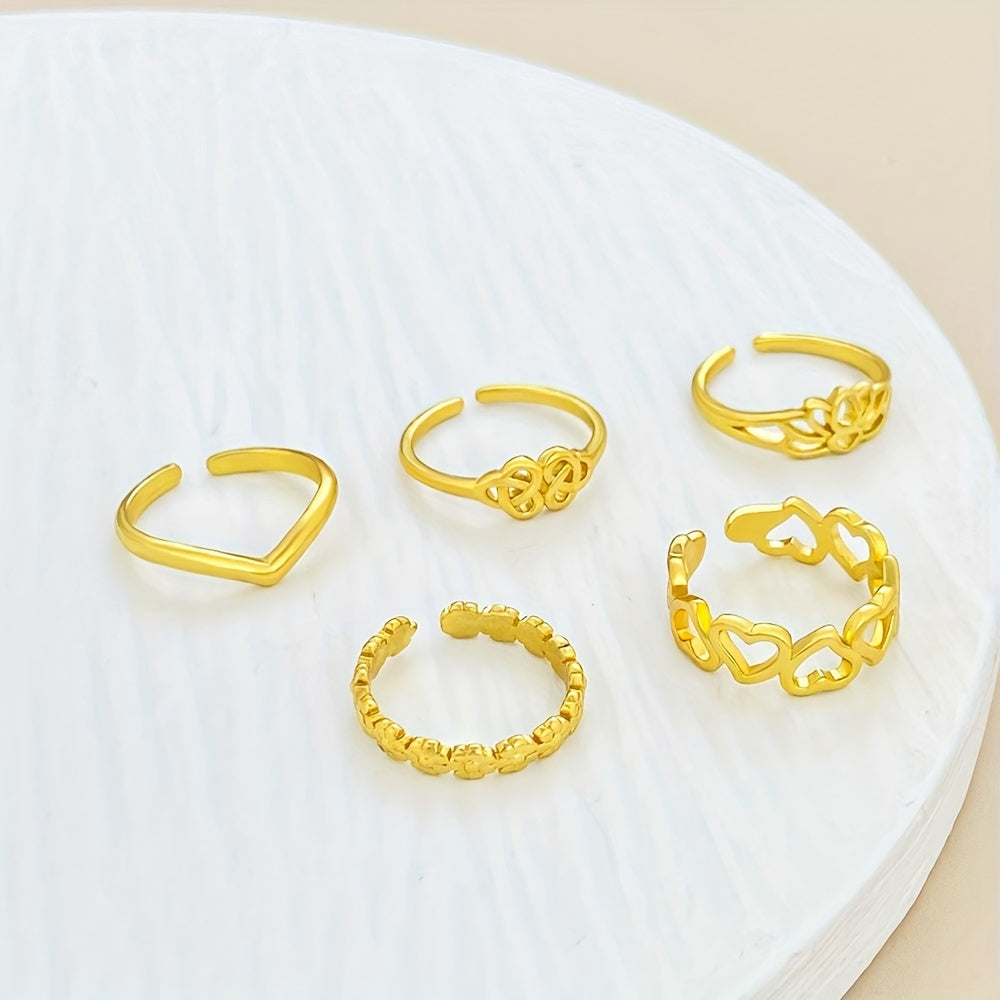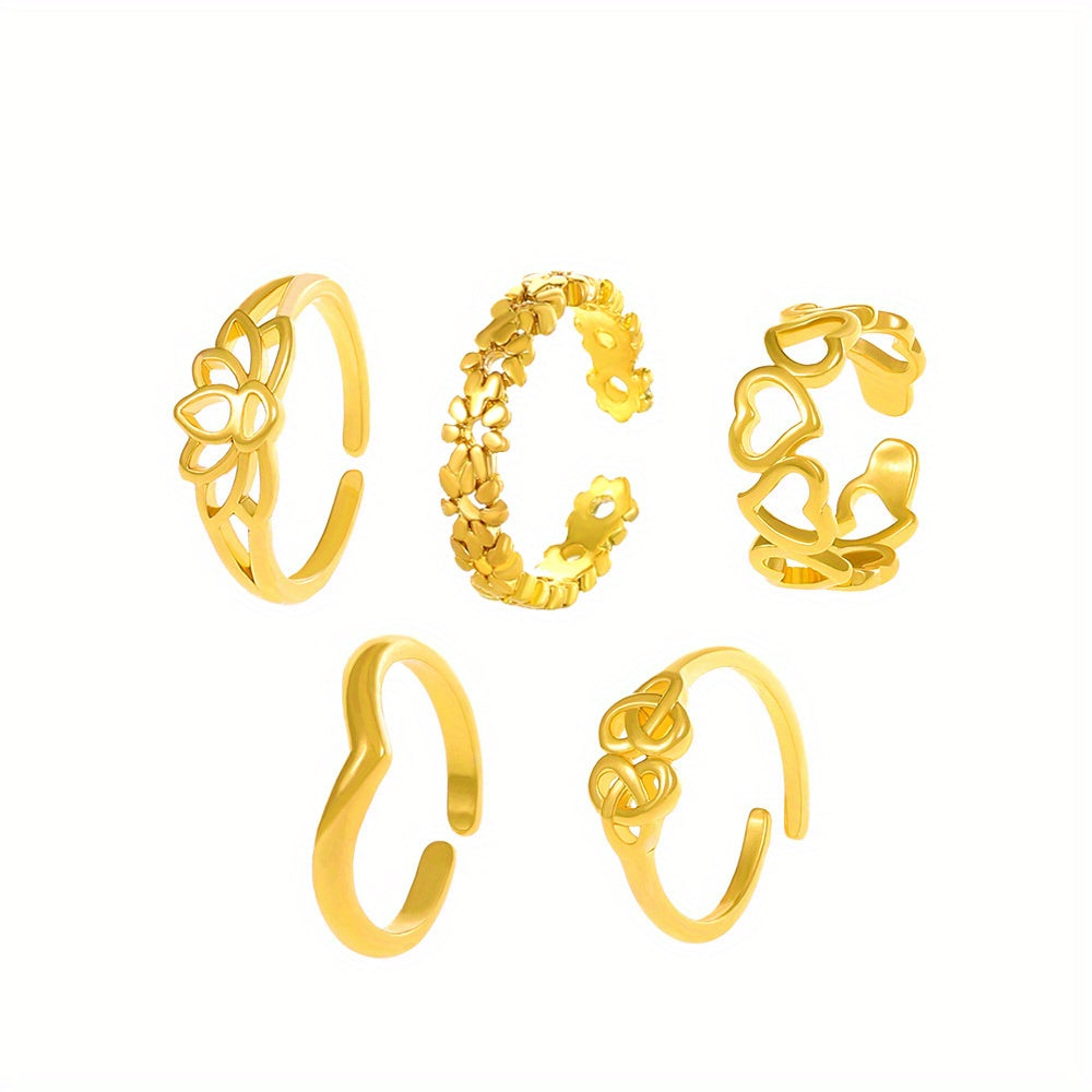Enhance your beach look with this set of 5 flower foot rings featuring a hollow carved heart shape design. Adjustable toe rings for a perfect fit.