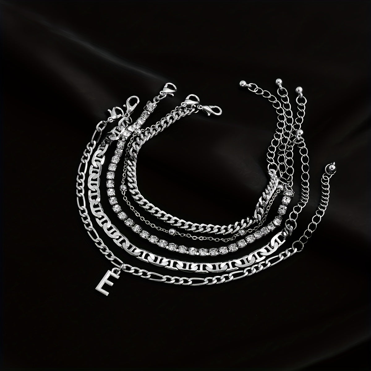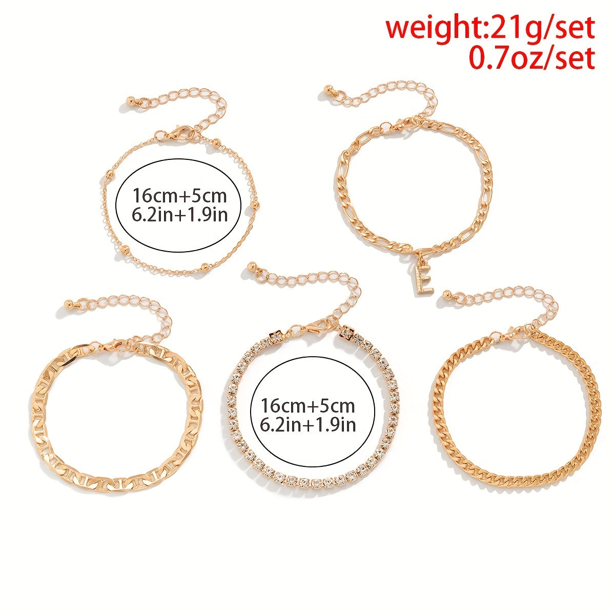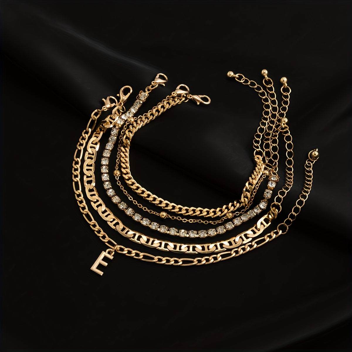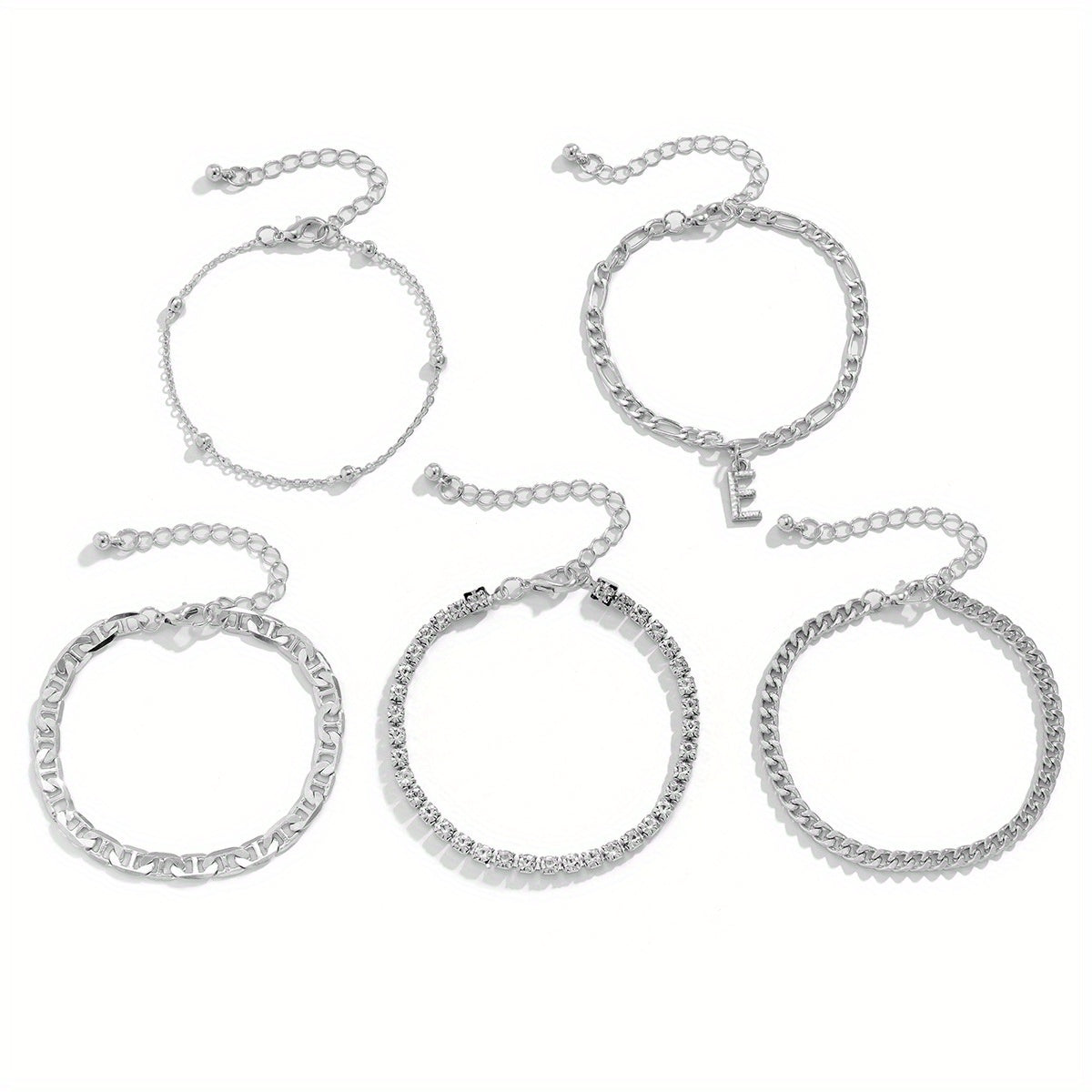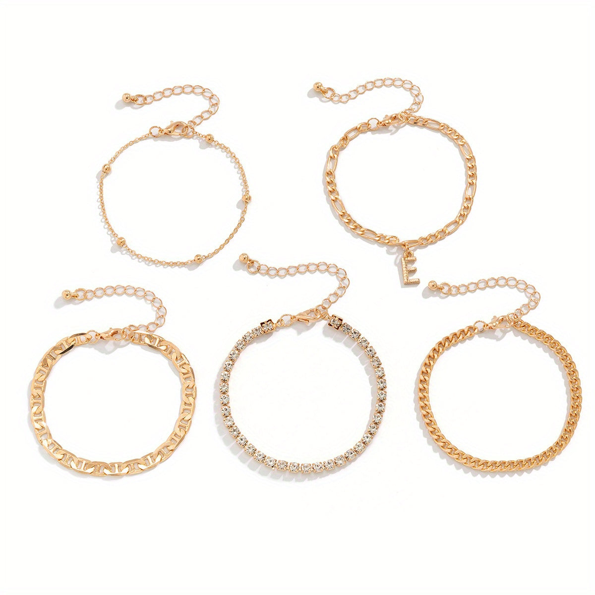 This set includes 5 stacked multilayer letter bracelets with a vintage feel. The design features a geometric hollow pattern and shimmering rhinestones. A trendy piece perfect for any occasion.